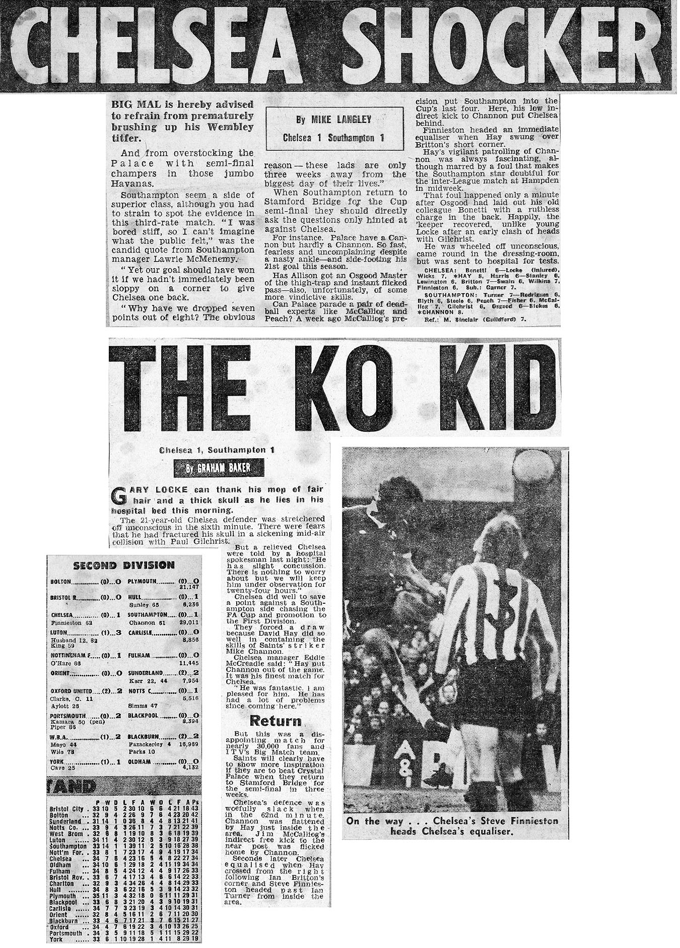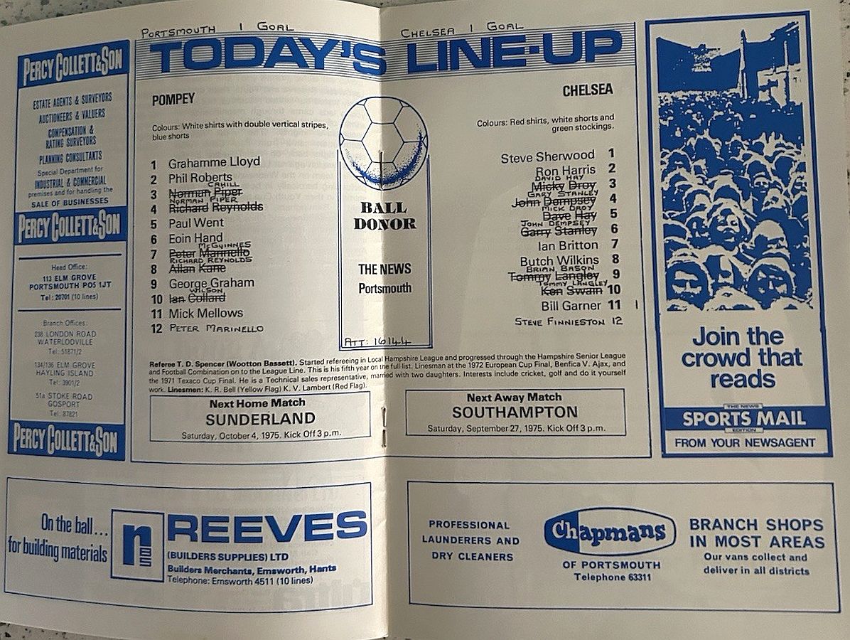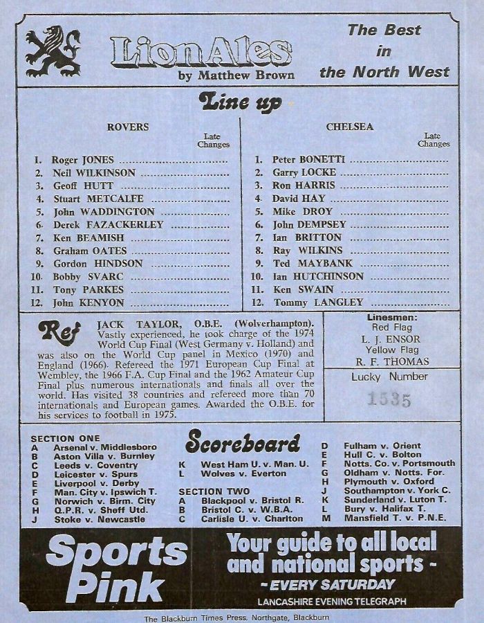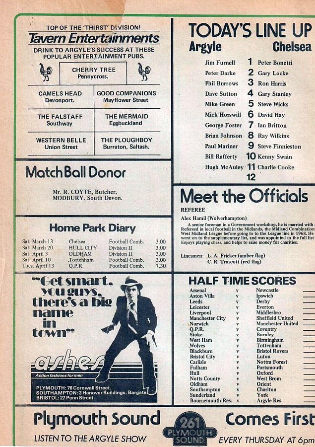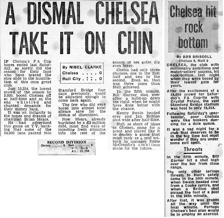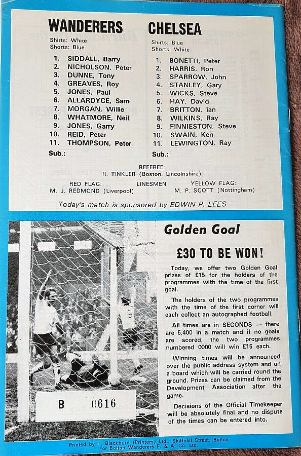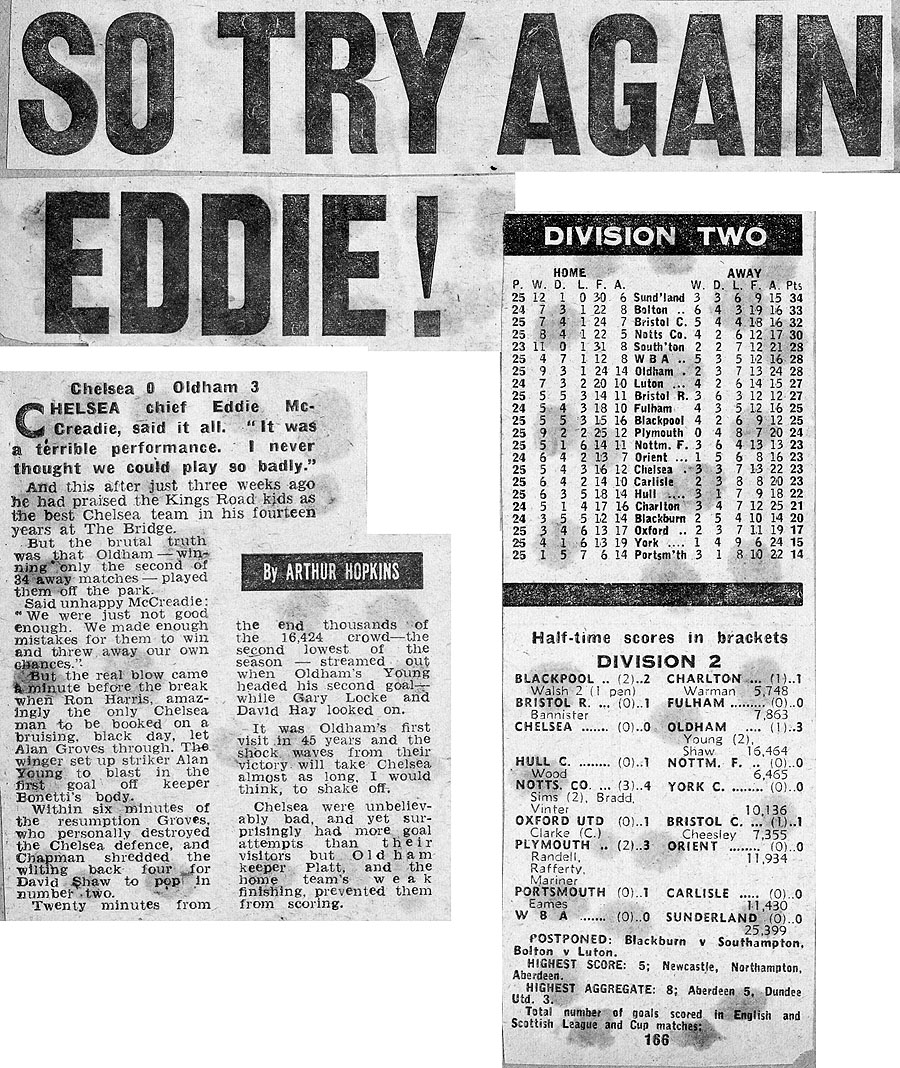 1 Peter Bonetti, 2 Gary Locke (12 Bill Garner 6), 3 Ron Harris, 4 Garry Stanley, 5 Steve Wicks, 6 David Hay, 7 Ian Britton, 8 Ray Wilkins, 9 Steve Finnieston, 10 Ken Swain, 11 Ray Lewington |