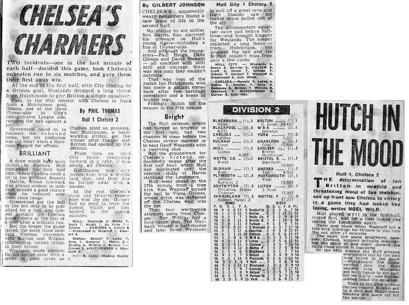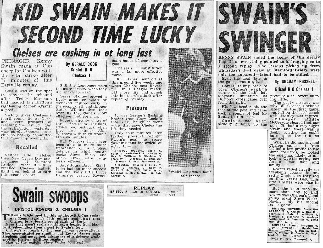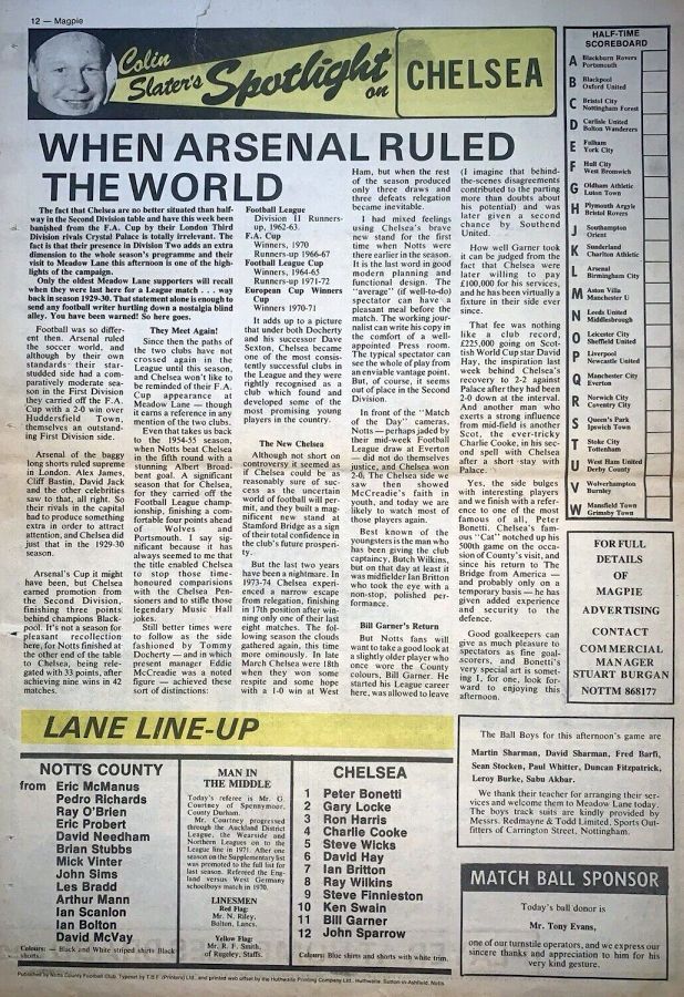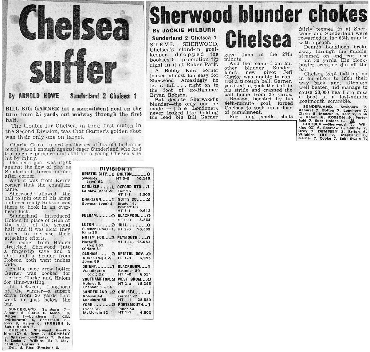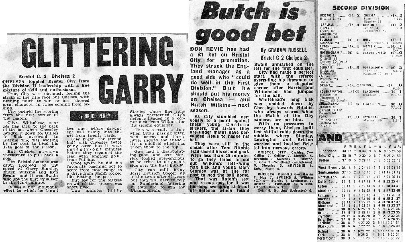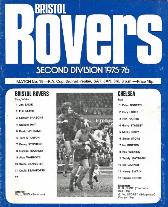 1 Peter Bonetti, 2 Gary Locke (12 Bill Garner 6), 3 Ron Harris, 4 Garry Stanley, 5 Steve Wicks, 6 David Hay, 7 Ian Britton, 8 Ray Wilkins, 9 Steve Finnieston, 10 Ken Swain, 11 Ray Lewington |