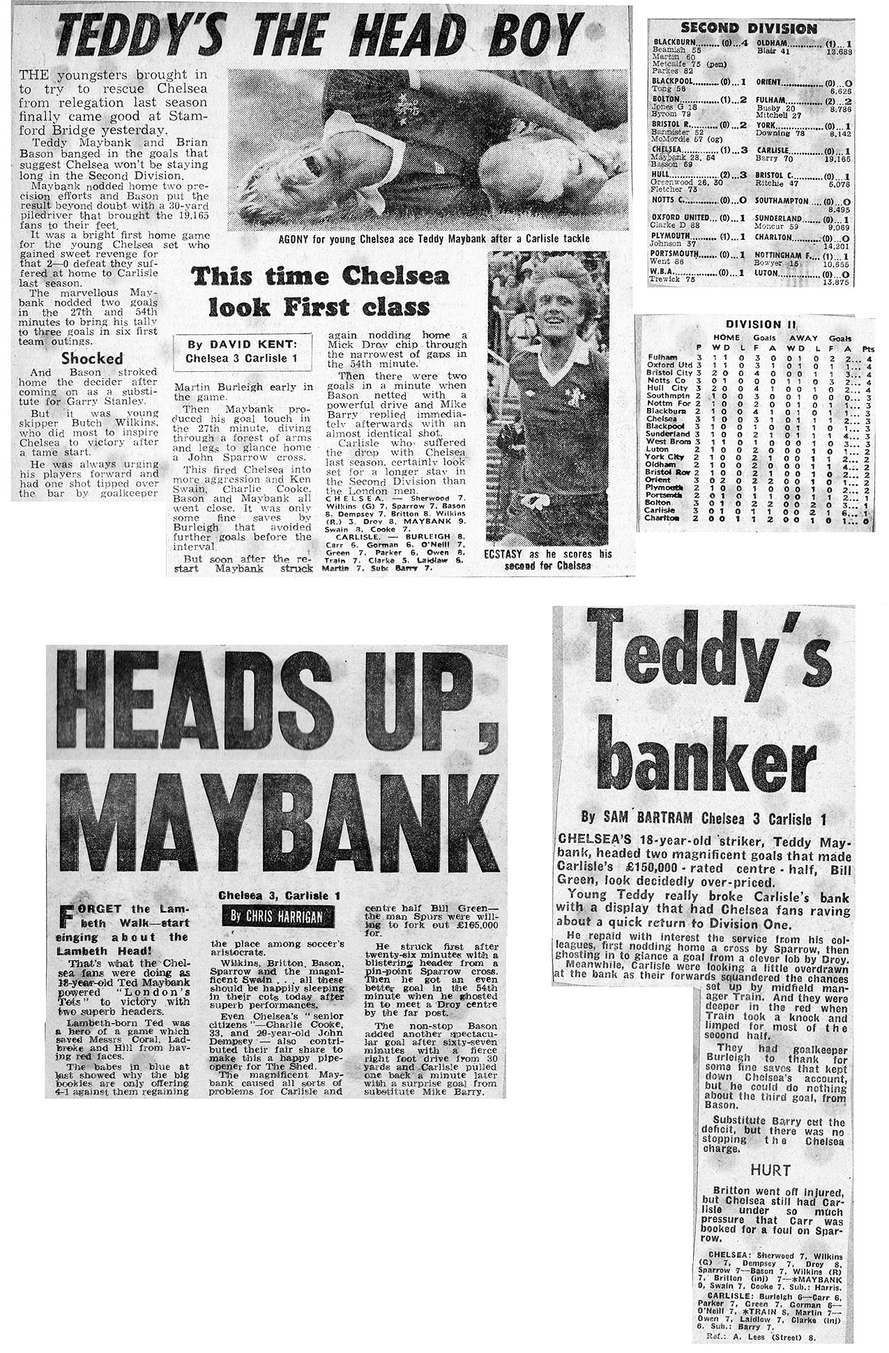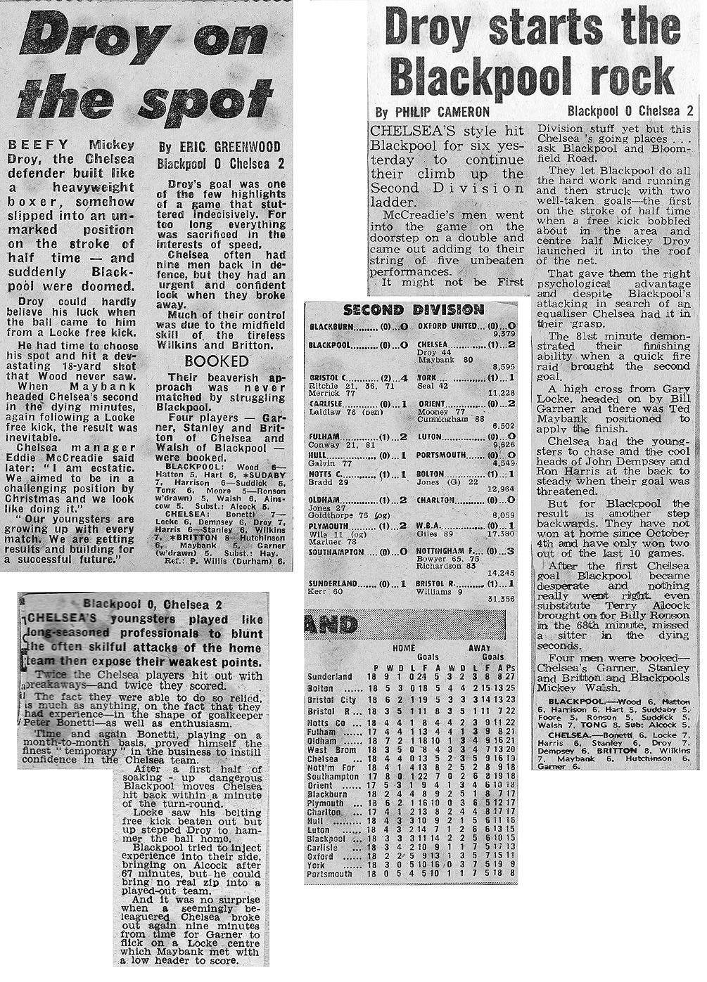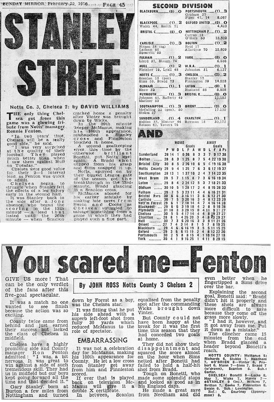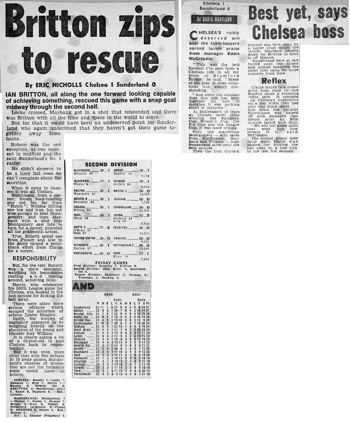 1 Peter Bonetti, 2 Gary Locke (12 Bill Garner 6), 3 Ron Harris, 4 Garry Stanley, 5 Steve Wicks, 6 David Hay, 7 Ian Britton, 8 Ray Wilkins, 9 Steve Finnieston, 10 Ken Swain, 11 Ray Lewington |