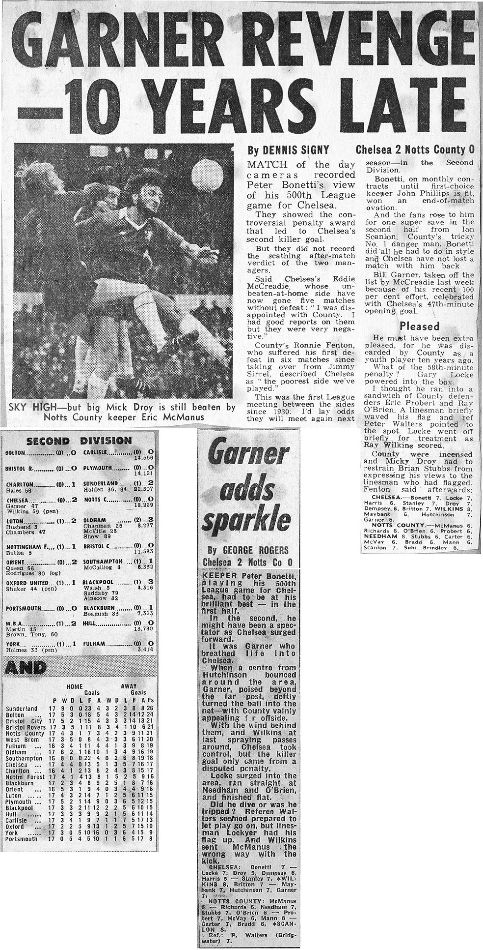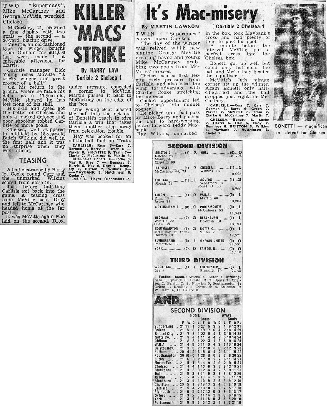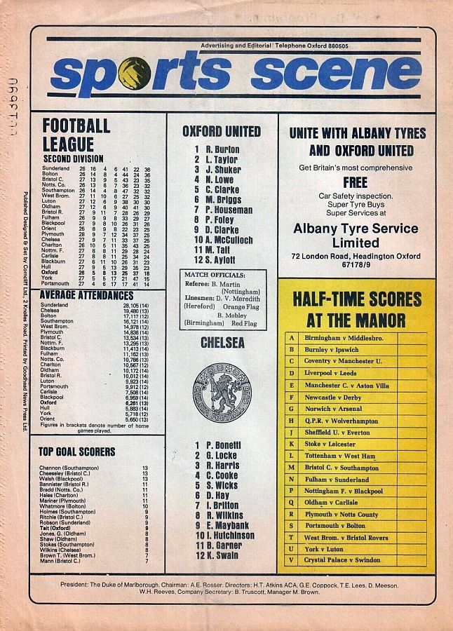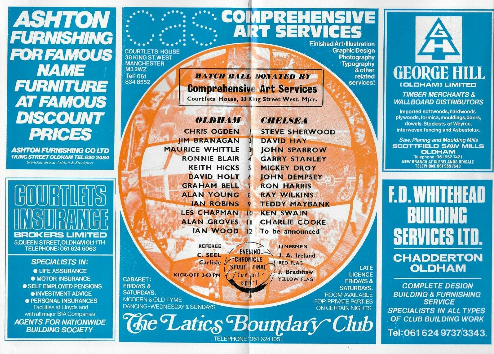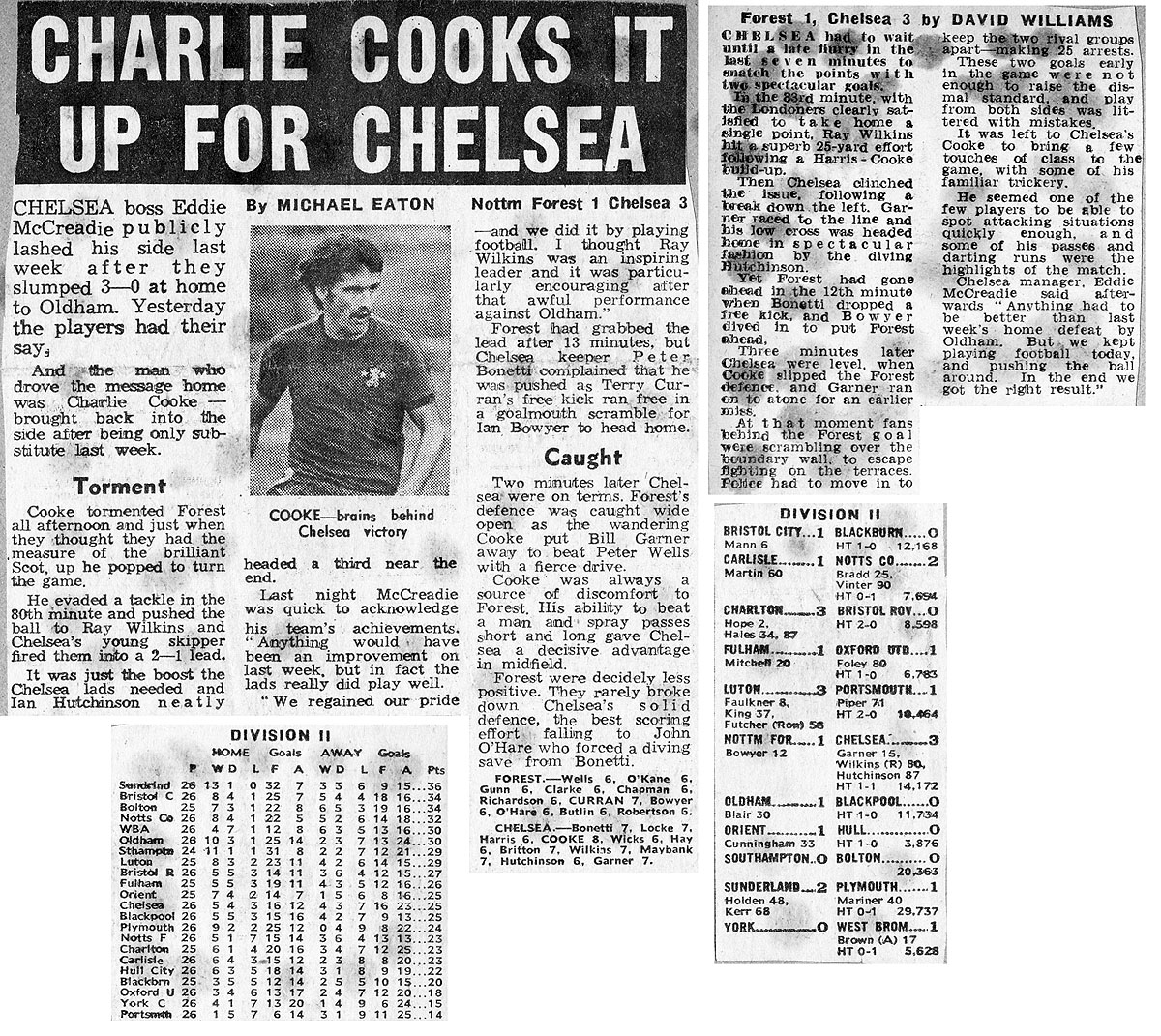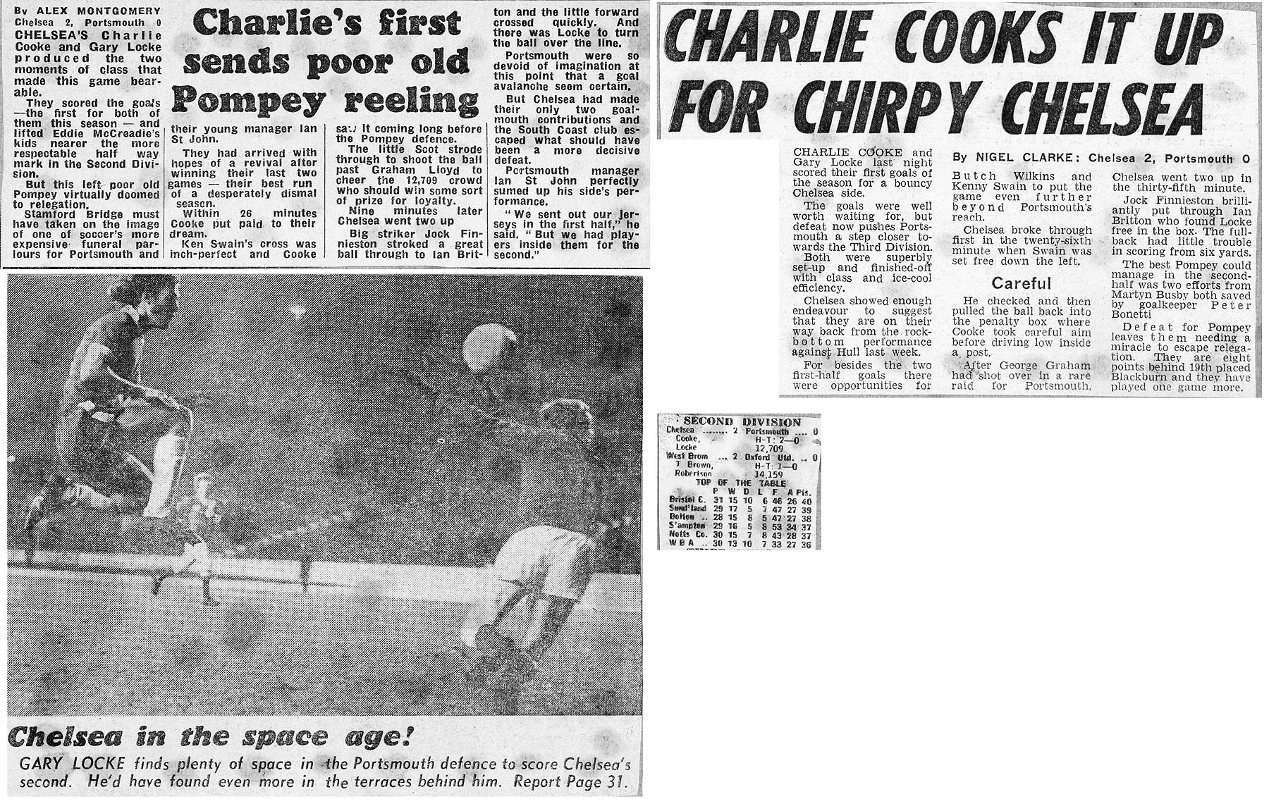 1 Peter Bonetti, 2 Gary Locke (12 Bill Garner 6), 3 Ron Harris, 4 Garry Stanley, 5 Steve Wicks, 6 David Hay, 7 Ian Britton, 8 Ray Wilkins, 9 Steve Finnieston, 10 Ken Swain, 11 Ray Lewington |
