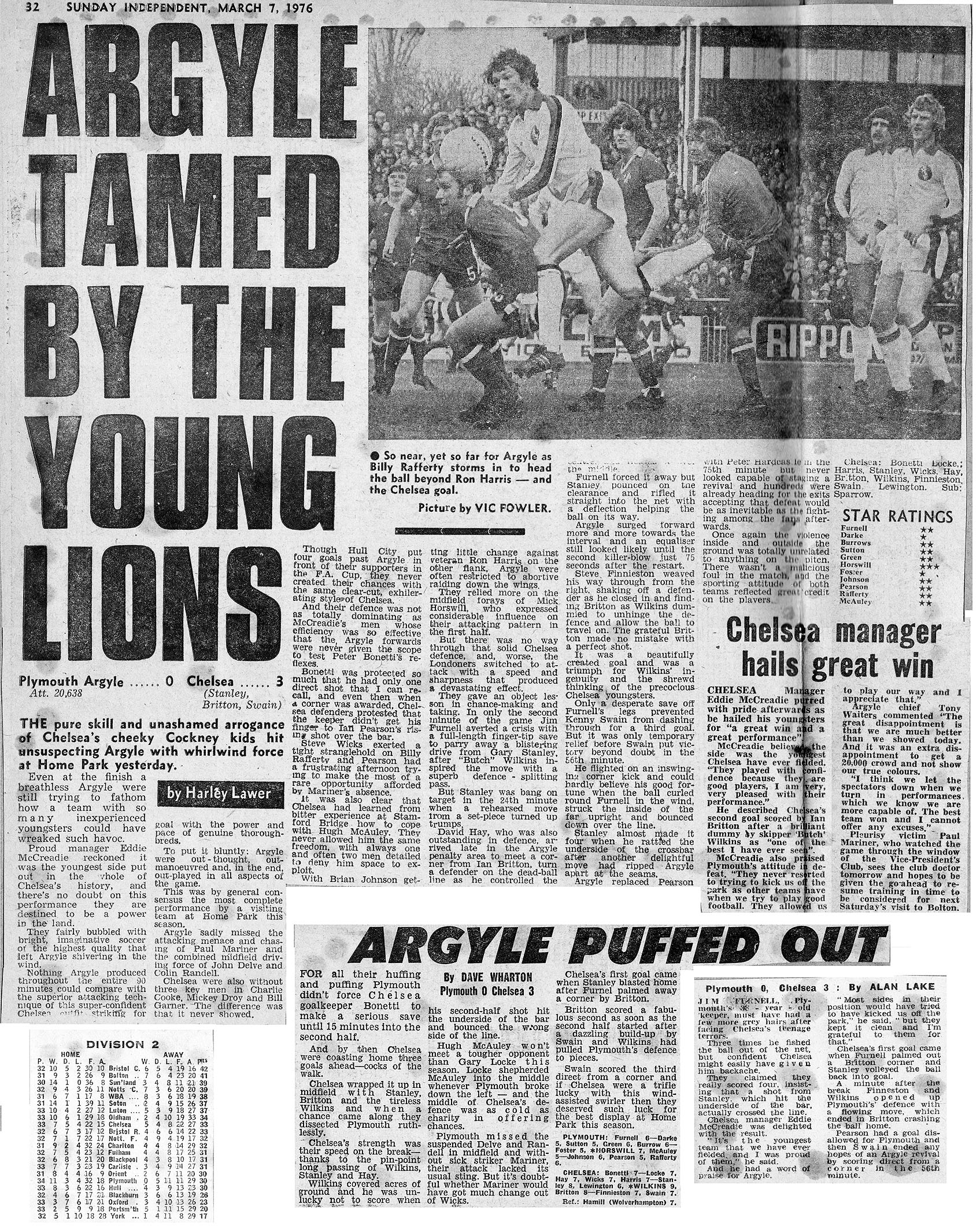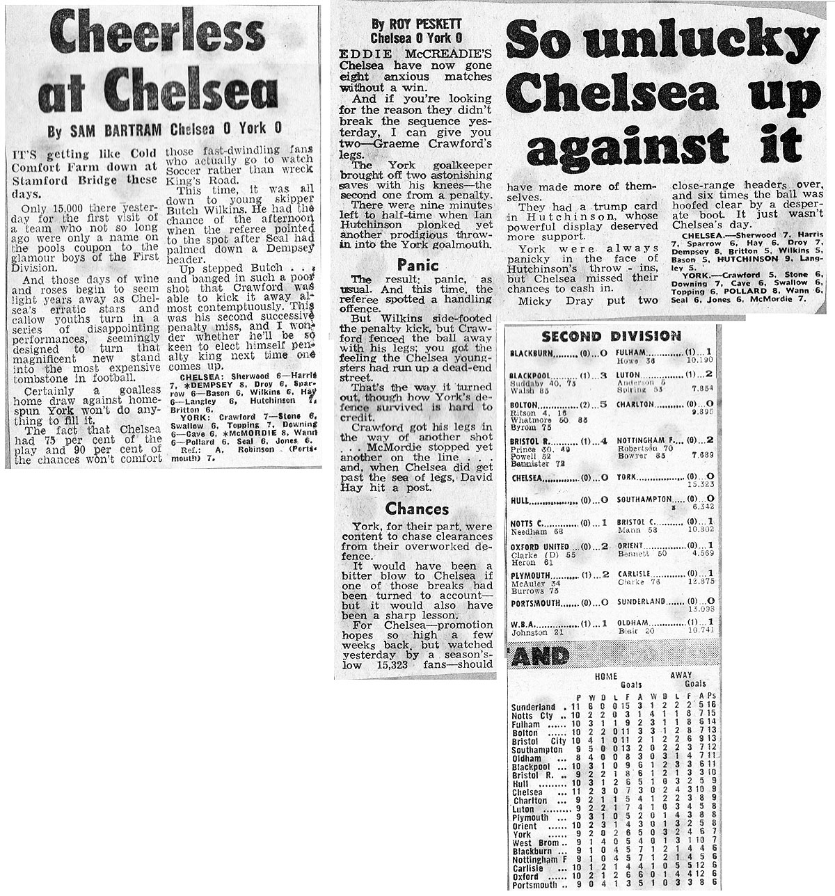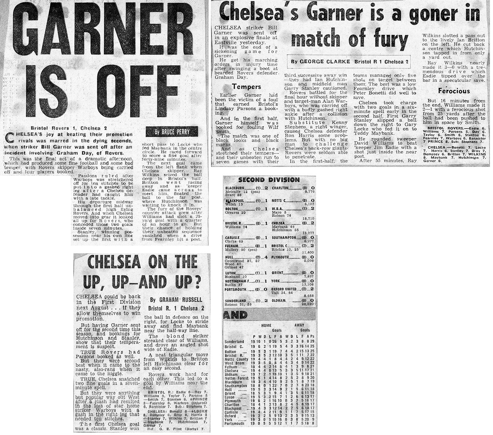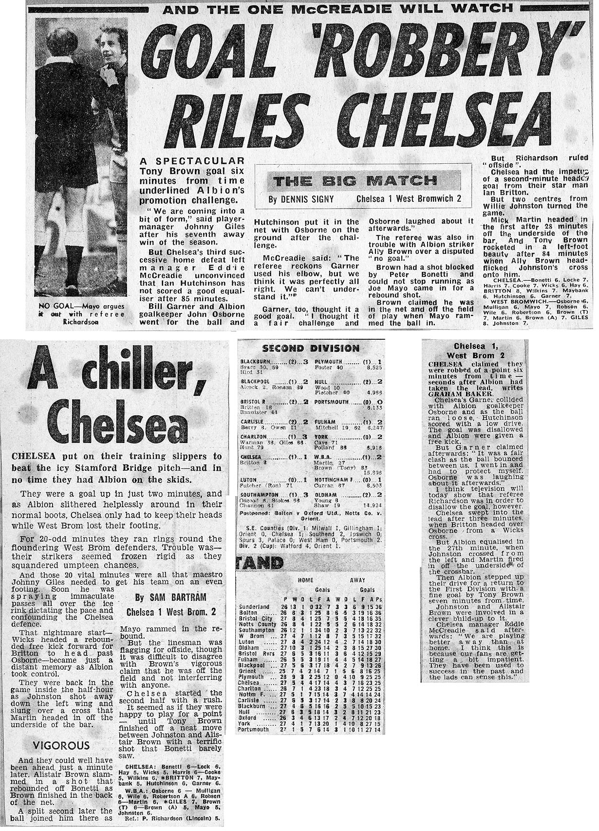 1 Peter Bonetti, 2 Gary Locke (12 Bill Garner 6), 3 Ron Harris, 4 Garry Stanley, 5 Steve Wicks, 6 David Hay, 7 Ian Britton, 8 Ray Wilkins, 9 Steve Finnieston, 10 Ken Swain, 11 Ray Lewington |