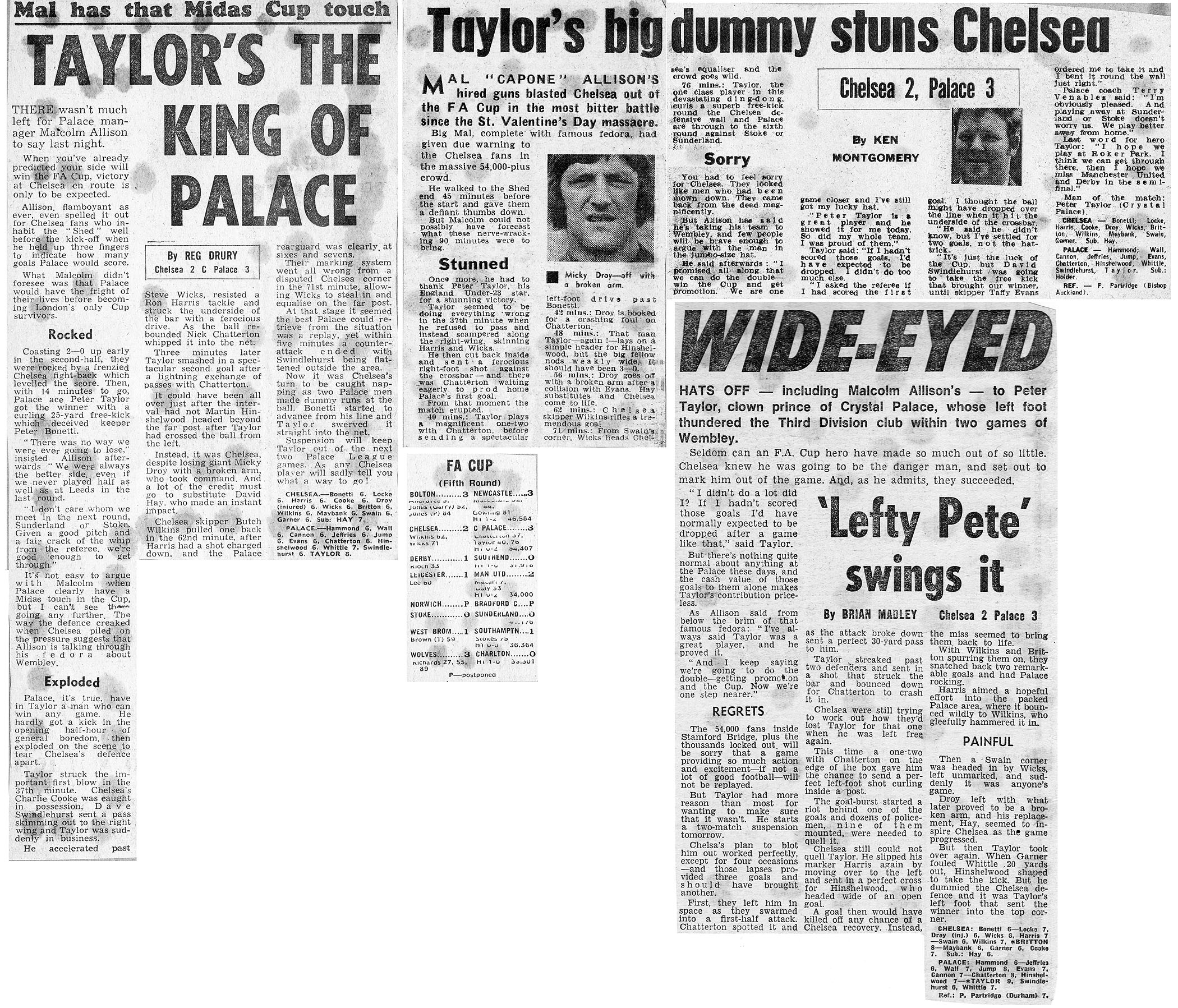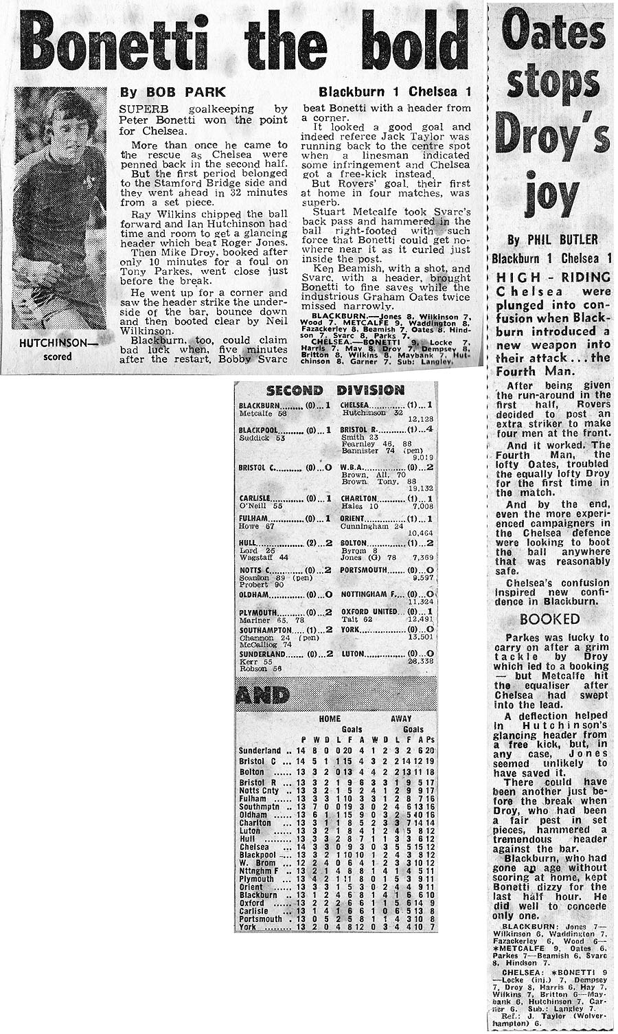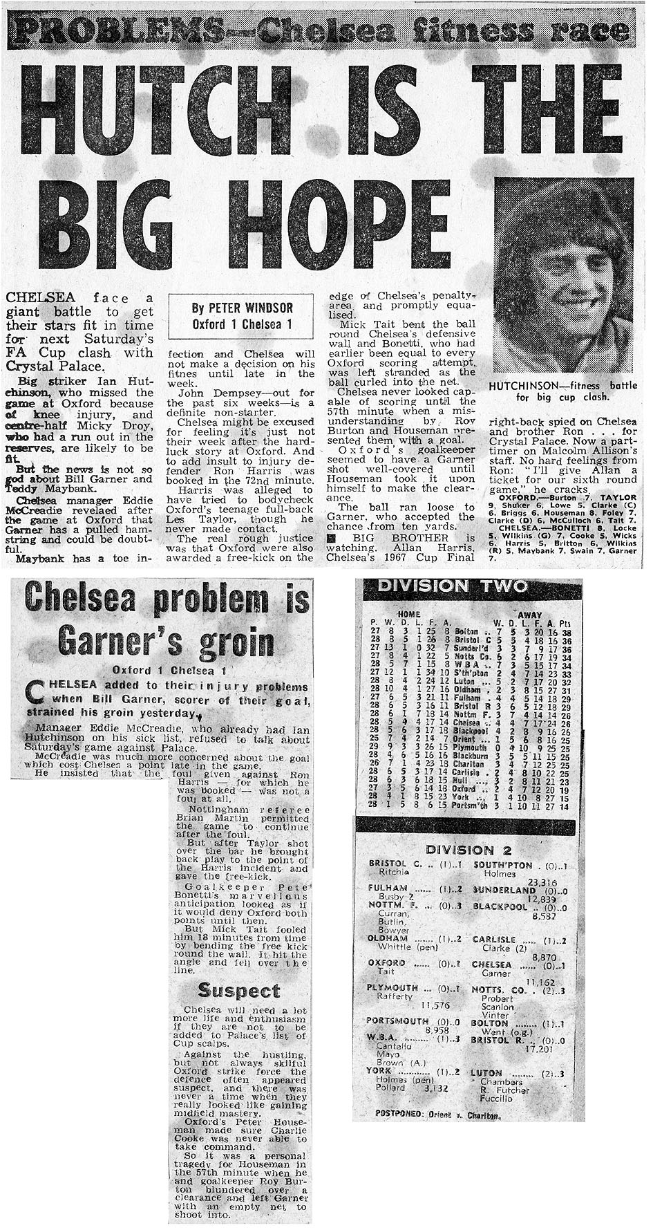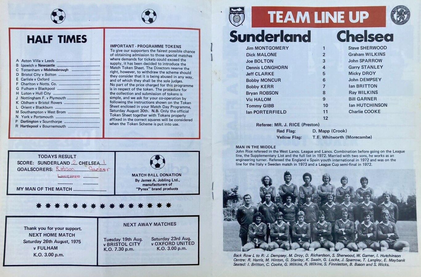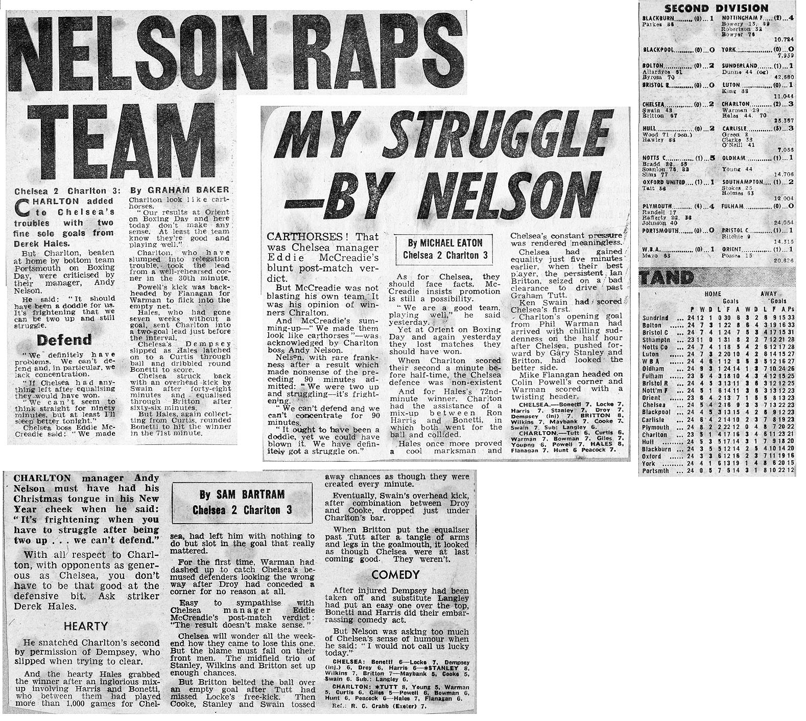 1 Peter Bonetti, 2 Gary Locke (12 Bill Garner 6), 3 Ron Harris, 4 Garry Stanley, 5 Steve Wicks, 6 David Hay, 7 Ian Britton, 8 Ray Wilkins, 9 Steve Finnieston, 10 Ken Swain, 11 Ray Lewington |