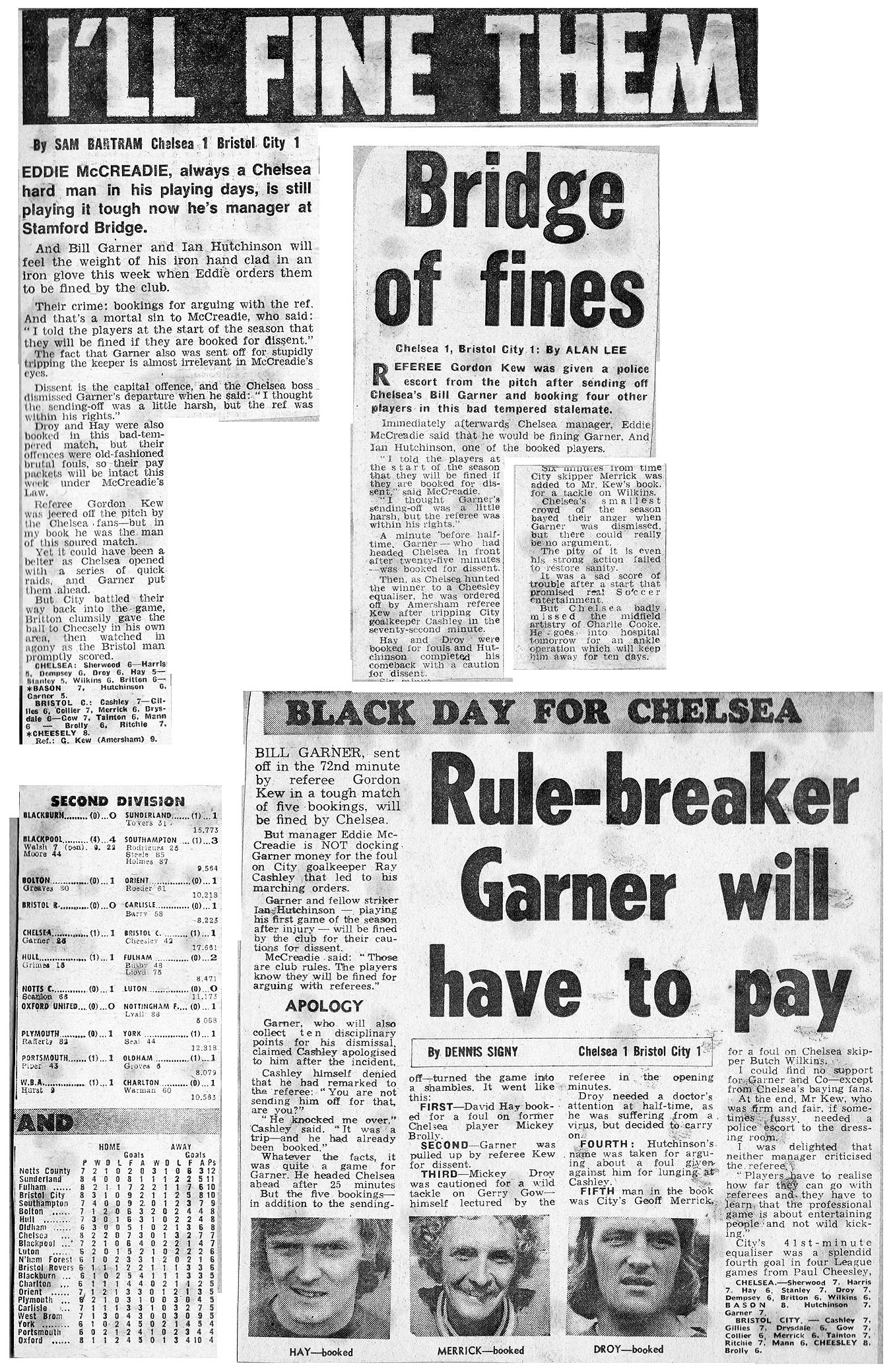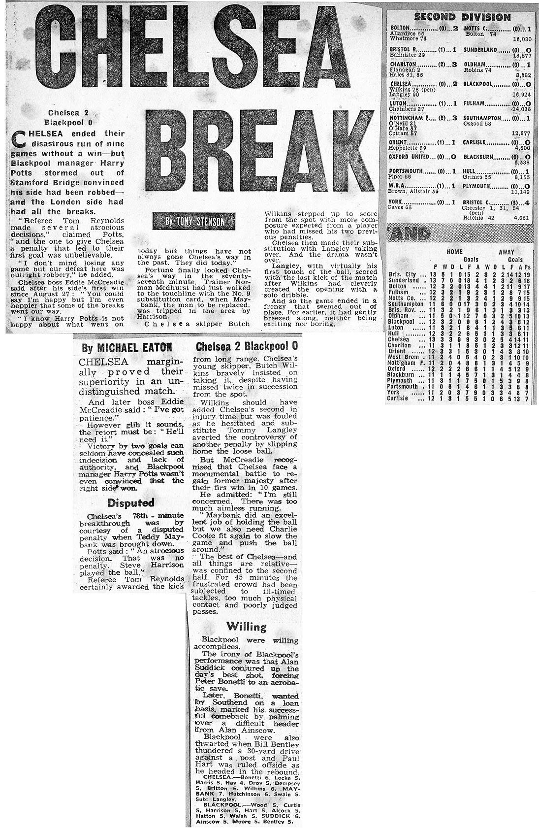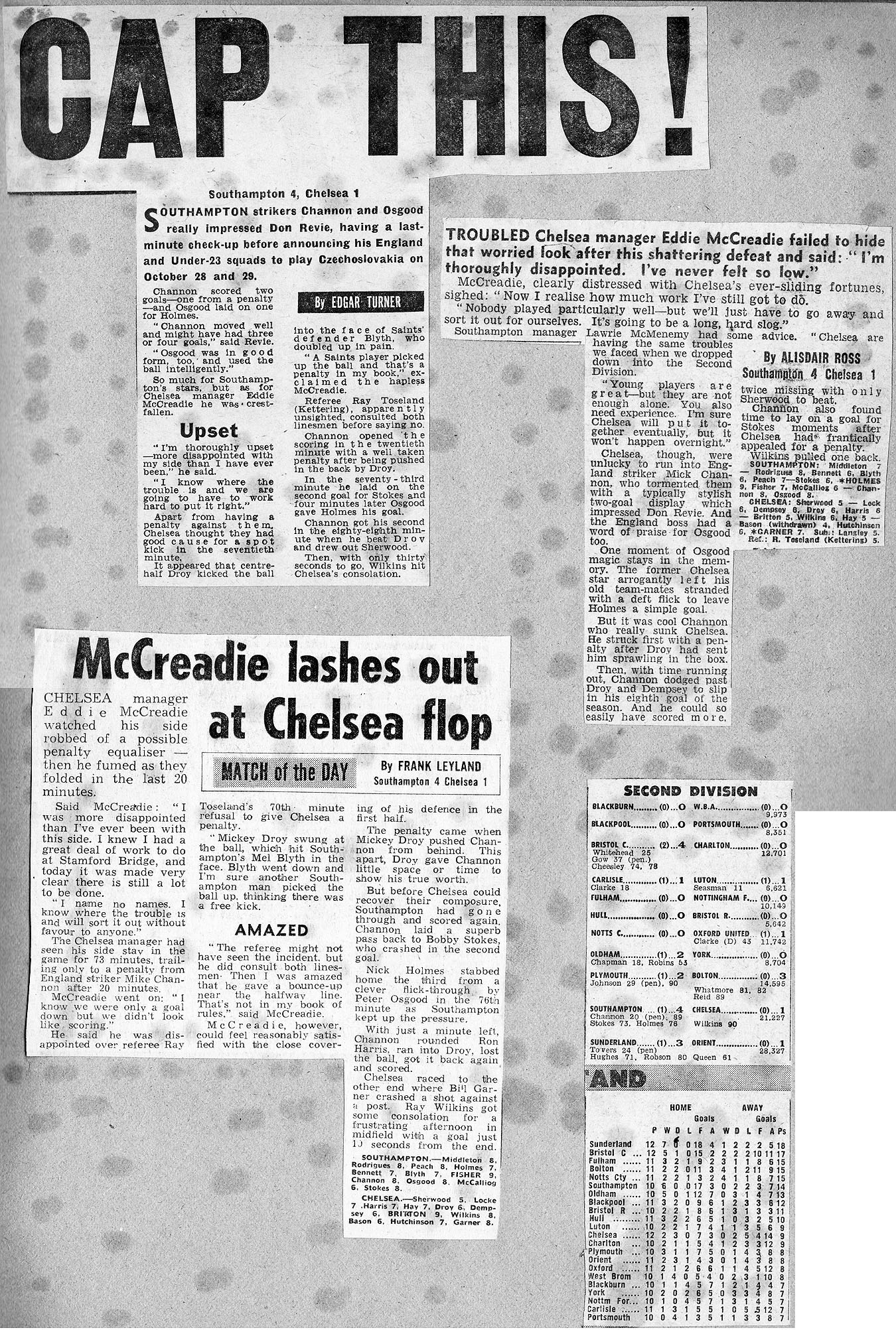 Turner, Rodrigues, Peach, Gilchrist, Blyth, Steele, Fisher, Channon, Osgood, McCalliog, Stokes |