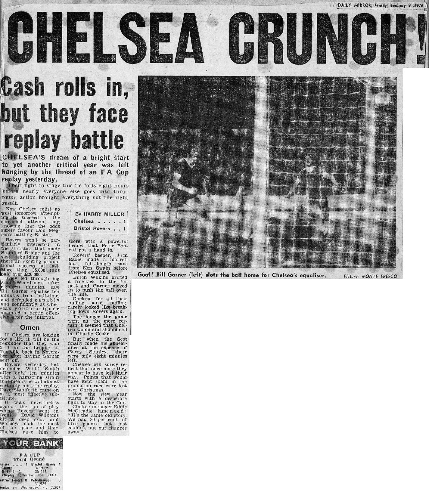 1 Peter Bonetti, 2 Gary Locke, 3 Ron Harris, 4 Garry Stanley, 5 Steve Wicks, 6 David Hay, 7 Ian Britton, 8 Ray Wilkins (12 Tommy Langley 80), 9 Steve Finnieston, 10 Ken Swain, 11 Charlie Cooke |