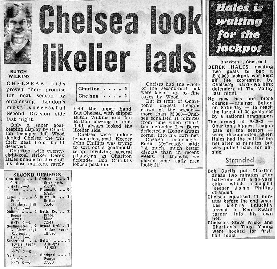 1 Peter Bonetti (12 Bill Garner 40), 2 Ron Harris, 3 Graham Wilkins, 4 Garry Stanley, 5 Steve Wicks, 6 David Hay, 7 Ian Britton, 8 Ray Wilkins, 9 Steve Finnieston, 10 Ken Swain, 11 Ray Lewington |