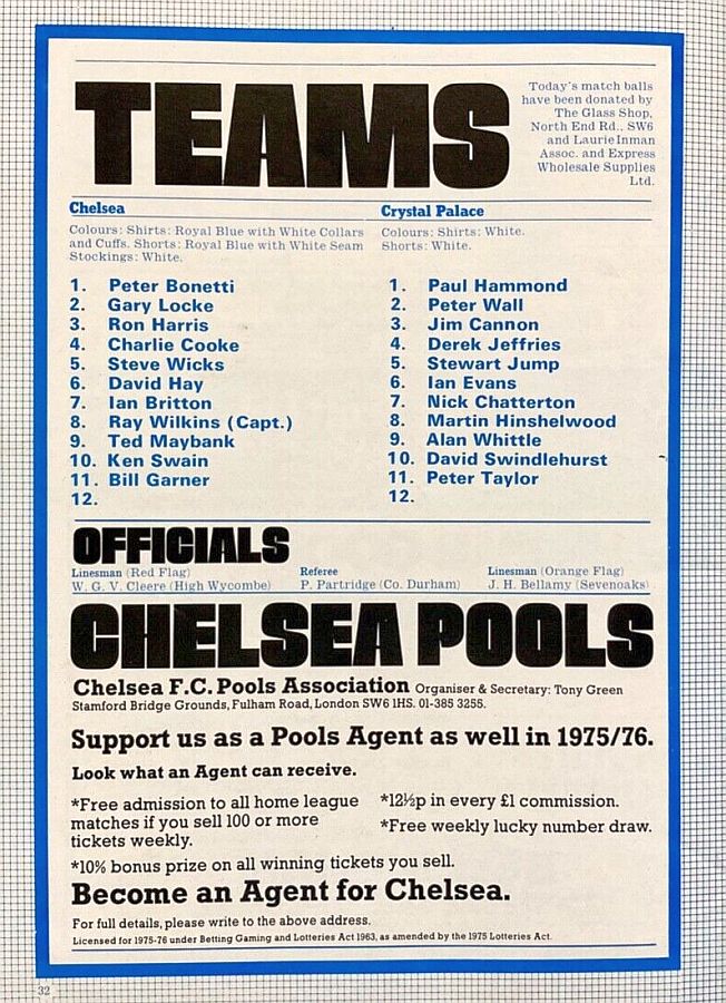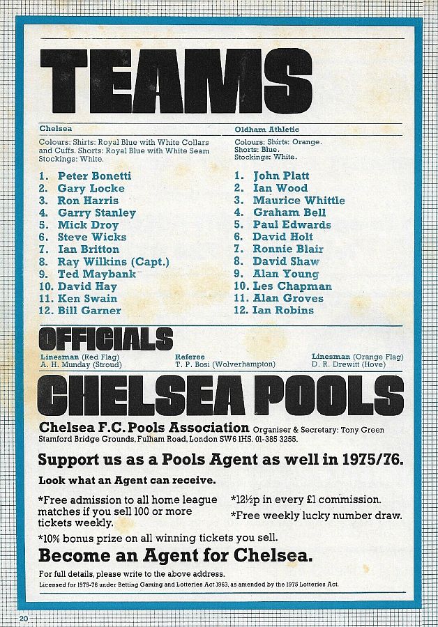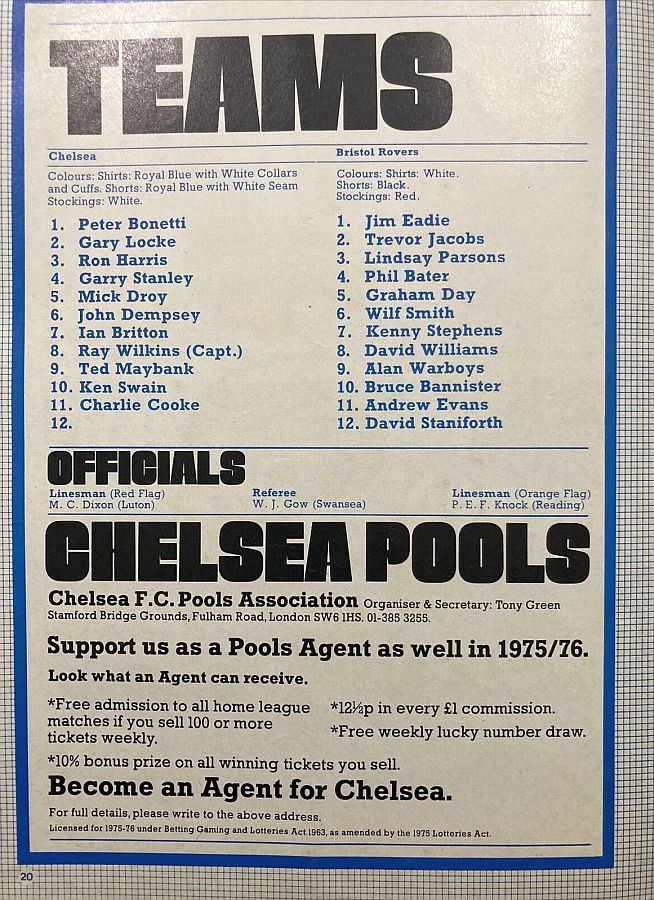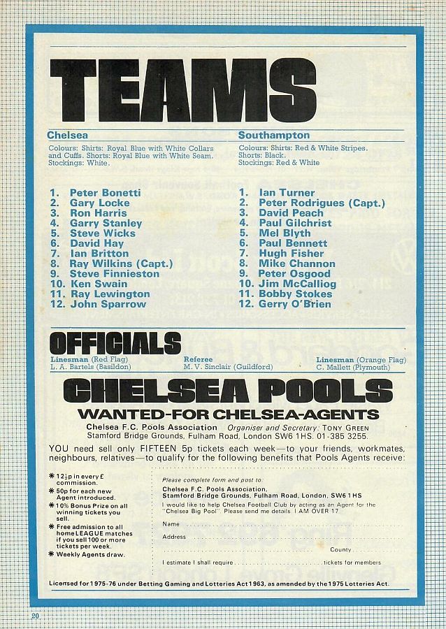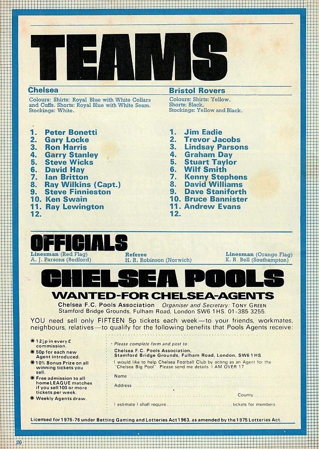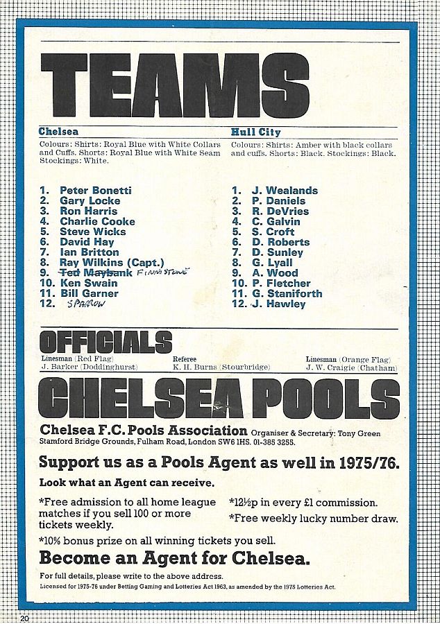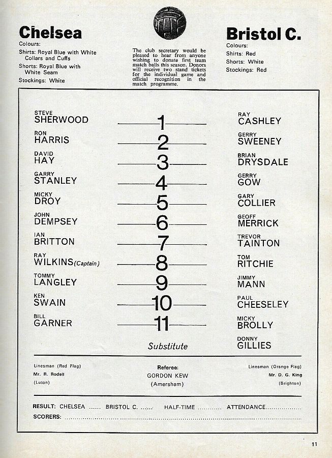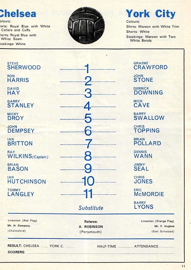 1 Peter Bonetti, 2 Gary Locke, 3 Ron Harris, 4 Garry Stanley, 5 Steve Wicks, 6 David Hay, 7 Ian Britton, 8 Ray Wilkins, 9 Steve Finnieston, 10 Ken Swain, 11 Ray Lewington |