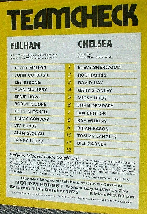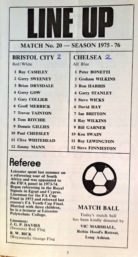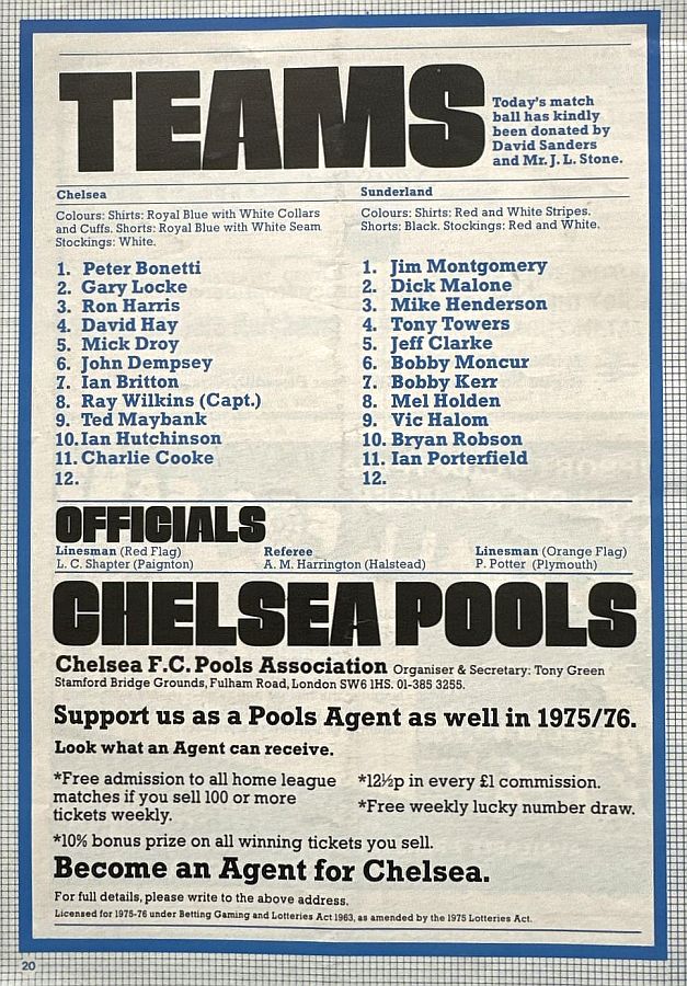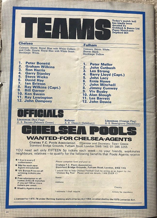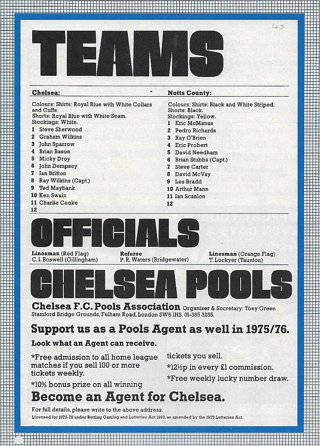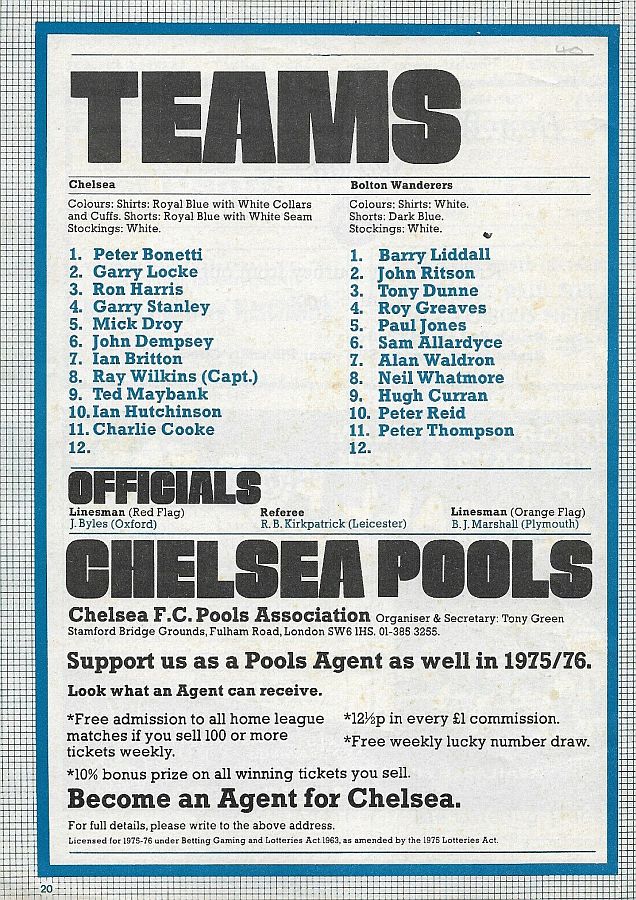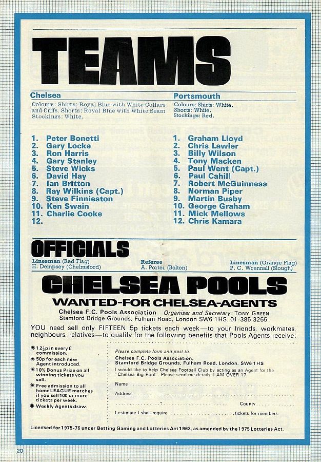 1 Peter Bonetti, 2 Gary Locke, 3 Ron Harris, 4 Garry Stanley, 5 Steve Wicks, 6 David Hay, 7 Ian Britton, 8 Ray Wilkins, 9 Steve Finnieston, 10 Ken Swain, 11 Ray Lewington |