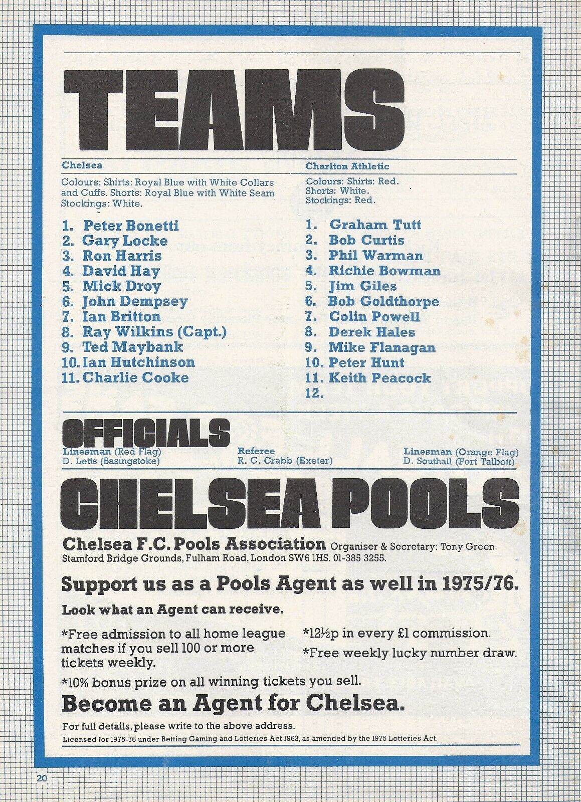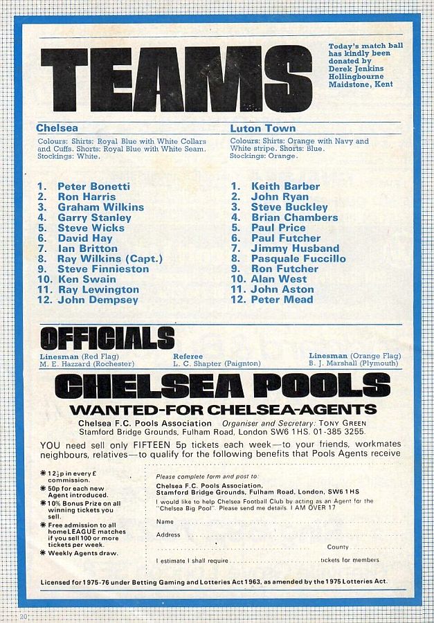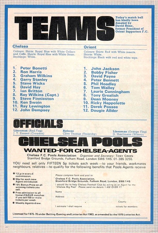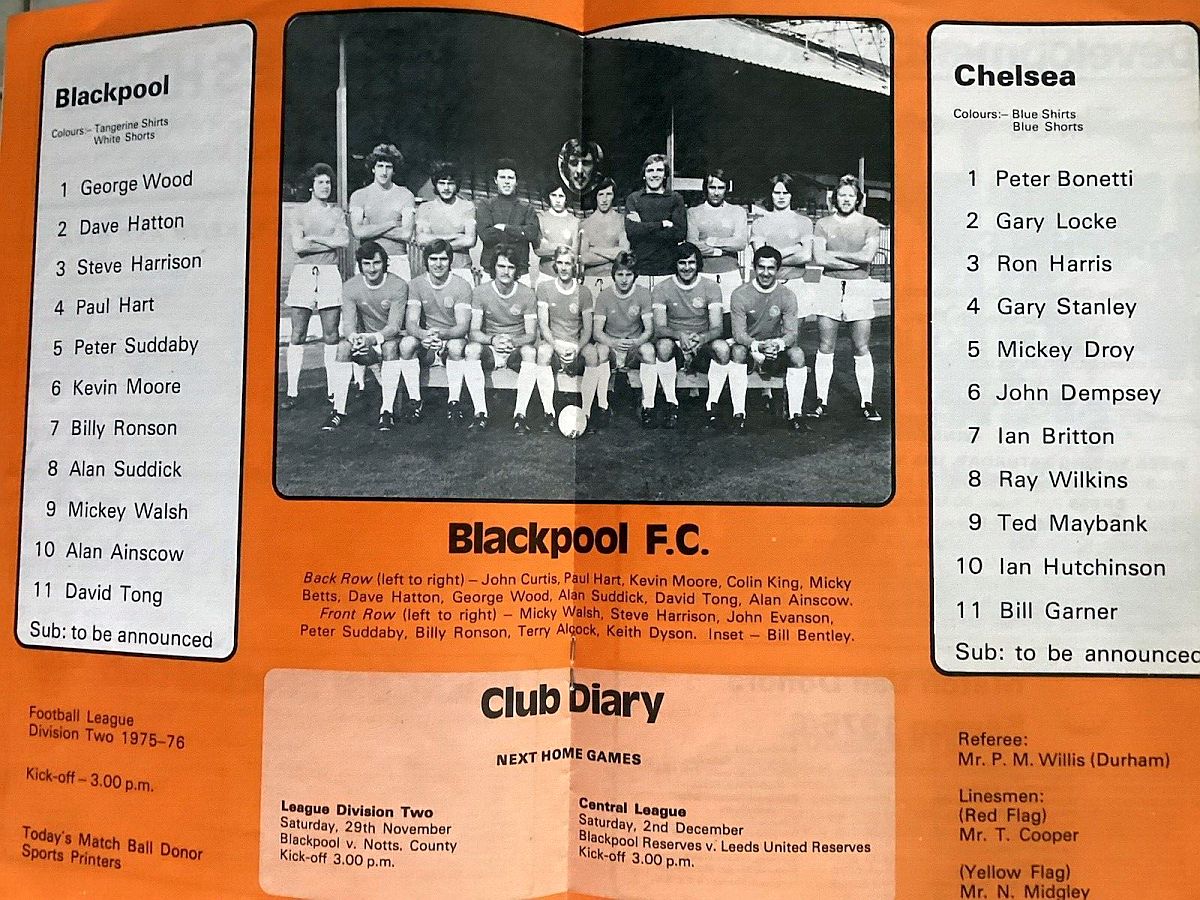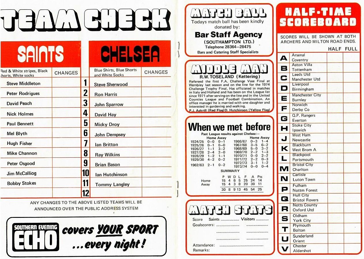 1 Peter Bonetti, 2 Gary Locke, 3 Ron Harris, 4 Garry Stanley, 5 Steve Wicks, 6 David Hay, 7 Ian Britton, 8 Ray Wilkins, 9 Steve Finnieston, 10 Ken Swain, 11 Ray Lewington |