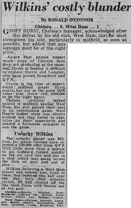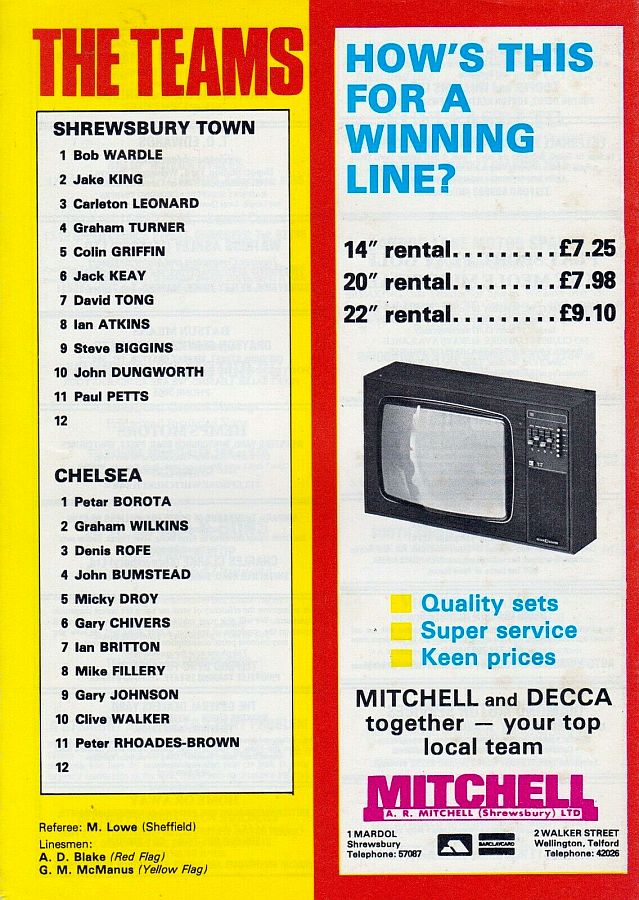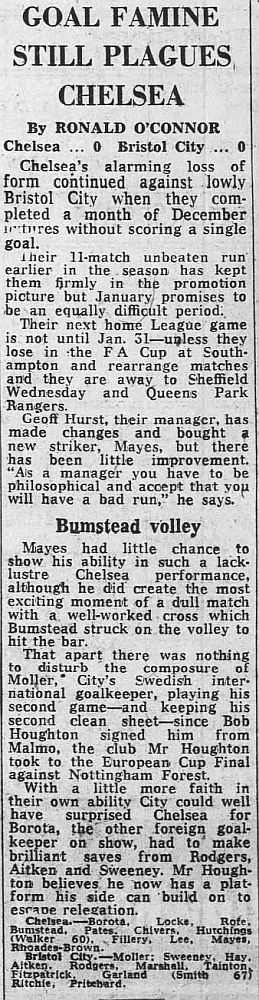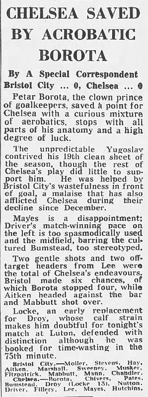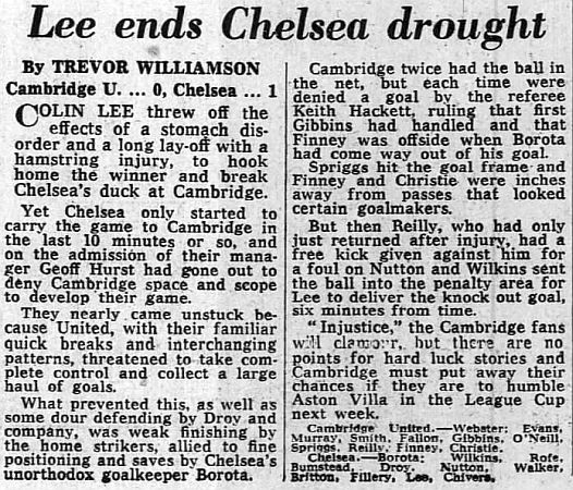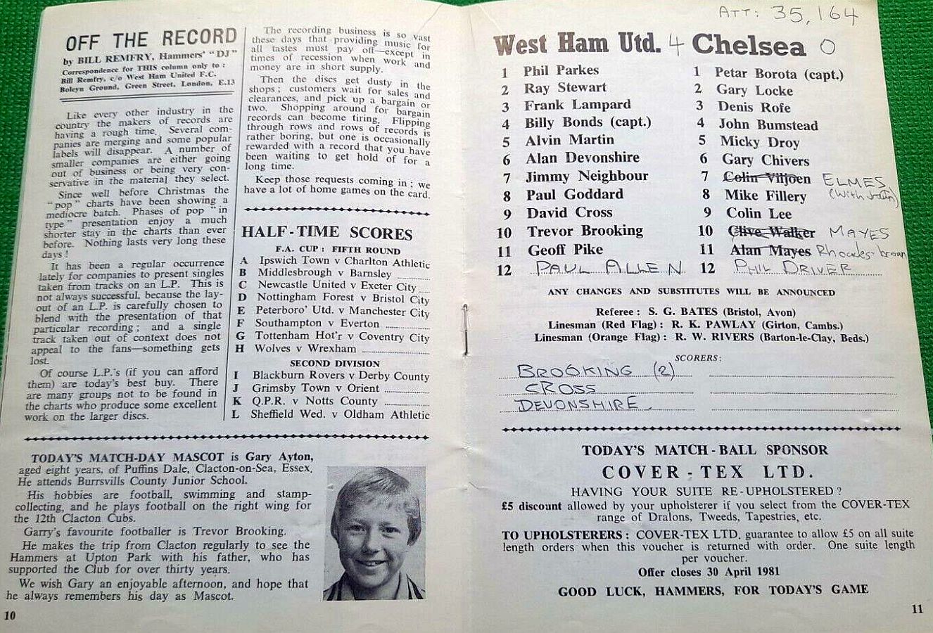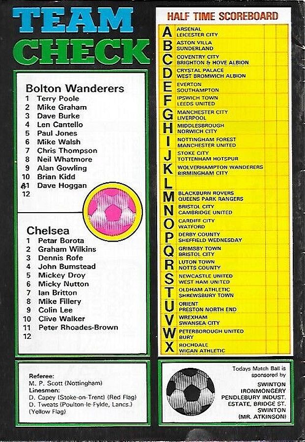 1 Petar Borota, 2 Gary Locke, 3 Dennis Rofe, 4 John Bumstead (12 Clive Walker 64), 5 Micky Droy, 6 Gary Chivers, 7 Colin Viljoen, 8 Mike Fillery, 9 Colin Lee, 10 Alan Mayes, 11 Peter Rhoades-Brown |