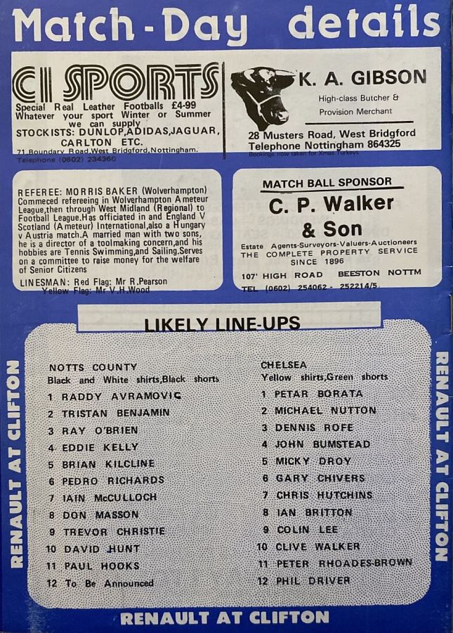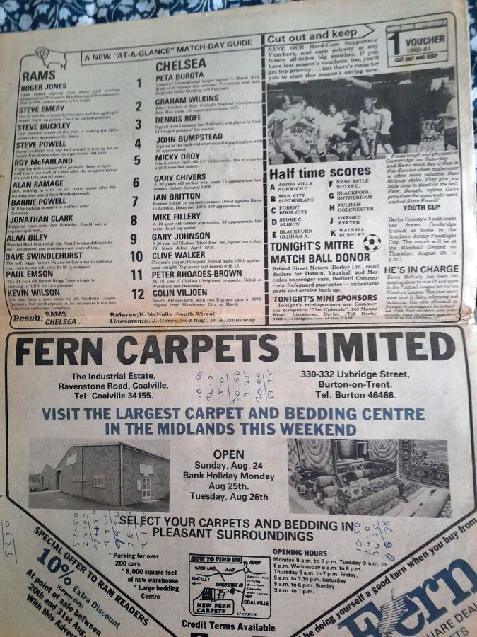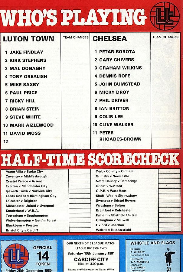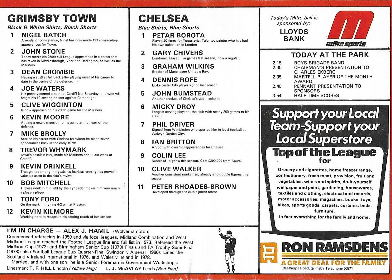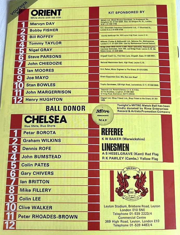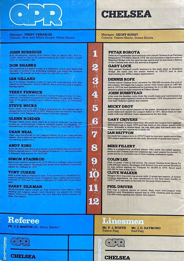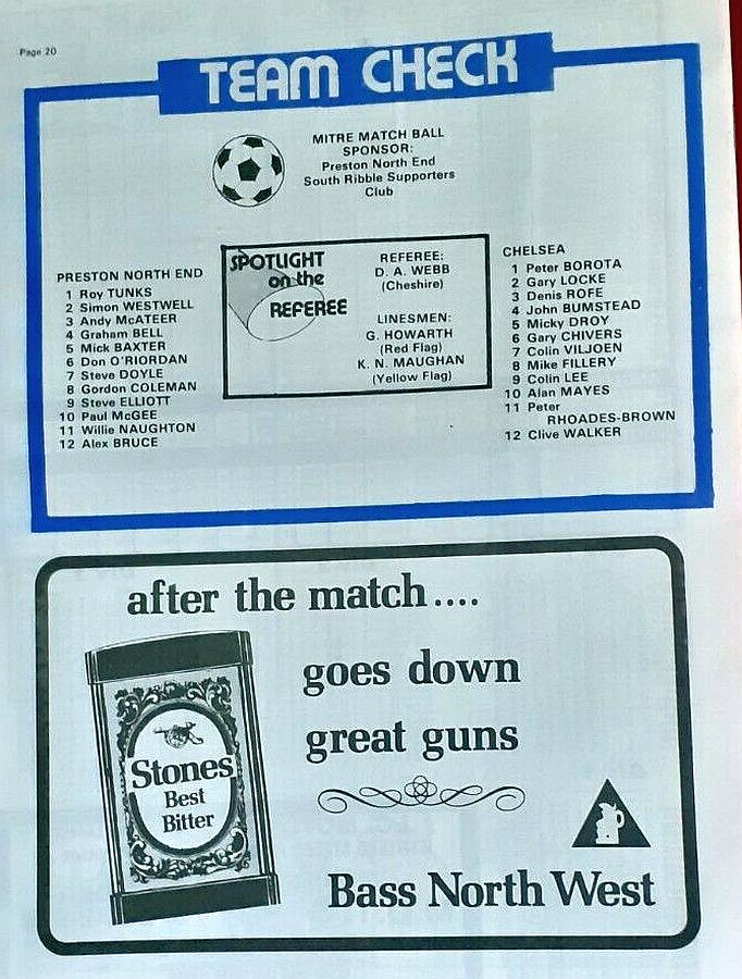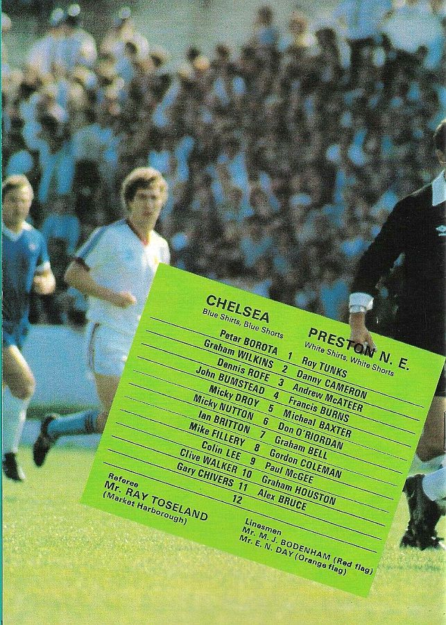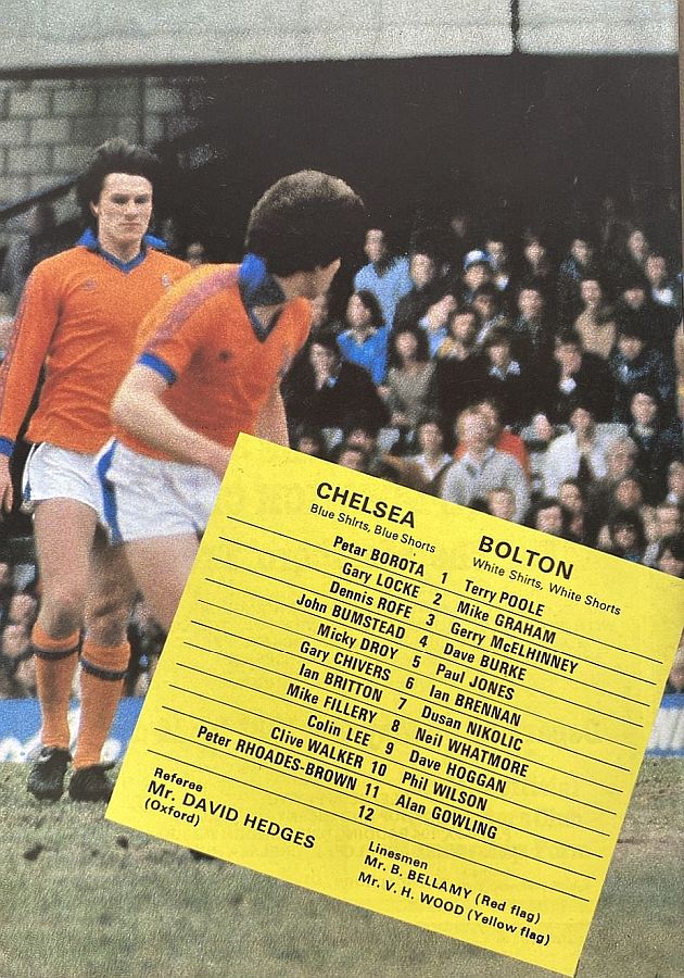 1 Petar Borota, 2 Gary Locke, 3 Dennis Rofe, 4 John Bumstead, 5 Micky Droy, 6 Gary Chivers, 7 Phil Driver, 8 Mike Fillery (12 Chris Hutchings 12), 9 Colin Lee, 10 Clive Walker, 11 Peter Rhoades-Brown |