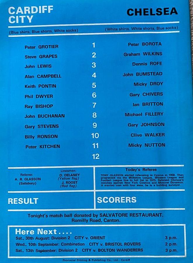1 Petar Borota, 2 Graham Wilkins, 3 Dennis Rofe, 4 John Bumstead, 5 Micky Droy, 6 Gary Chivers, 7 Ian Britton, 8 Mike Fillery, 9 Gary Johnson (12 Colin Viljoen 70), 10 Clive Walker, 11 Peter Rhoades-Brown |