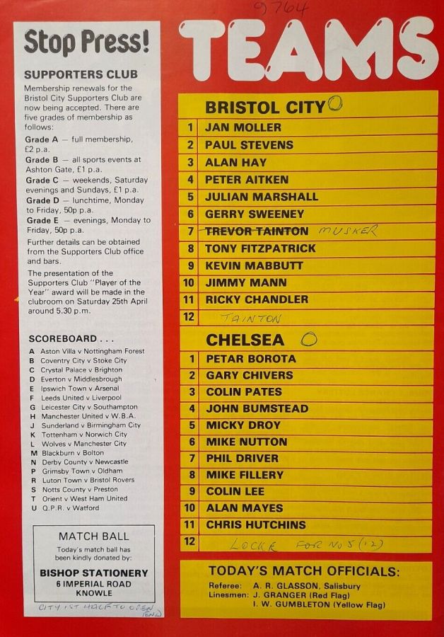 1 Petar Borota, 2 Gary Locke (12 Peter Rhoades-Brown 69), 3 Graham Wilkins, 4 John Bumstead, 5 Colin Pates, 6 Gary Chivers, 7 Ian Britton, 8 Mike Fillery, 9 Colin Lee, 10 Clive Walker, 11 Colin Viljoen |