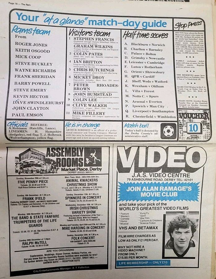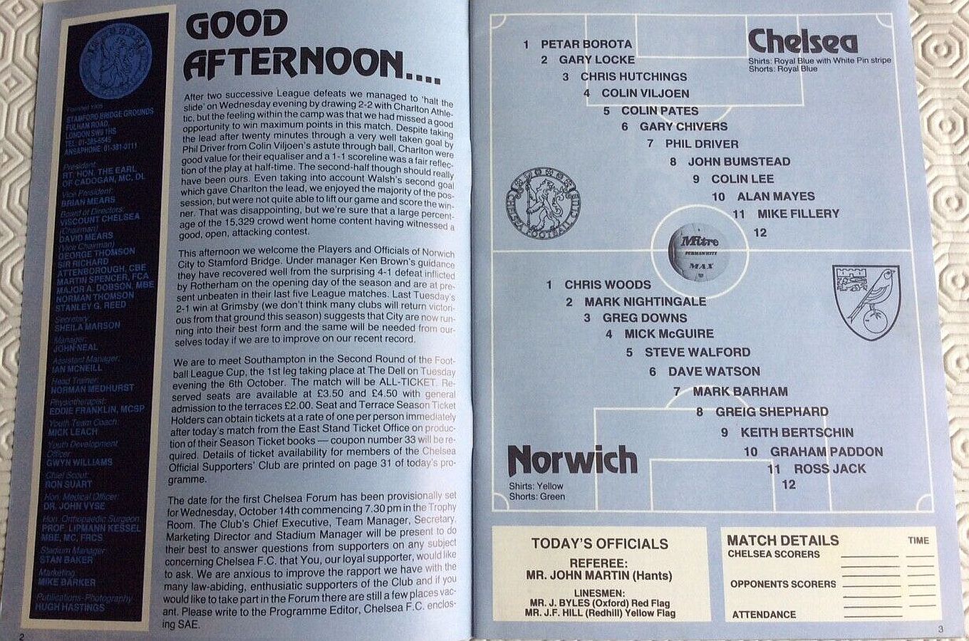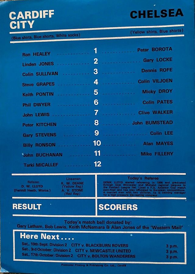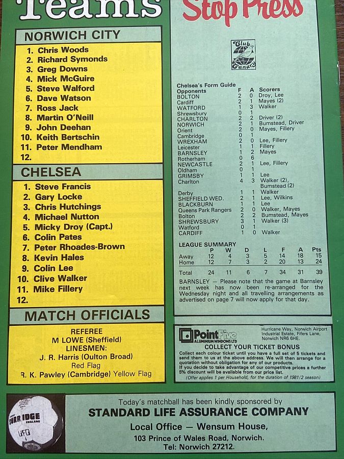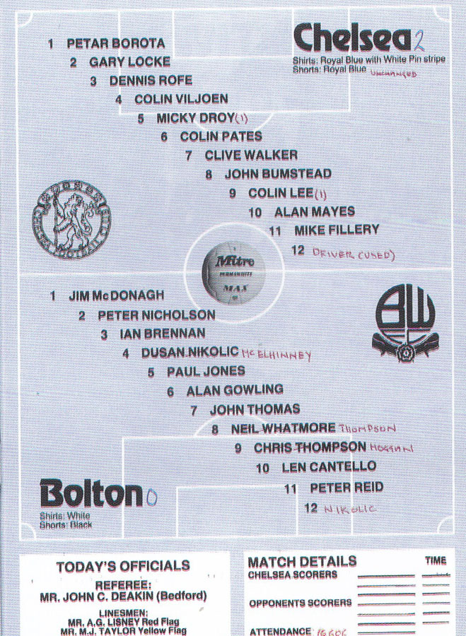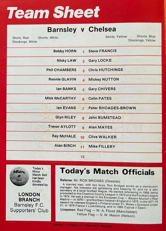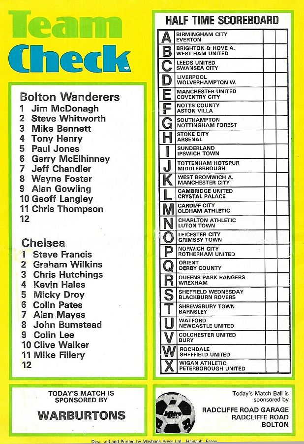 1 Petar Borota, 2 Gary Locke, 3 Dennis Rofe, 4 Colin Viljoen, 5 Micky Droy (12 Phil Driver 16), 6 Colin Pates, 7 Clive Walker, 8 John Bumstead, 9 Colin Lee, 10 Alan Mayes, 11 Mike Fillery |