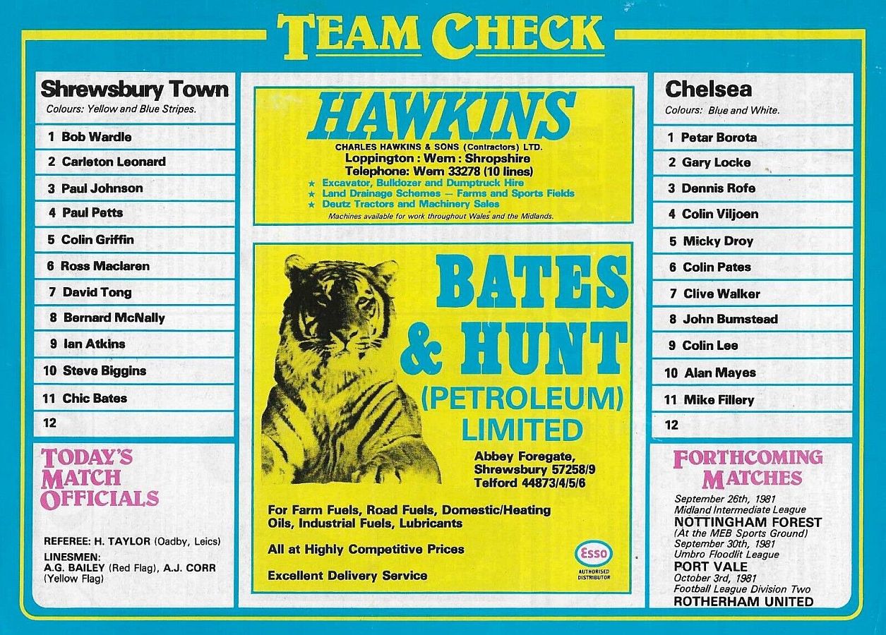 1 Petar Borota, 2 Gary Locke, 3 Dennis Rofe, 4 Colin Viljoen, 5 Micky Droy, 6 Colin Pates, 7 Clive Walker, 8 John Bumstead (12 Phil Driver), 9 Colin Lee, 10 Alan Mayes, 11 Mike Fillery |