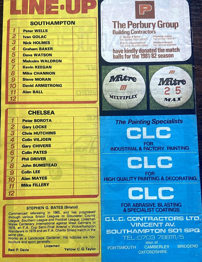 1 Steve Francis, 2 Gary Locke, 3 Dennis Rofe (12 Gary Chivers), 4 Chris Hutchings, 5 Micky Droy, 6 Colin Pates, 7 Clive Walker, 8 Ian Britton, 9 Colin Lee, 10 Alan Mayes, 11 Mike Fillery |