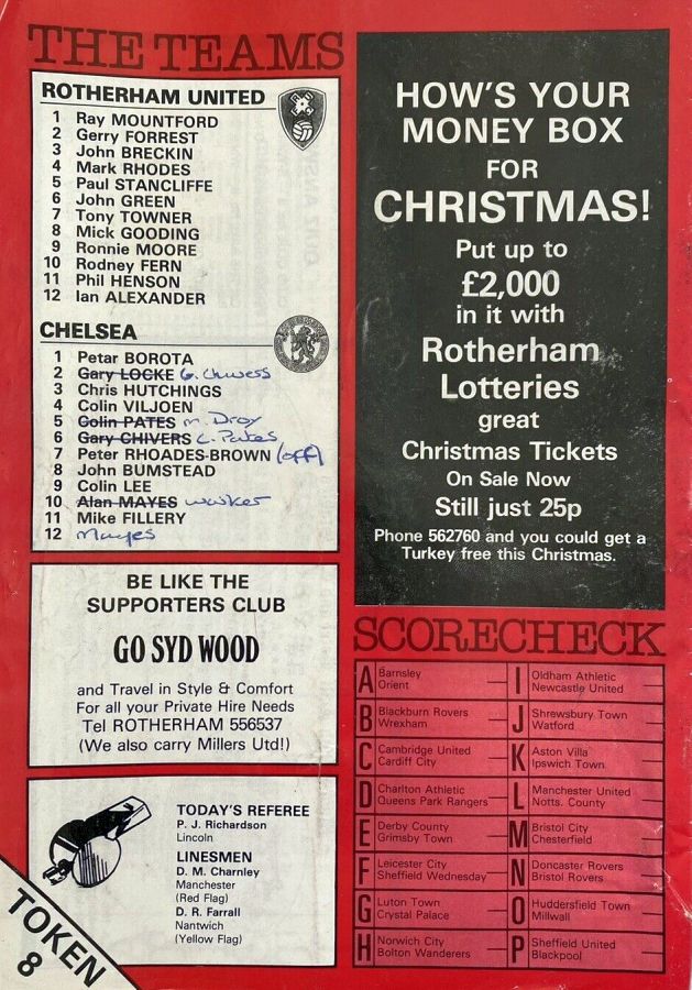1 Steve Francis, 2 Colin Lee, 3 Gary Locke, 4 Mike Nutton, 5 Micky Droy, 6 Colin Pates, 7 Peter Rhoades-Brown (12 Graham Wilkins 80), 8 Gary Chivers, 9 Clive Walker, 10 Alan Mayes, 11 Ian Britton |