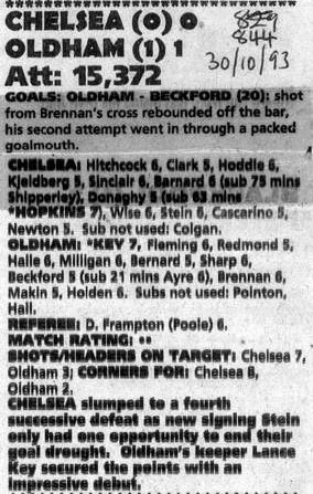 1 Dmitri Kharine, 5 Erland Johnsen, 6 Frank Sinclair, 7 John Spencer (17 Nigel Spackman 46), 10 Gavin Peacock, 11 Dennis Wise, 12 Steve Clarke, 16 Robert Fleck, 18 Eddie Newton, 24 Craig Burley, 35 Jakob Kjeldbjerg |