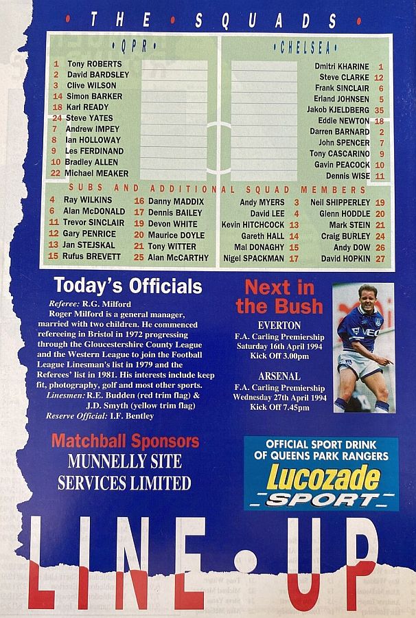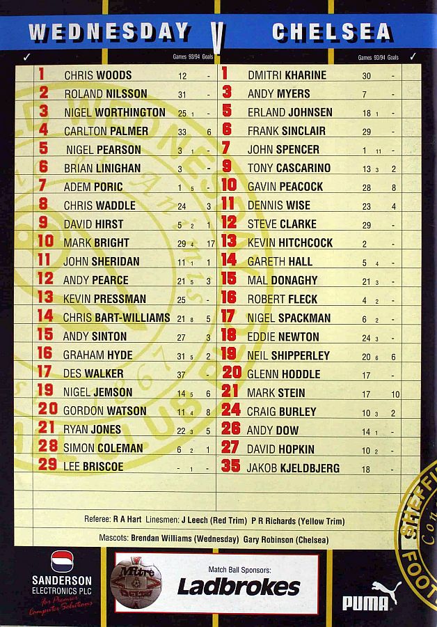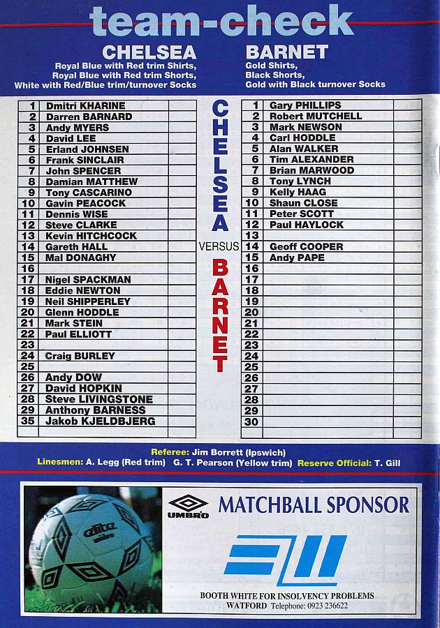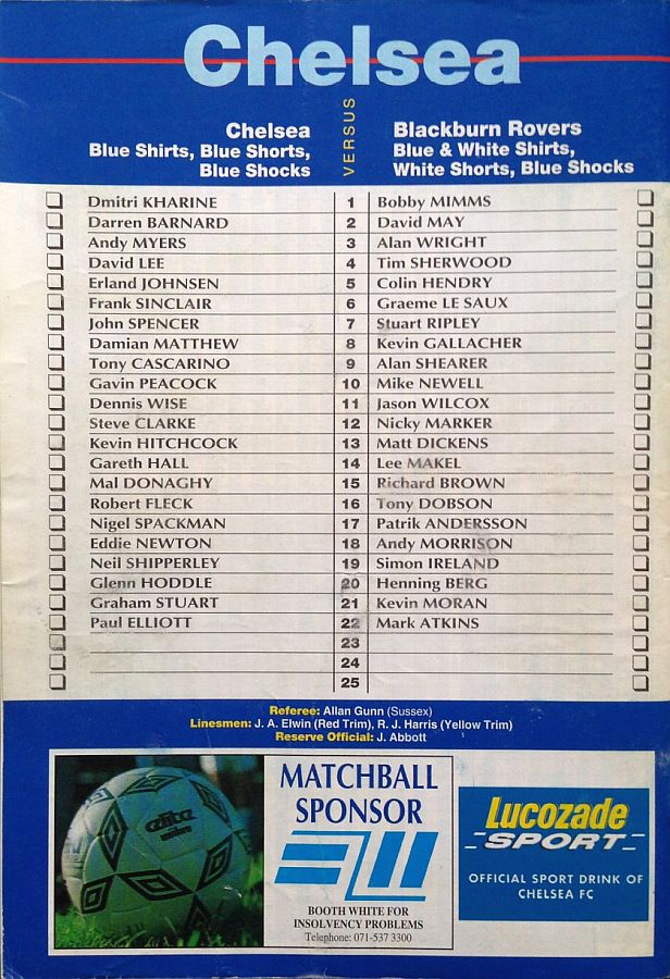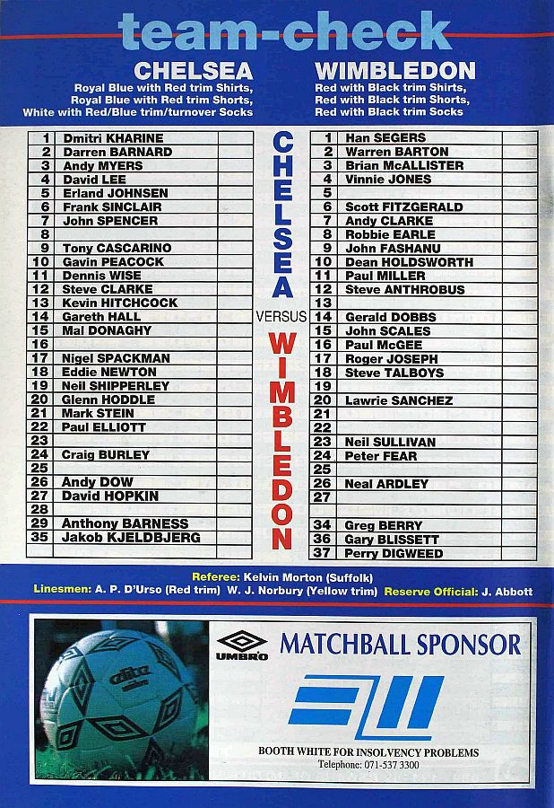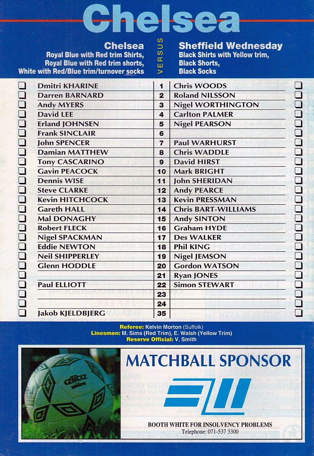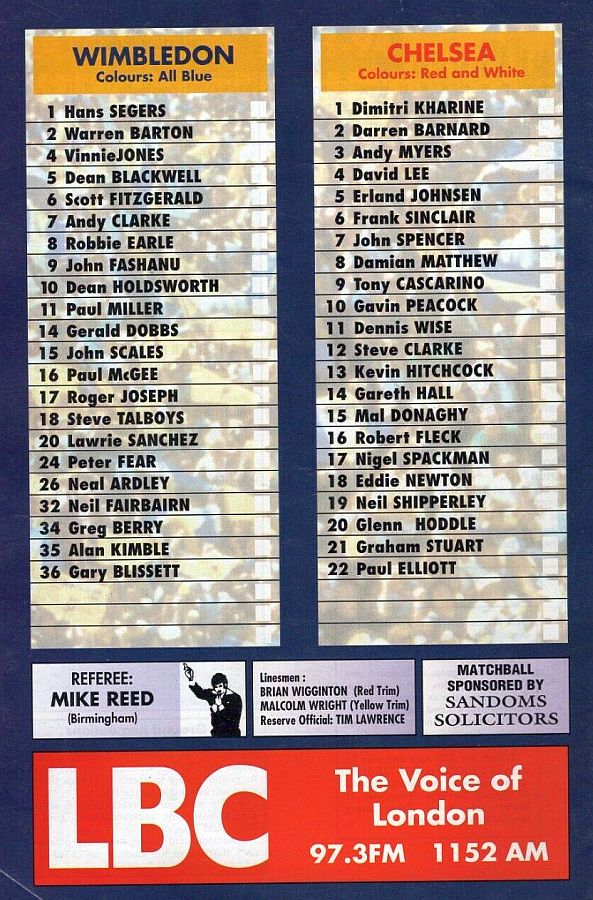 1 Dmitri Kharine, 2 Darren Barnard (17 Nigel Spackman 68), 6 Frank Sinclair, 7 John Spencer, 10 Gavin Peacock, 11 Dennis Wise, 12 Steve Clarke, 15 Mal Donaghy, 16 Robert Fleck, 18 Eddie Newton, 35 Jakob Kjeldbjerg |