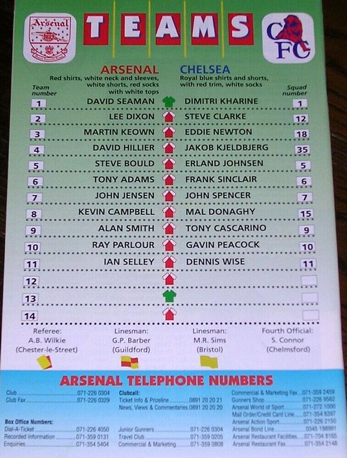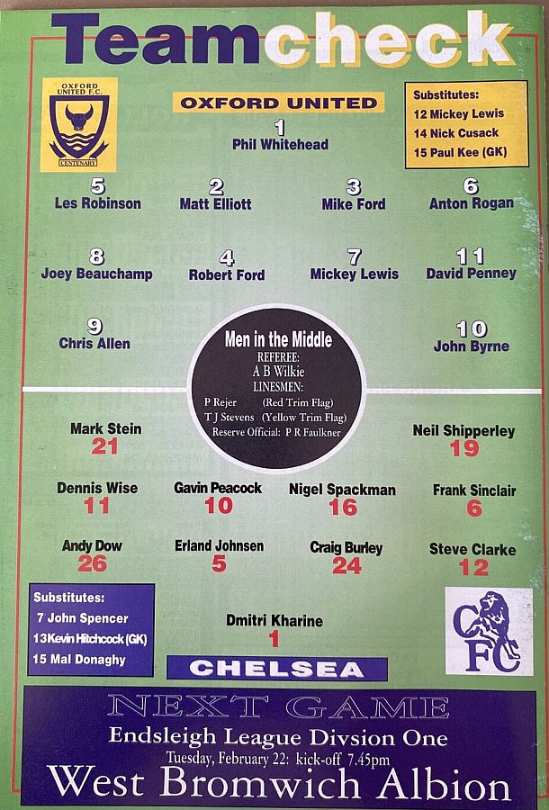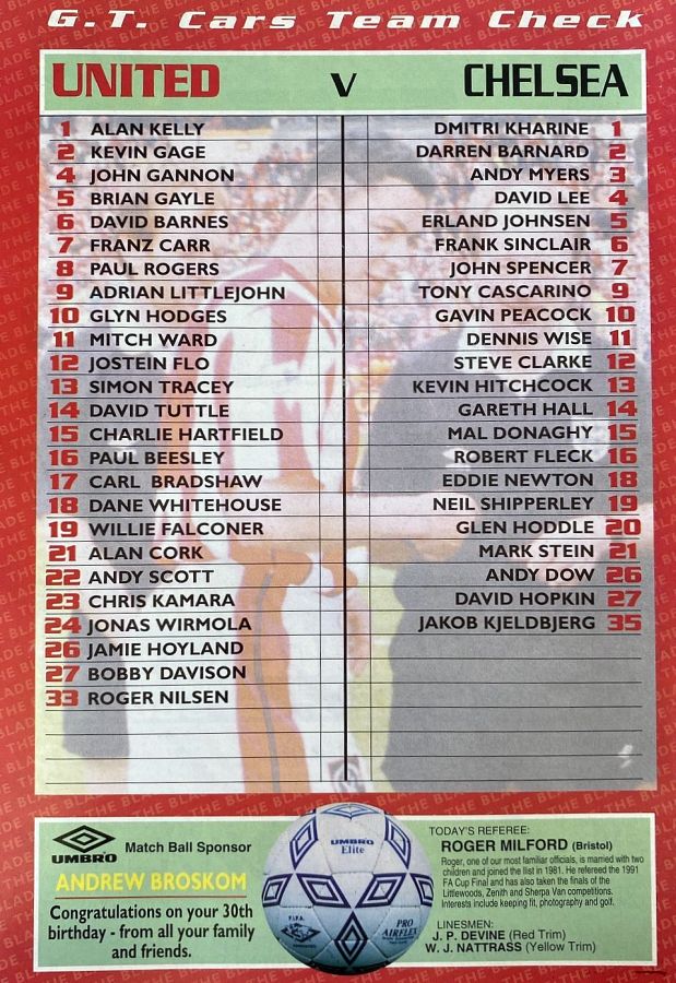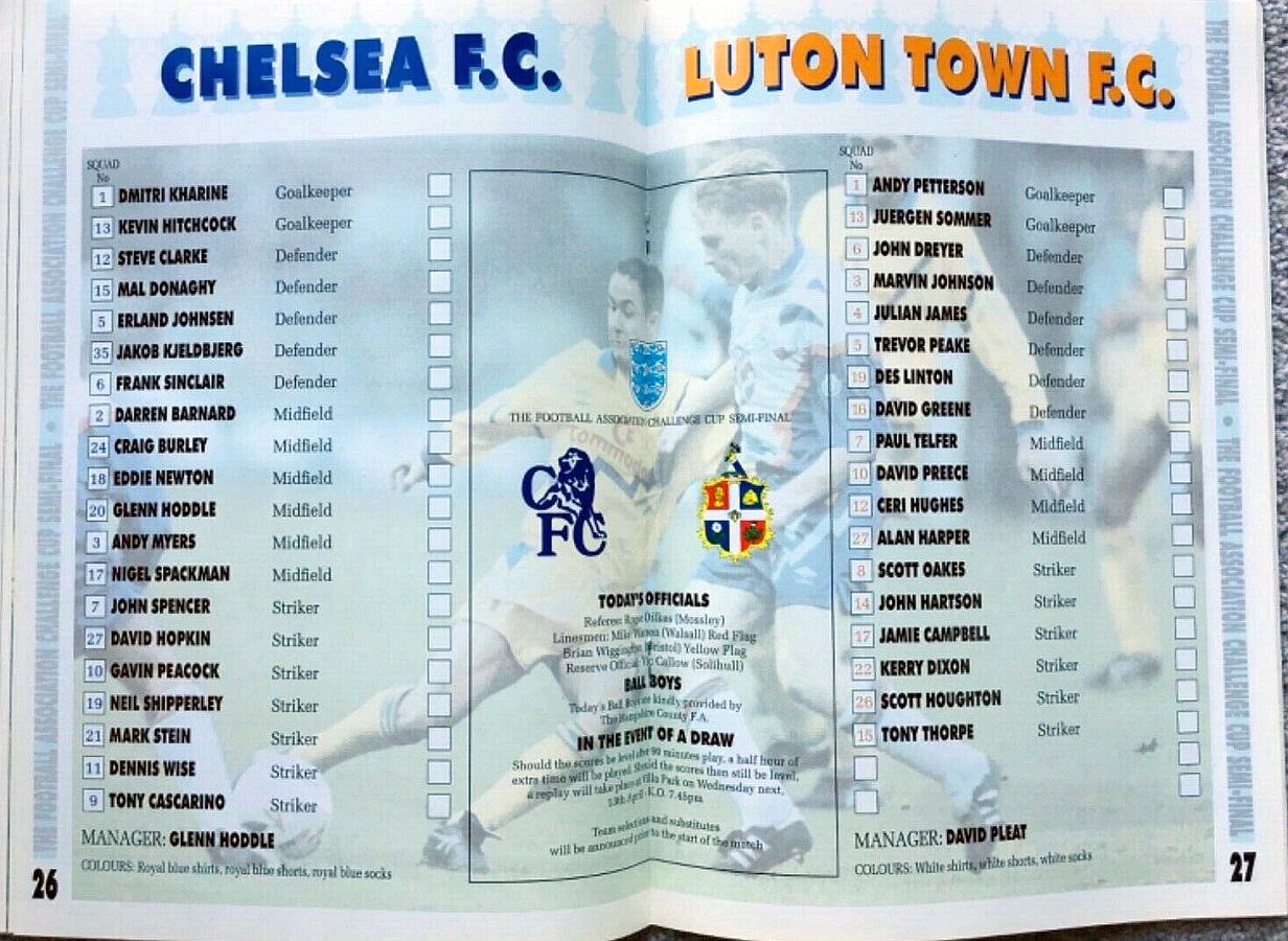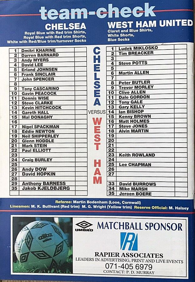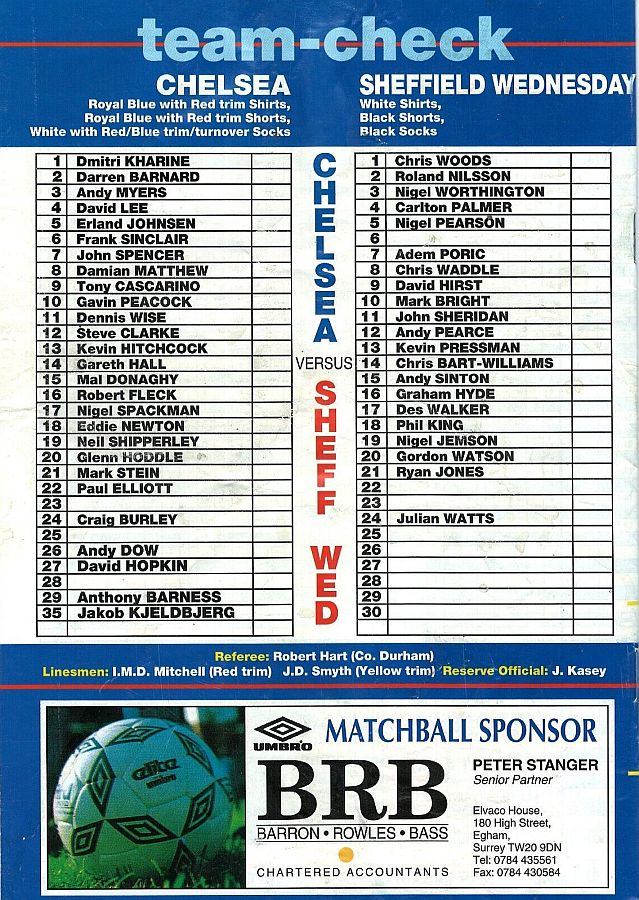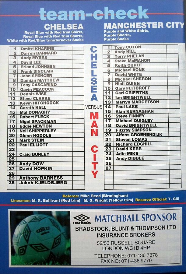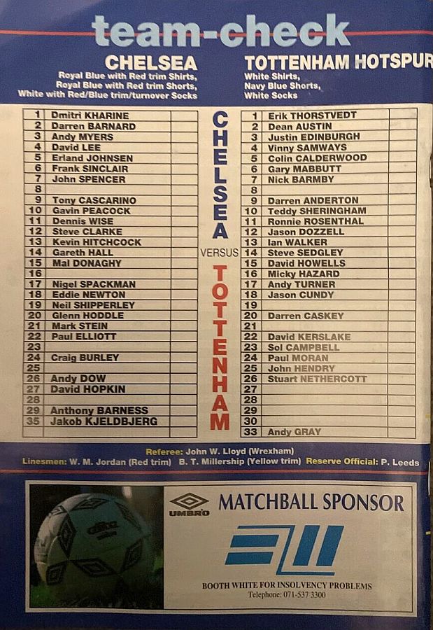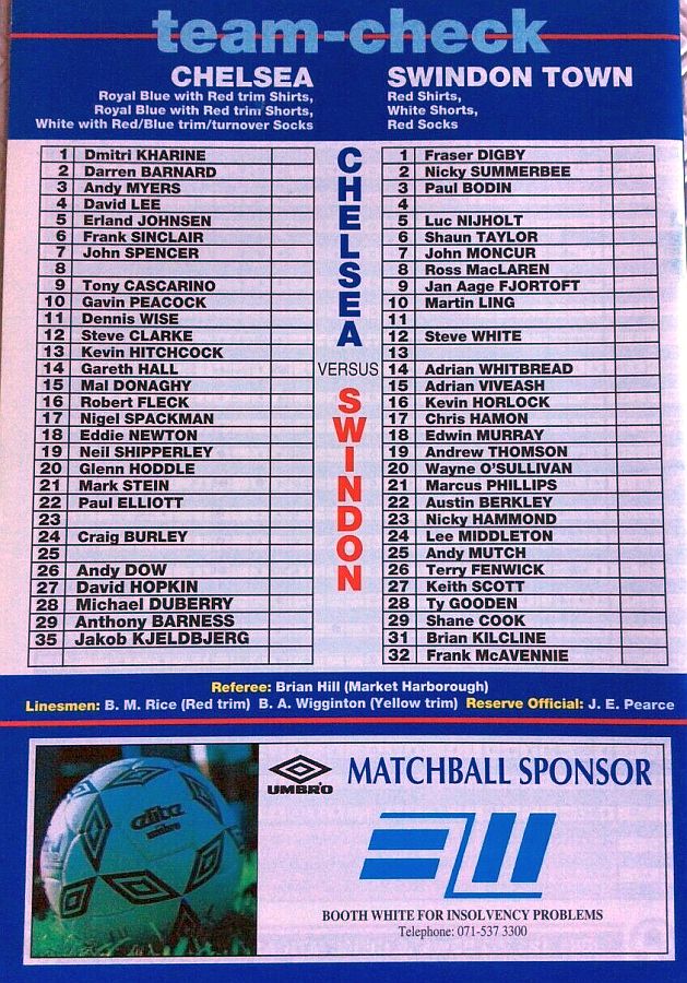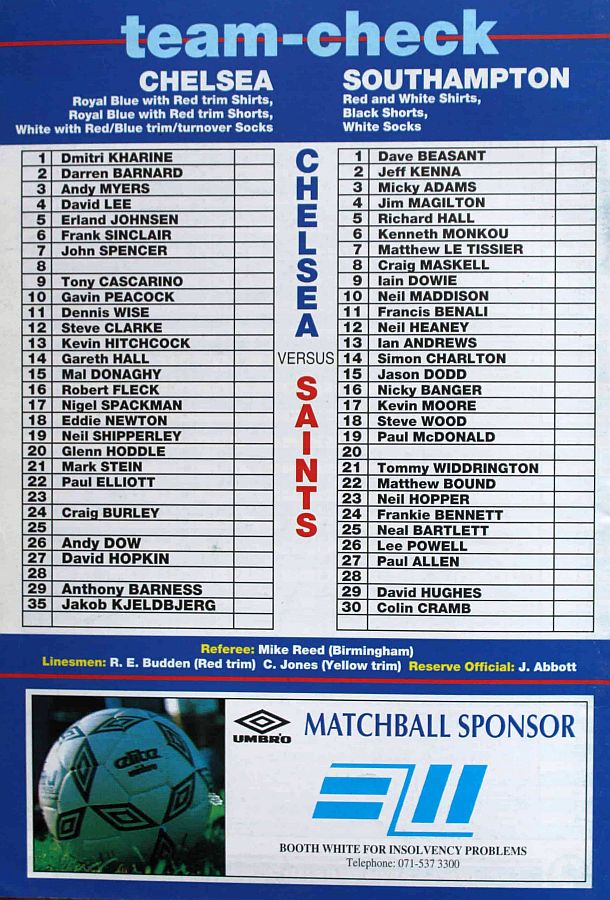 1 Dmitri Kharine, 3 Andy Myers ( 4 David Lee 8), 5 Erland Johnsen, 9 Tony Cascarino (19 Neil Shipperley 79), 10 Gavin Peacock, 11 Dennis Wise, 12 Steve Clarke, 15 Mal Donaghy, 18 Eddie Newton, 20 Glenn Hoddle, 35 Jakob Kjeldbjerg |