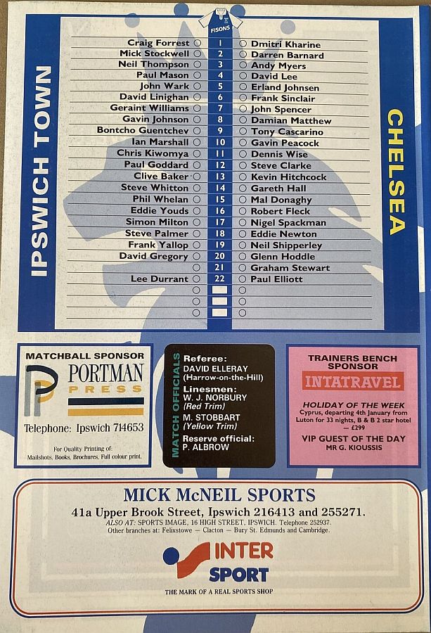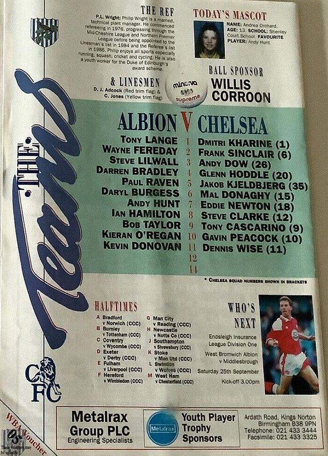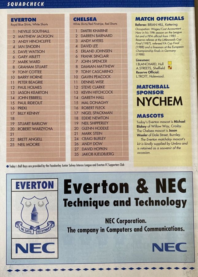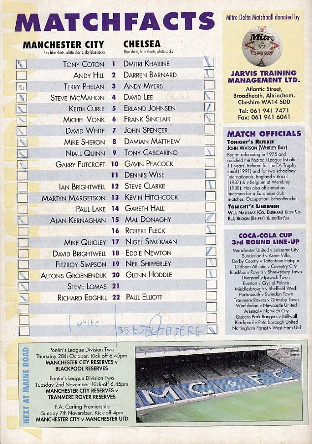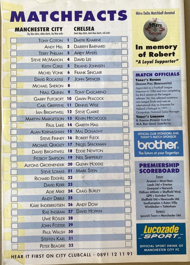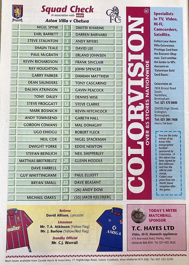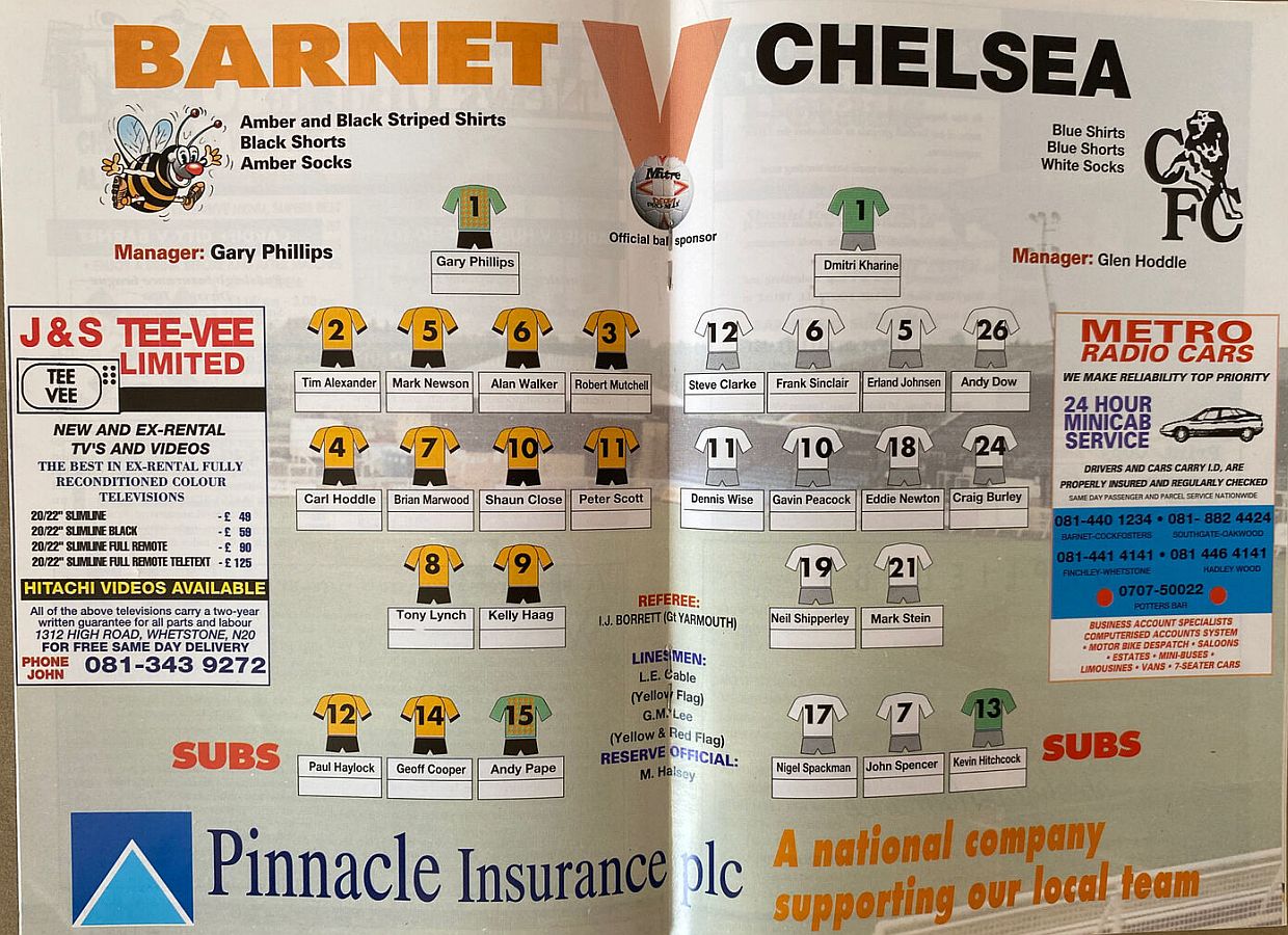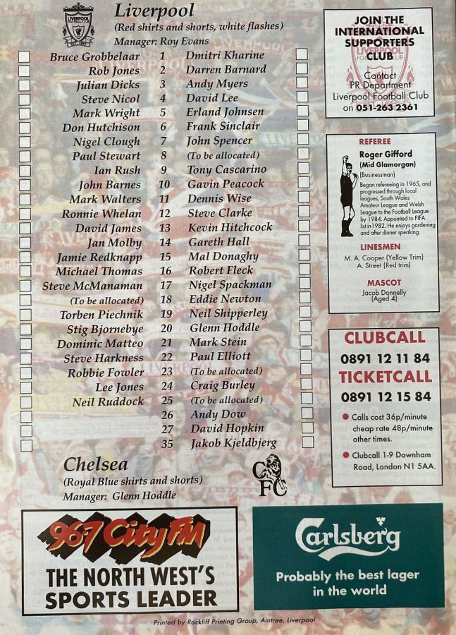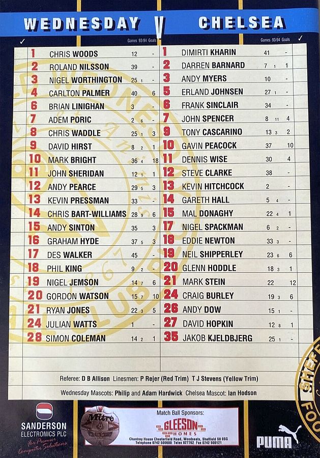 1 Dmitri Kharine, 3 Andy Myers ( 4 David Lee 8), 5 Erland Johnsen, 9 Tony Cascarino (19 Neil Shipperley 79), 10 Gavin Peacock, 11 Dennis Wise, 12 Steve Clarke, 15 Mal Donaghy, 18 Eddie Newton, 20 Glenn Hoddle, 35 Jakob Kjeldbjerg |