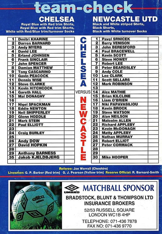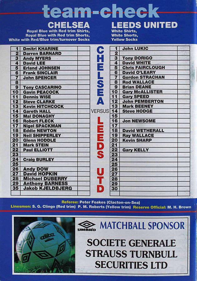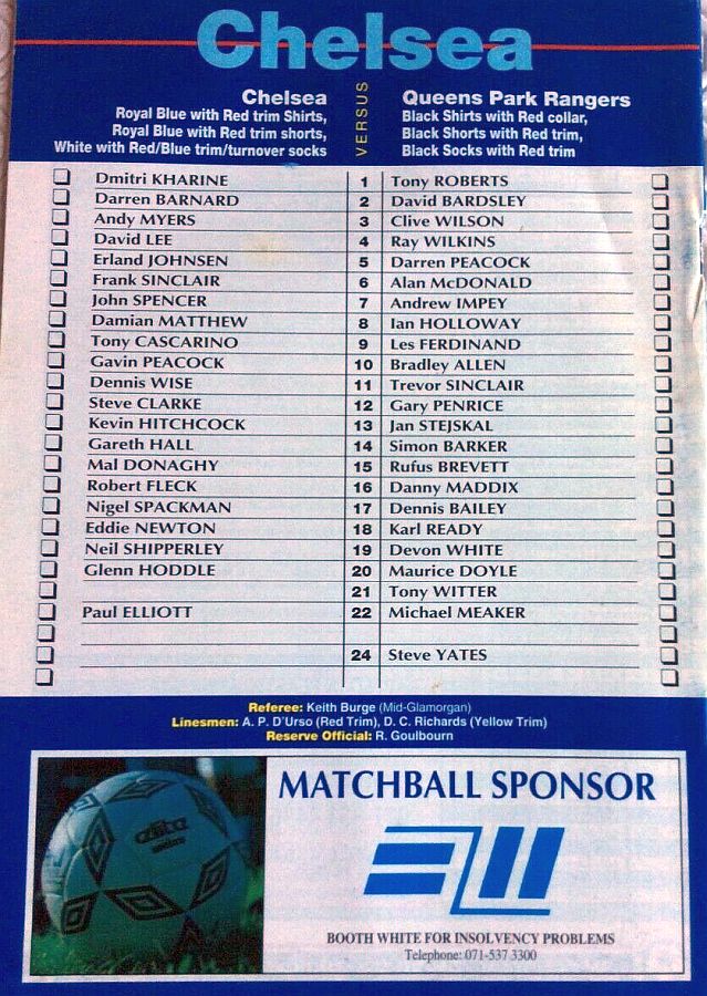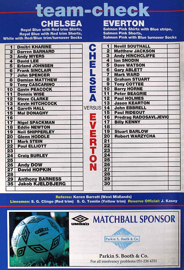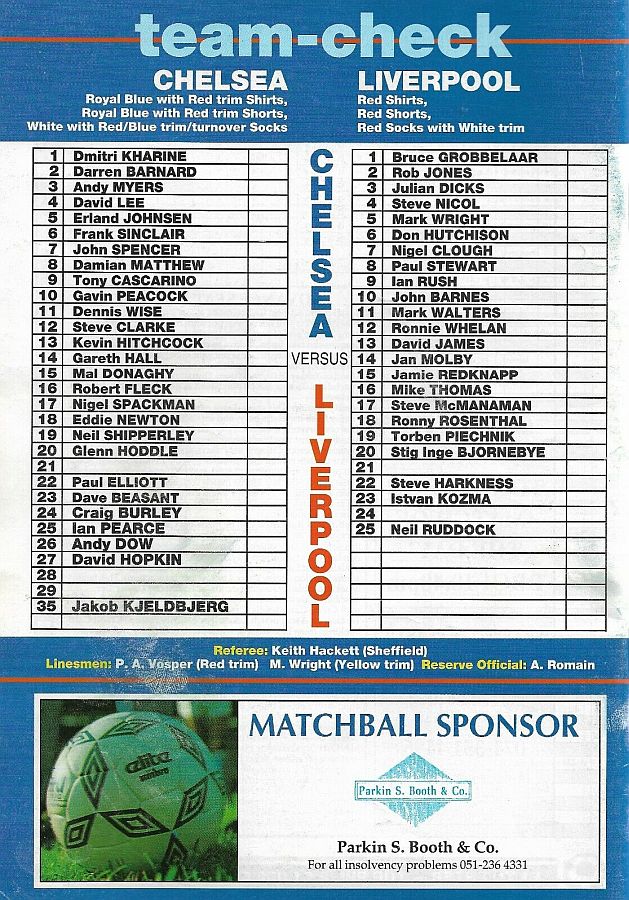 1 Dmitri Kharine, 4 David Lee, 6 Frank Sinclair, 7 John Spencer, 10 Gavin Peacock, 11 Dennis Wise, 12 Steve Clarke, 15 Mal Donaghy, 18 Eddie Newton, 27 David Hopkin, 35 Jakob Kjeldbjerg |