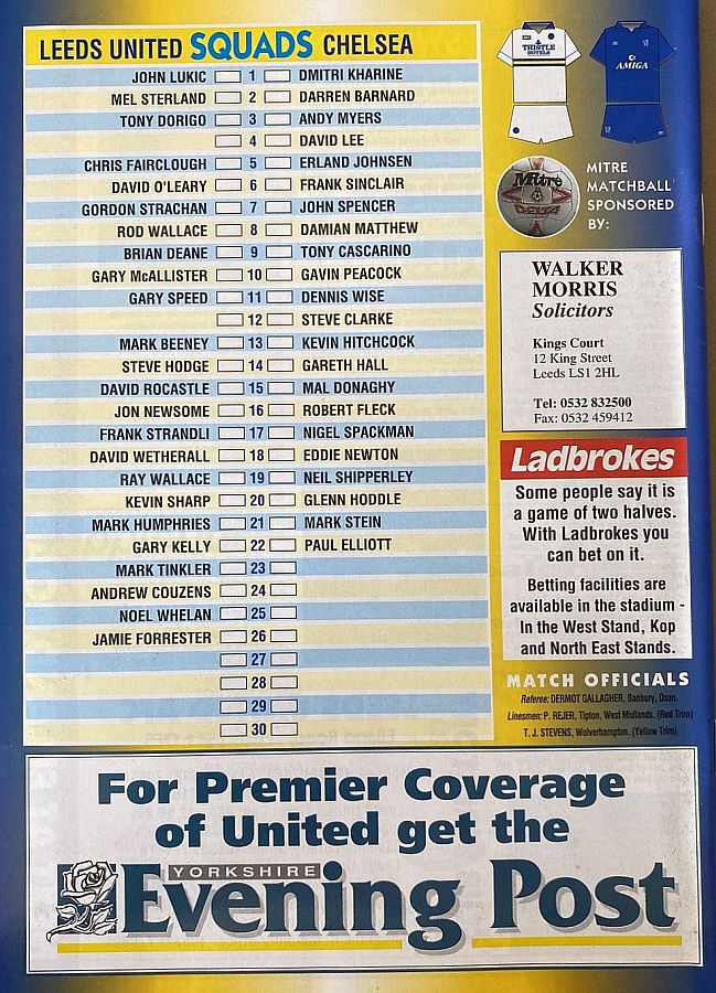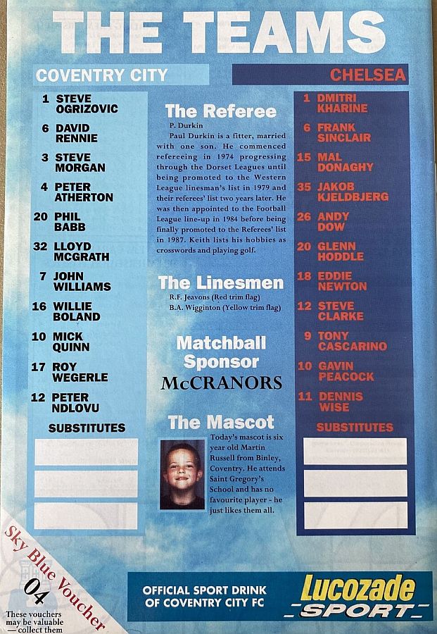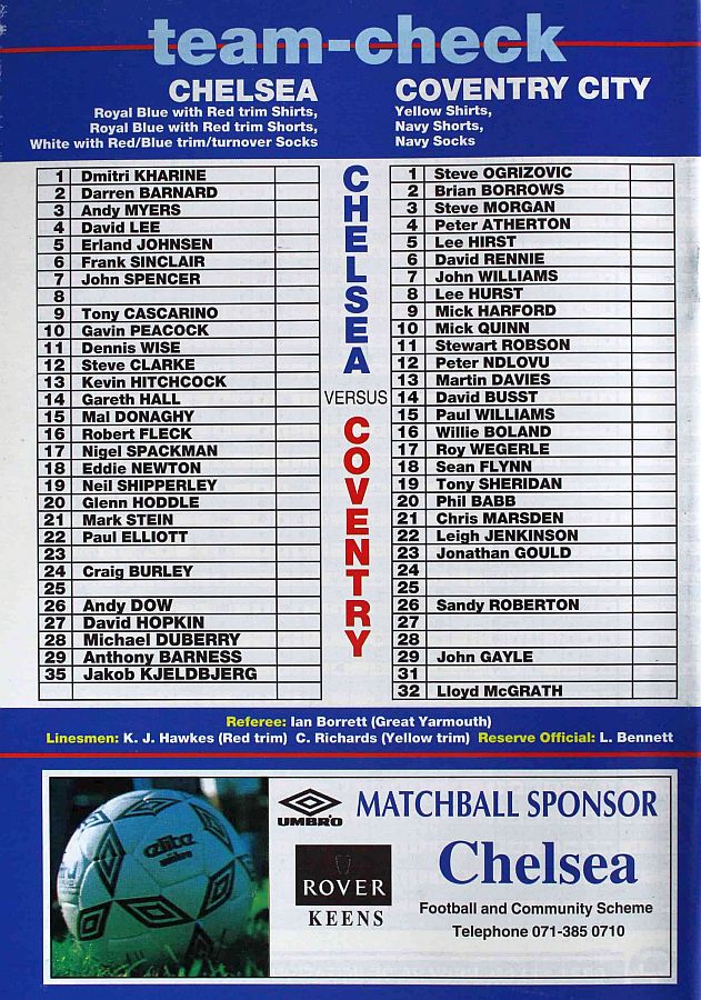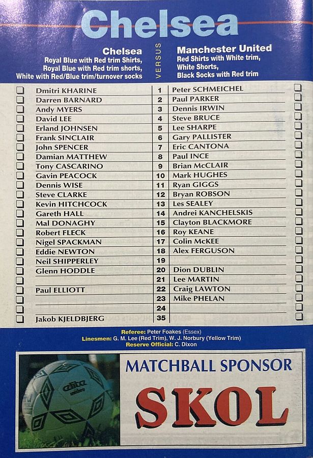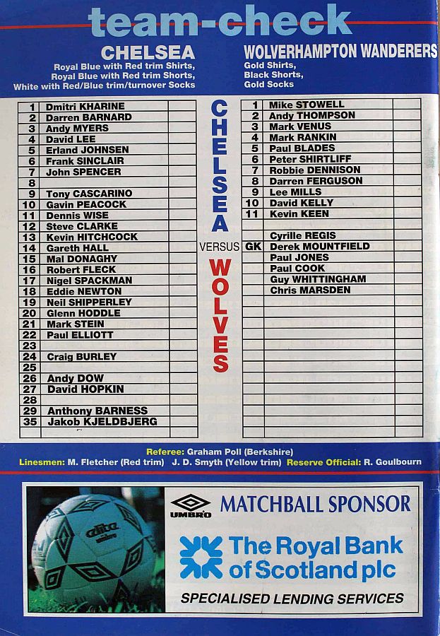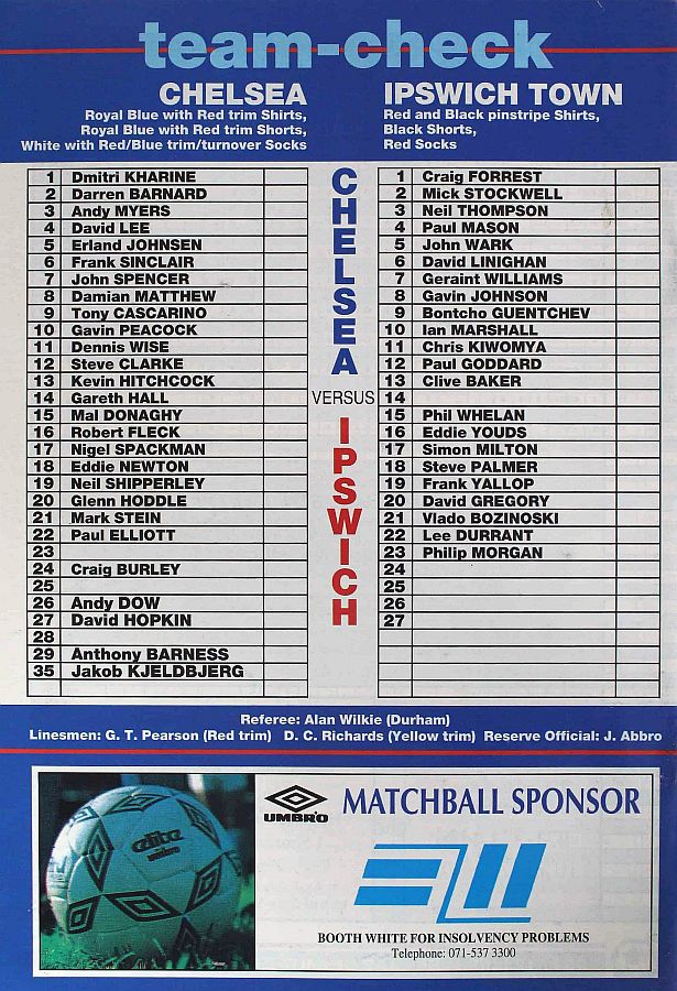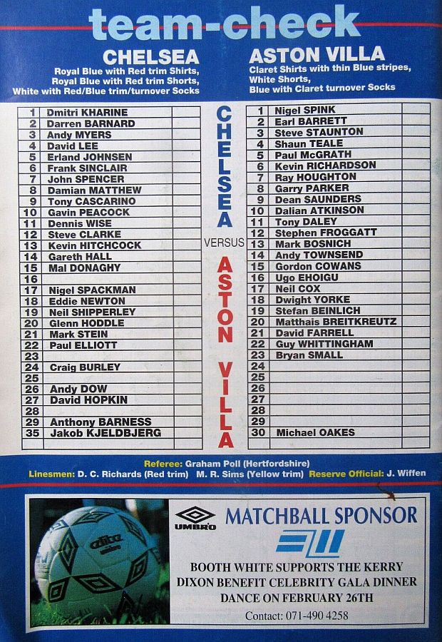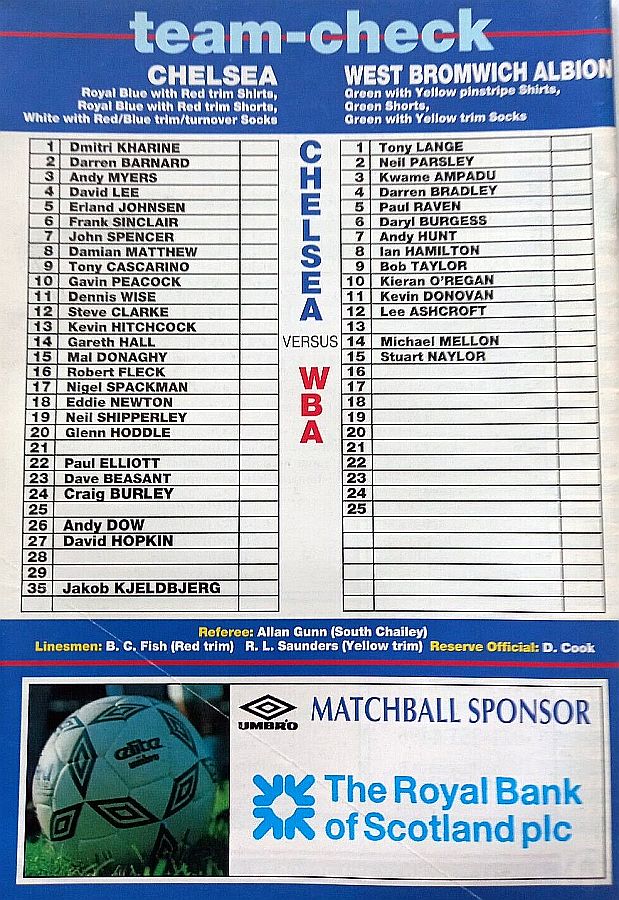 1 Dmitri Kharine, 2 Darren Barnard, 5 Erland Johnsen, 6 Frank Sinclair, 7 John Spencer, 9 Tony Cascarino (27 David Hopkin 37), 10 Gavin Peacock, 11 Dennis Wise, 12 Steve Clarke, 18 Eddie Newton, 35 Jakob Kjeldbjerg |