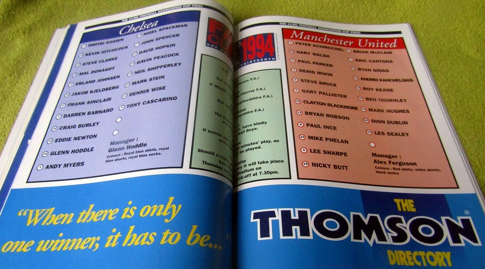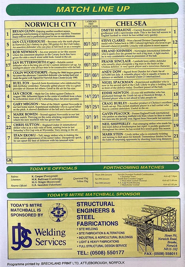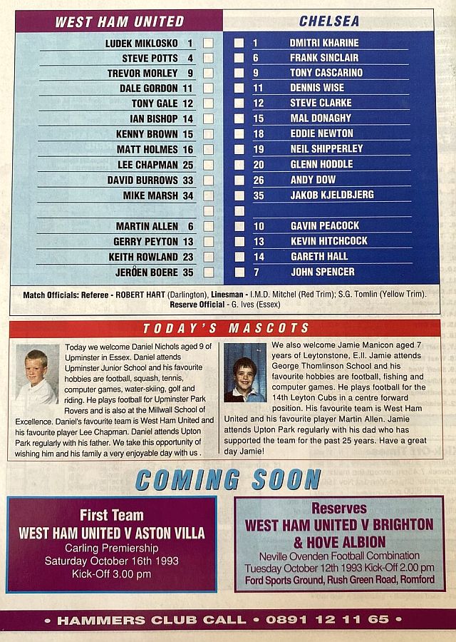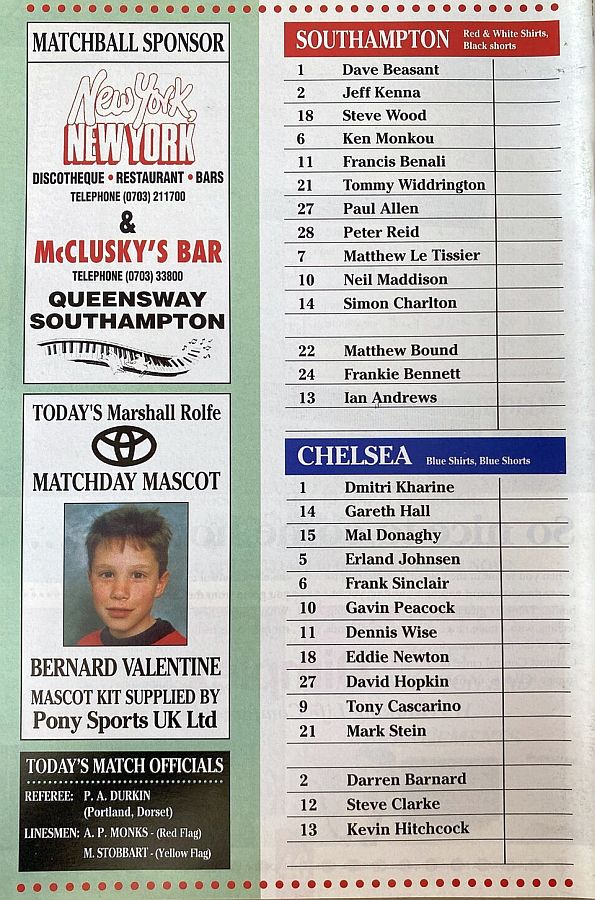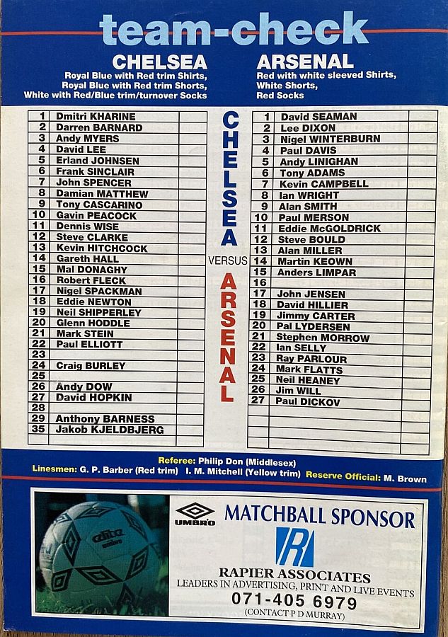 1 Dmitri Kharine, 3 Andy Myers, 4 David Lee, 5 Erland Johnsen, 9 Tony Cascarino, 10 Gavin Peacock, 11 Dennis Wise, 12 Steve Clarke, 15 Mal Donaghy, 18 Eddie Newton, 20 Glenn Hoddle |