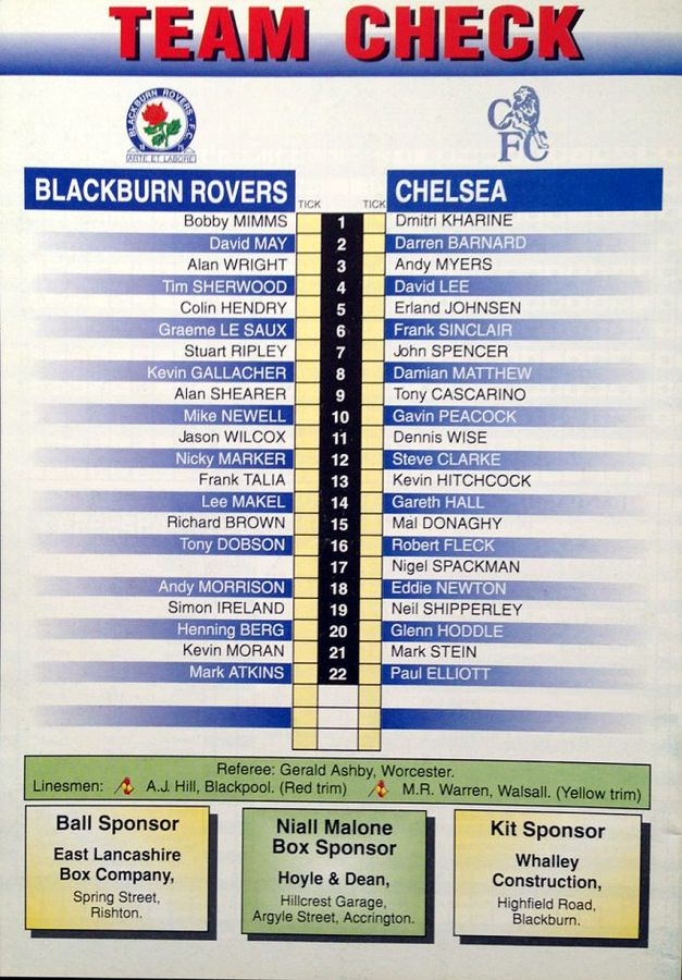 Bobby Mimms, David May (Henning Berg 88), Graeme Le Saux, Tim Sherwood, Kevin Moran, Nick Marker, Stuart Ripley, Kevin Gallacher, Mike Newell, Jason Wilcox, Mark Atkins |