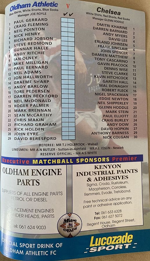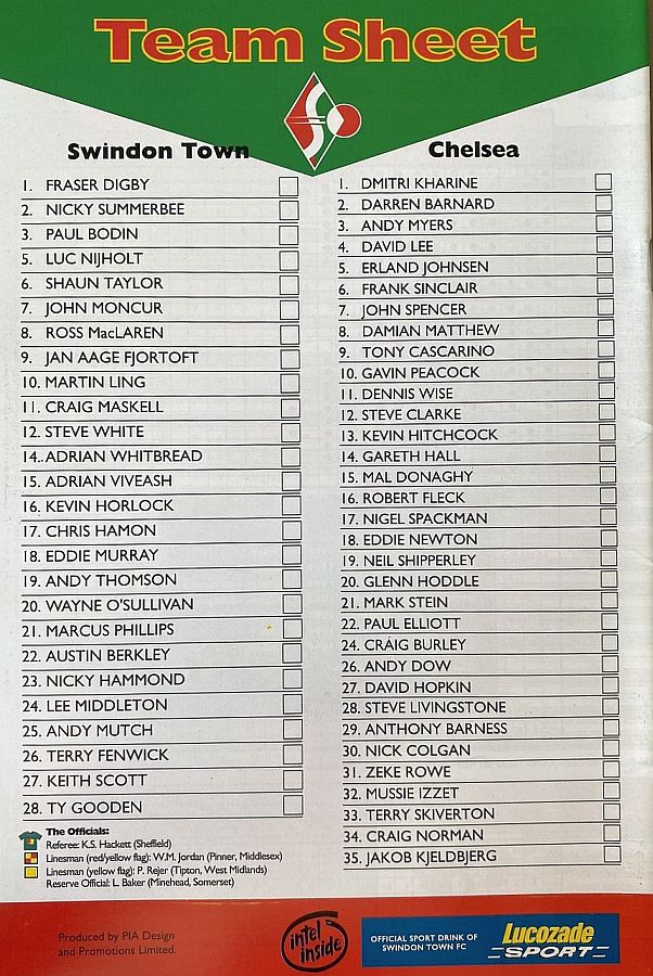 1 Dmitri Kharine, 6 Frank Sinclair, 9 Tony Cascarino (19 Neil Shipperley 68), 10 Gavin Peacock, 11 Dennis Wise, 12 Steve Clarke, 15 Mal Donaghy ( 4 David Lee 86), 18 Eddie Newton, 20 Glenn Hoddle, 26 Andy Dow, 35 Jakob Kjeldbjerg |