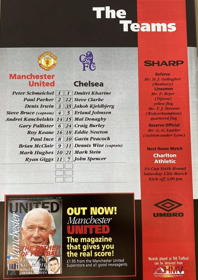 Peter Schmeichel, Paul Parker, Steve Bruce, Gary Pallister, Denis Irwin (Lee Sharpe 84), Andrei Kanchelskis (Brian McClair 84), Roy Keane, Paul Ince, Ryan Giggs, Eric Cantona, Mark Hughes |