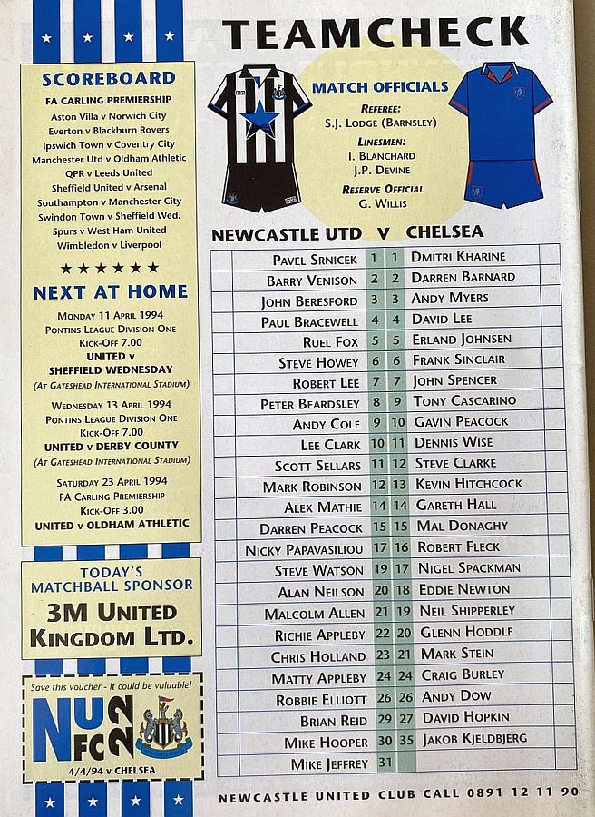 Pavel Srnicek, Mark Robinson, John Beresford (Alan Neilson 74), Paul Bracewell, Darren Peacock, Barry Venison, Rob Lee, Peter Beardsley, Andy Cole, Chris Holland (Alex Mathie 63), Scott Sellars |