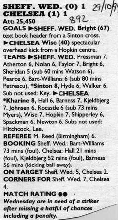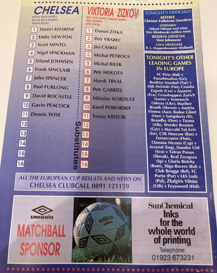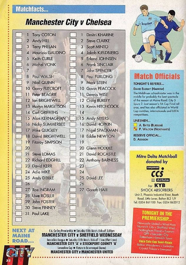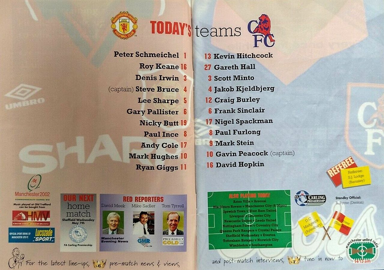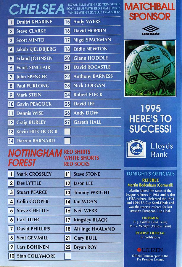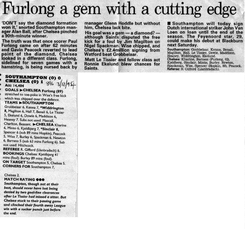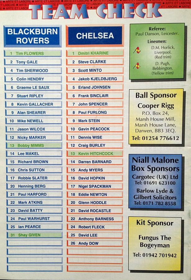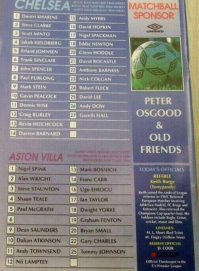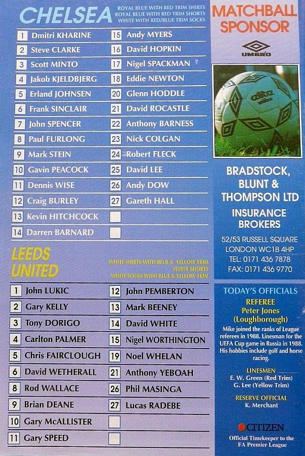 13 Kevin Hitchcock, 3 Scott Minto, 4 Jakob Kjeldbjerg, 6 Frank Sinclair, 8 Paul Furlong, 9 Mark Stein ( 7 John Spencer 82), 10 Gavin Peacock, 12 Craig Burley, 16 David Hopkin, 17 Nigel Spackman, 27 Gareth Hall |