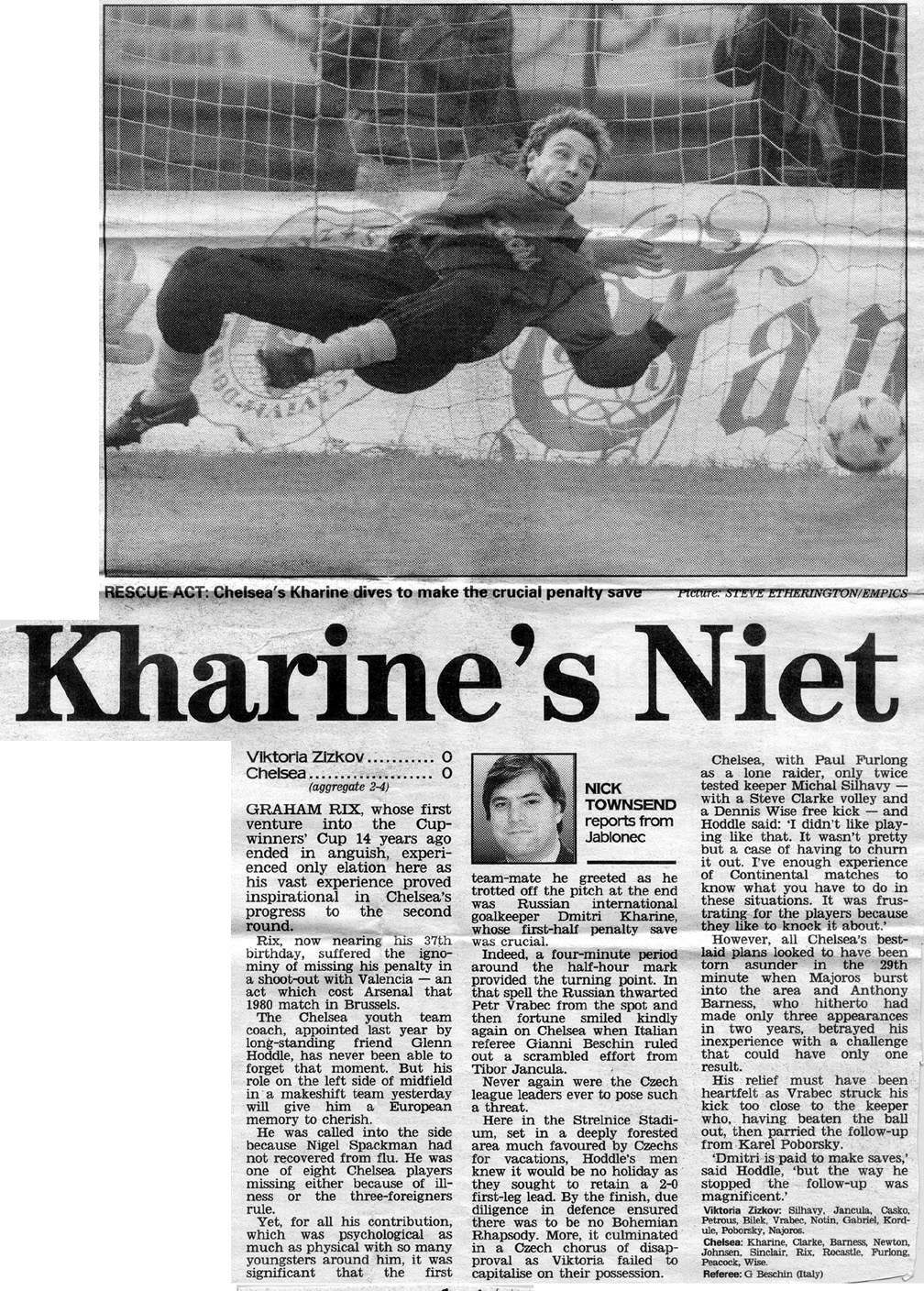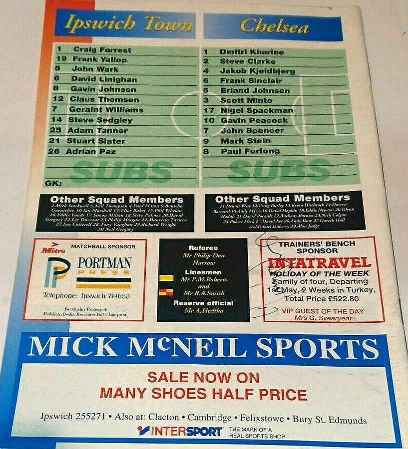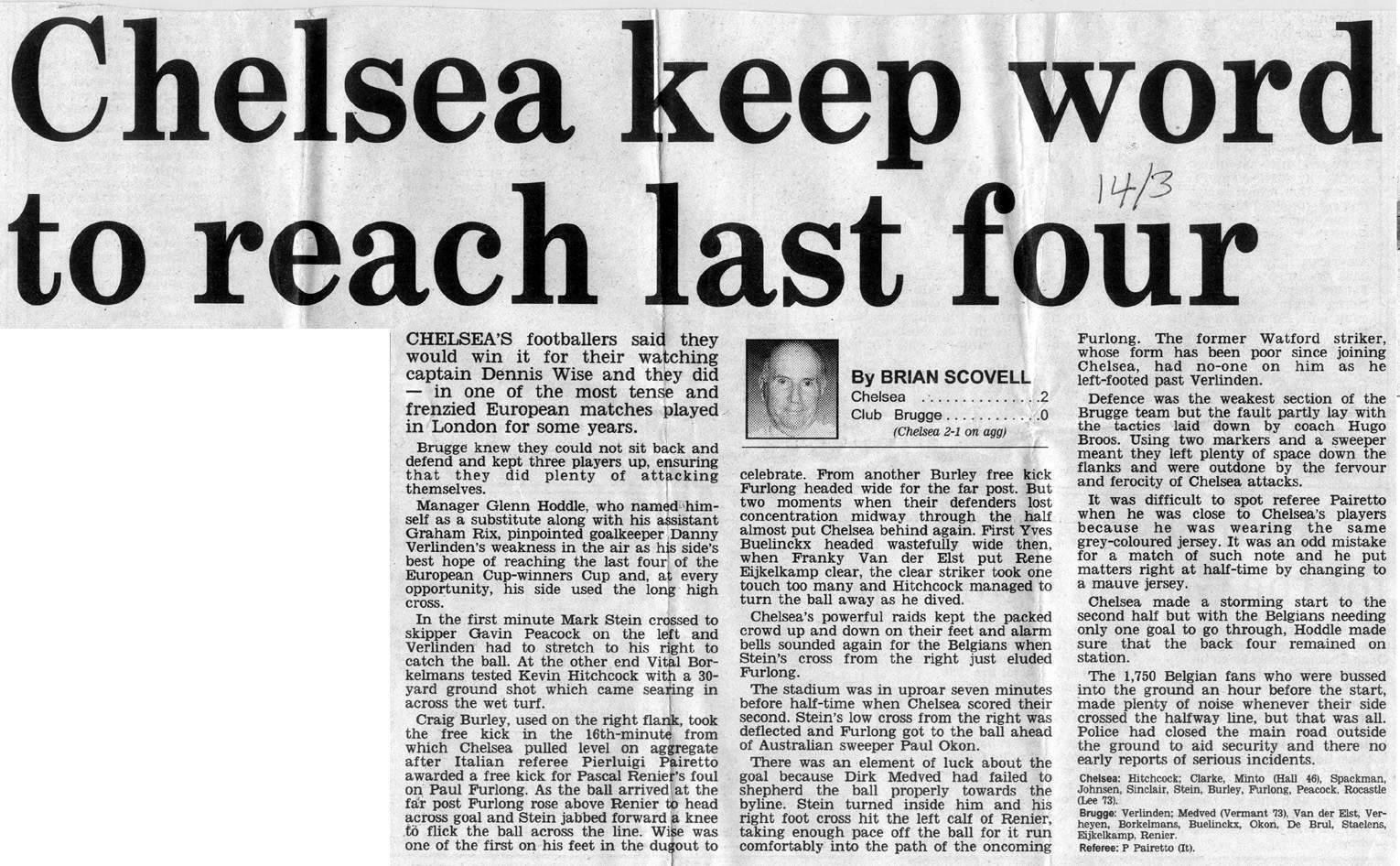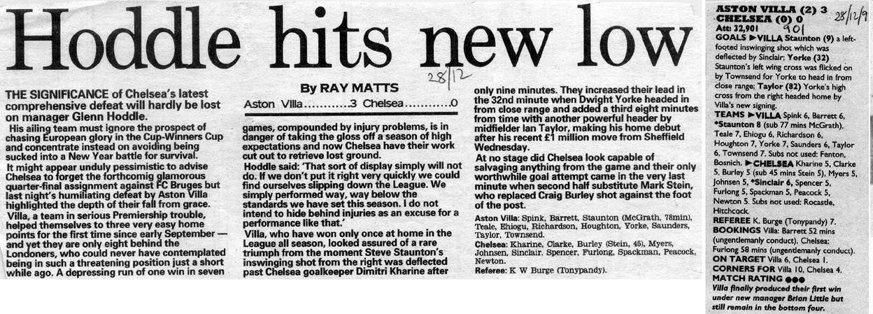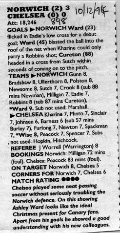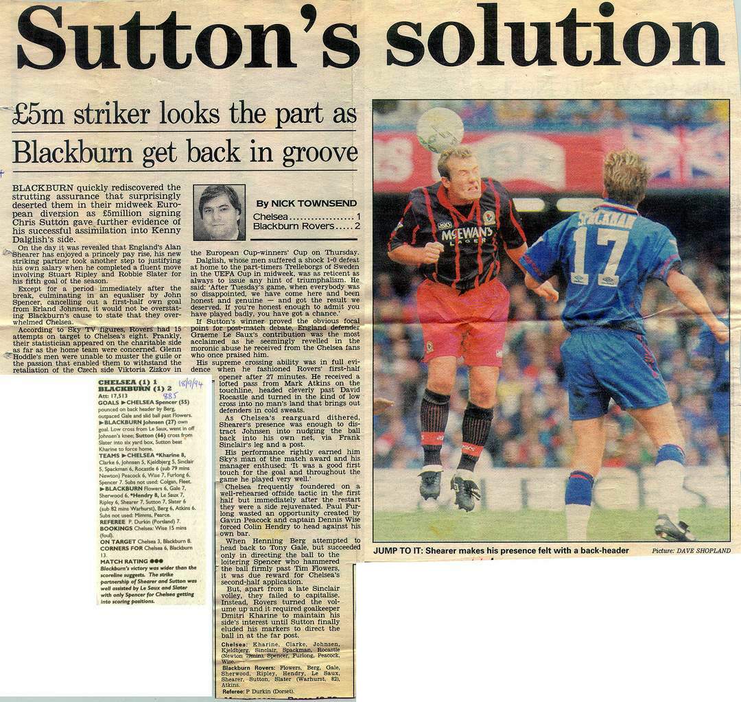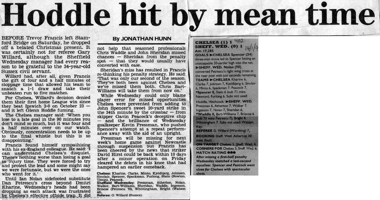 13 Kevin Hitchcock, 3 Scott Minto, 4 Jakob Kjeldbjerg, 6 Frank Sinclair, 8 Paul Furlong, 9 Mark Stein ( 7 John Spencer 82), 10 Gavin Peacock, 12 Craig Burley, 16 David Hopkin, 17 Nigel Spackman, 27 Gareth Hall |