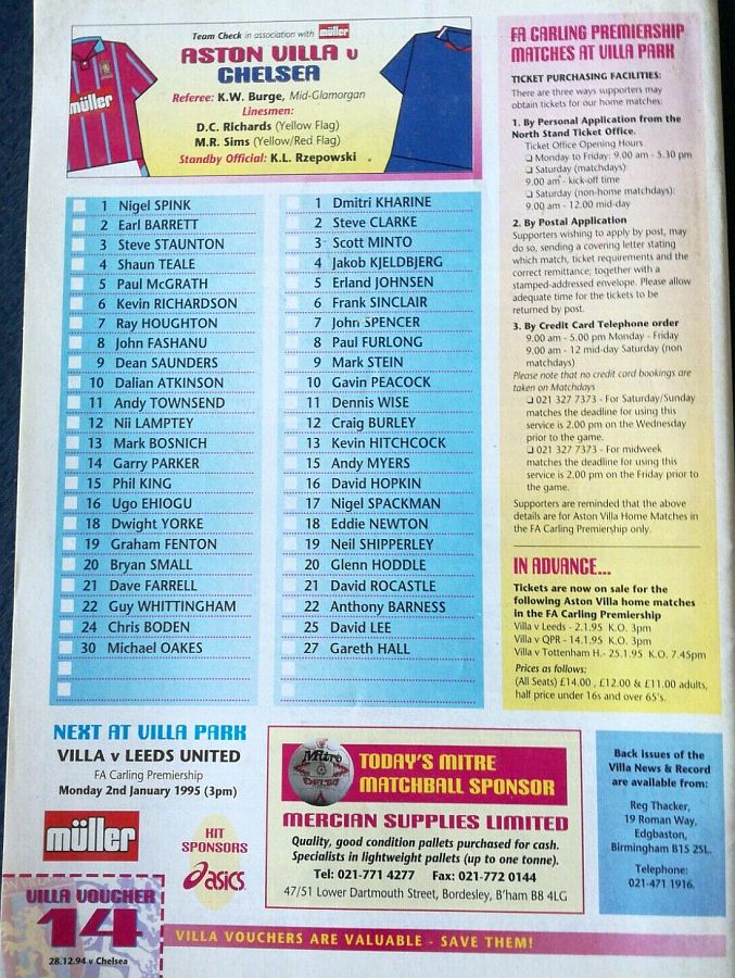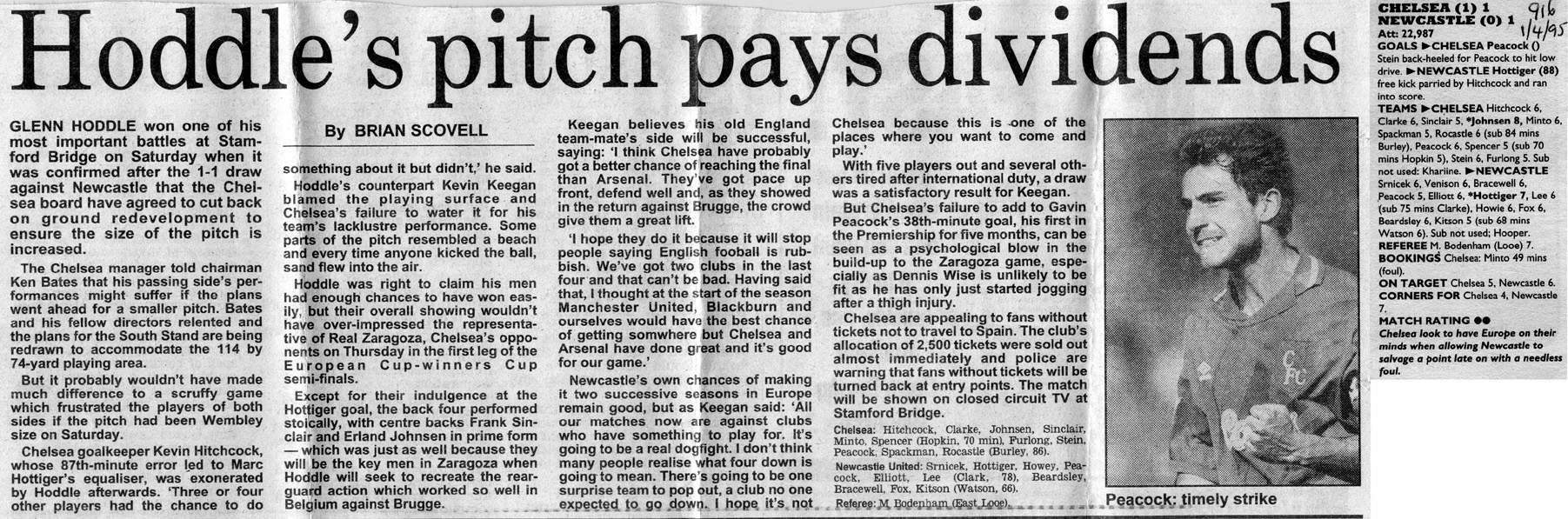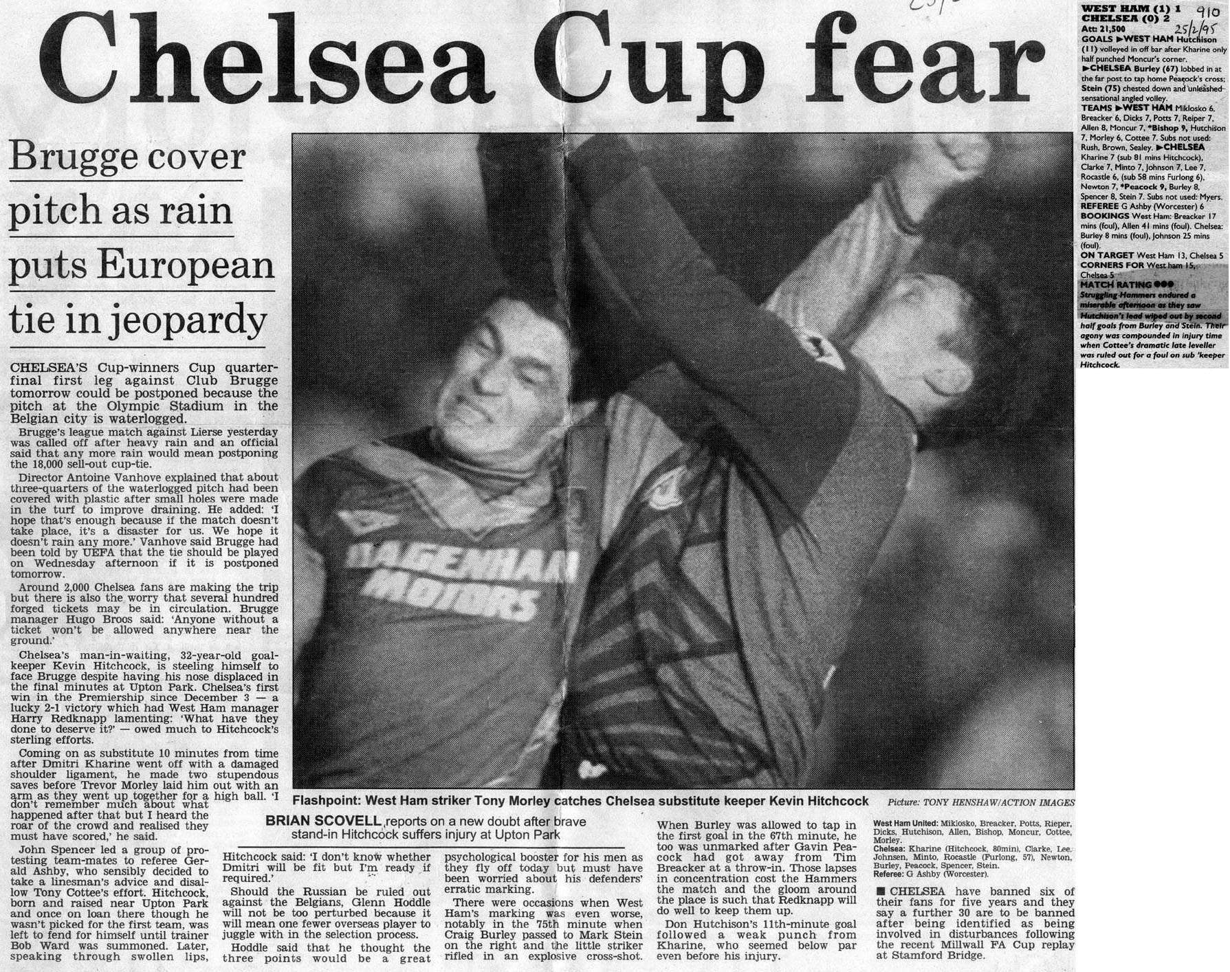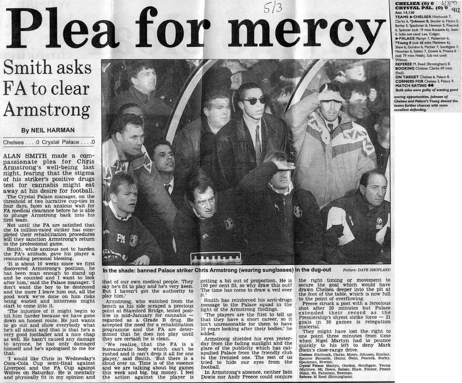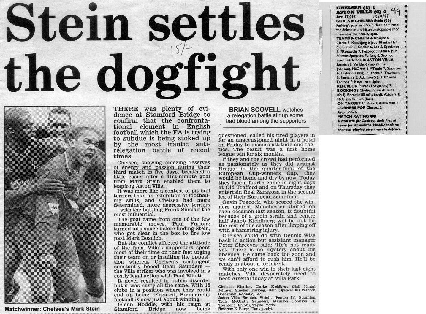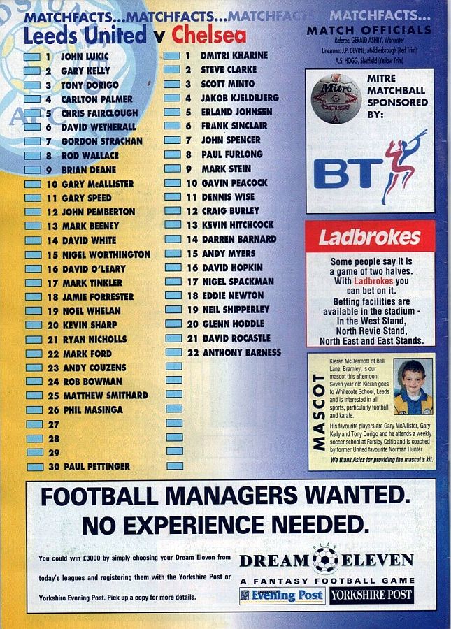 13 Kevin Hitchcock, 3 Scott Minto, 4 Jakob Kjeldbjerg, 6 Frank Sinclair, 8 Paul Furlong, 9 Mark Stein ( 7 John Spencer 82), 10 Gavin Peacock, 12 Craig Burley, 16 David Hopkin, 17 Nigel Spackman, 27 Gareth Hall |