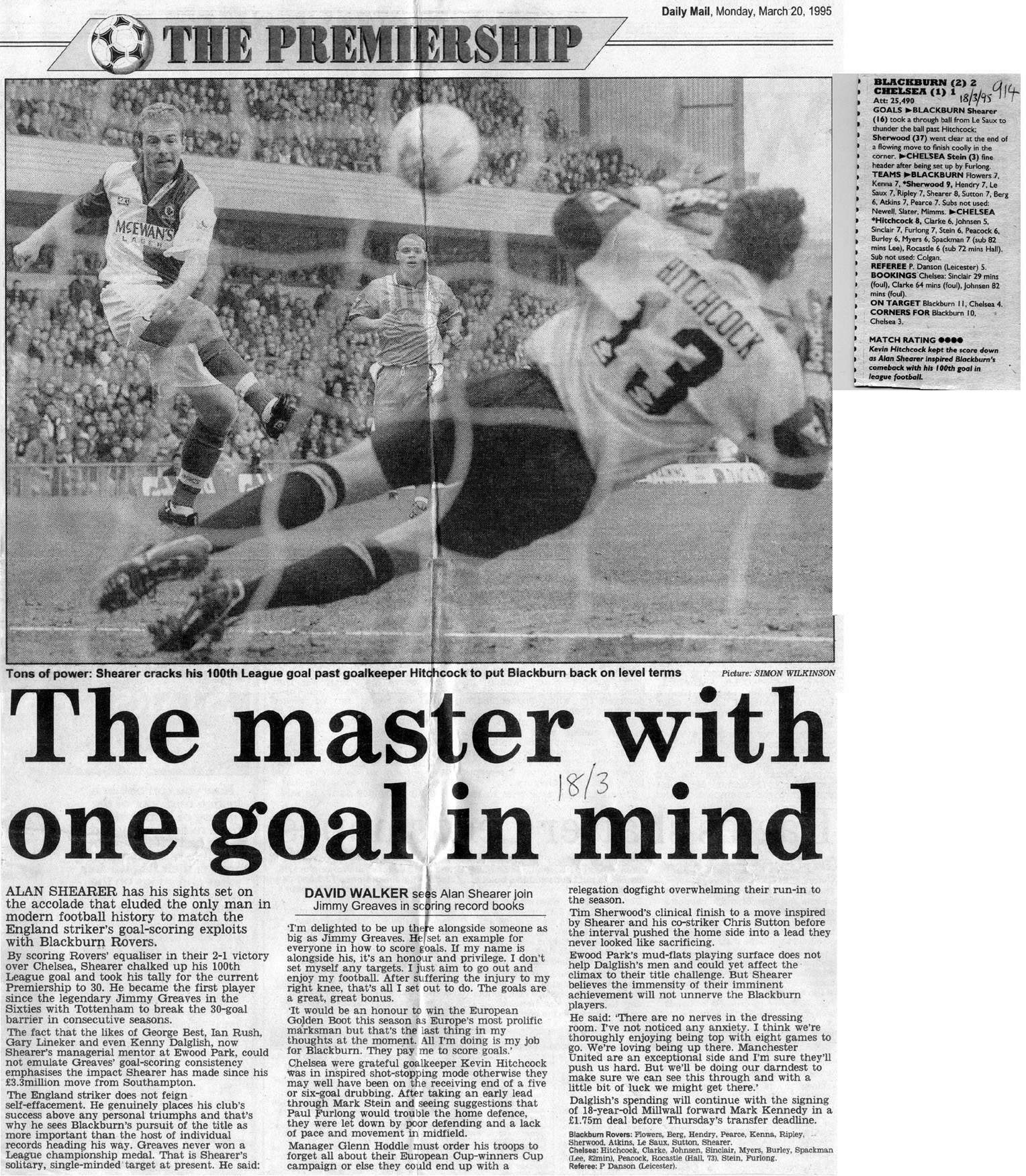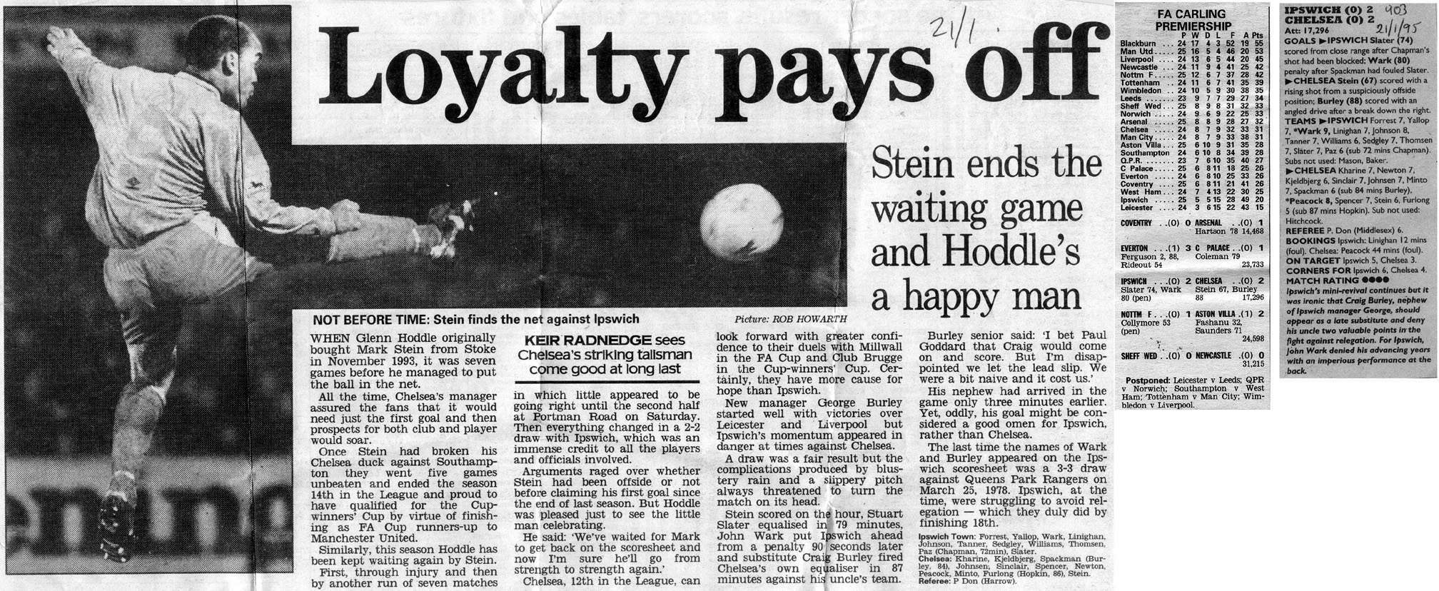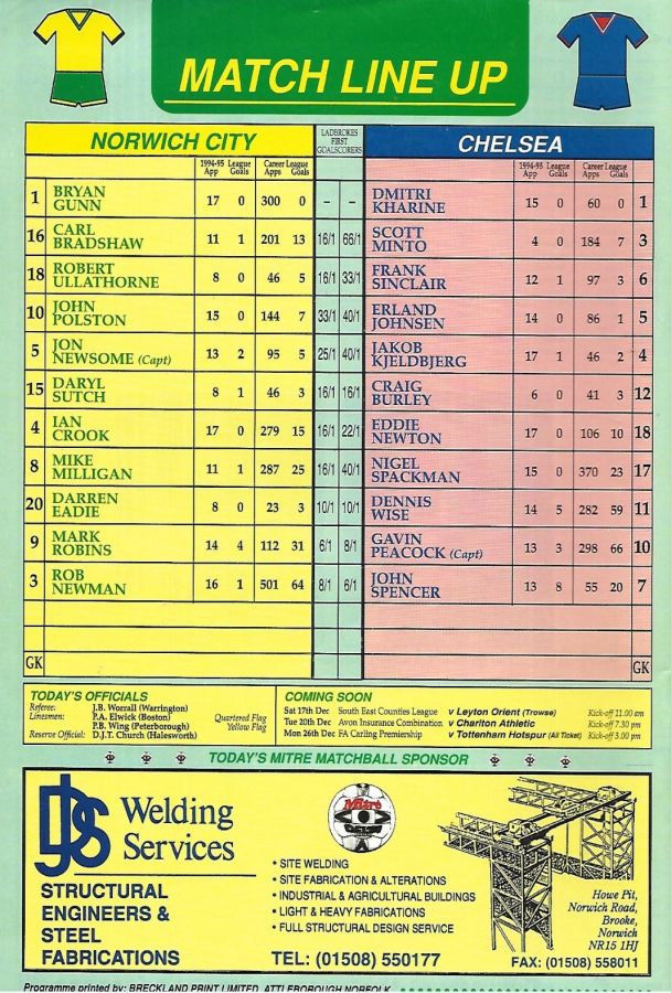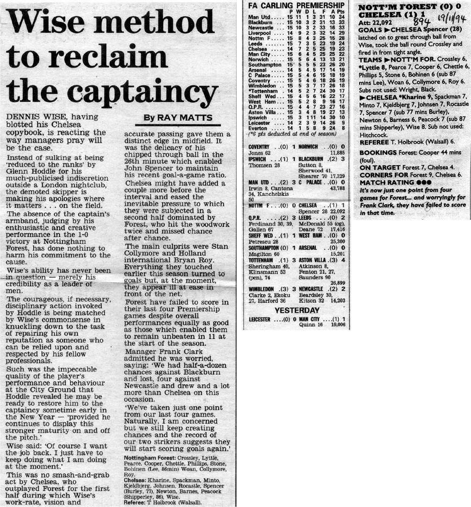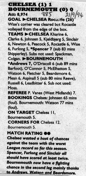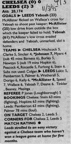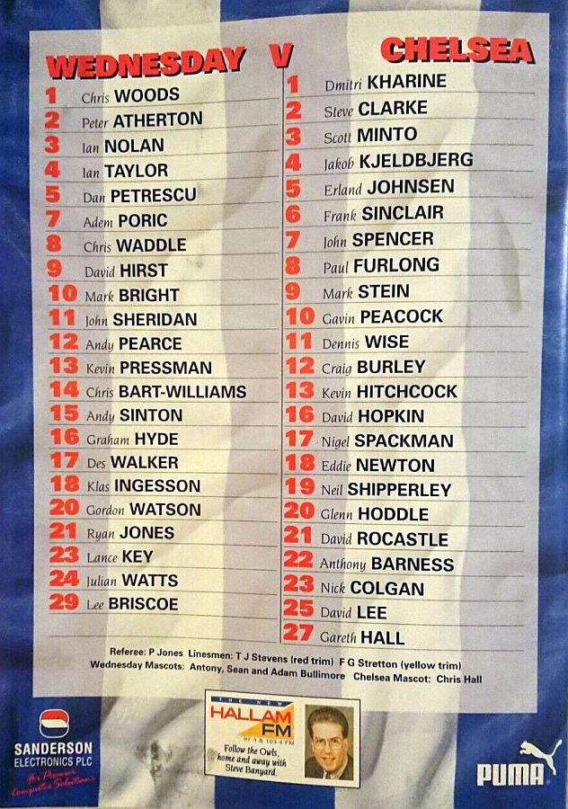13 Kevin Hitchcock, 2 Steve Clarke, 5 Erland Johnsen, 6 Frank Sinclair, 8 Paul Furlong ( 7 John Spencer 67), 9 Mark Stein, 10 Gavin Peacock, 17 Nigel Spackman, 21 David Rocastle (12 Craig Burley 60), 25 David Lee, 27 Gareth Hall |
