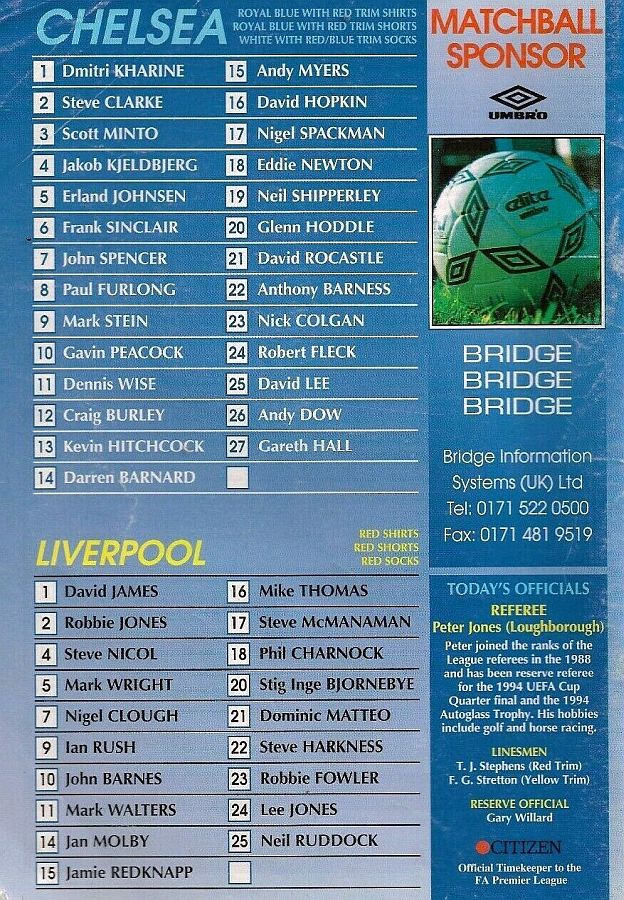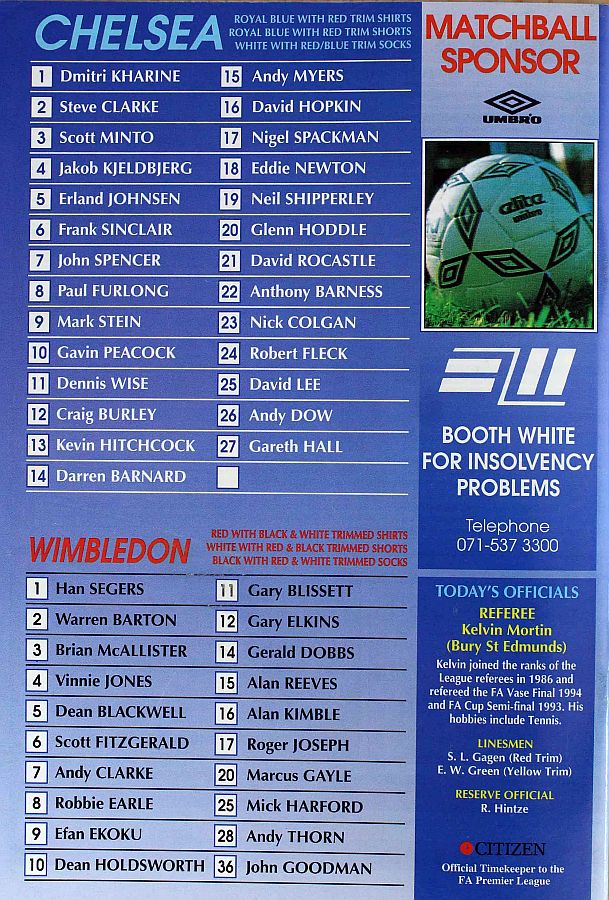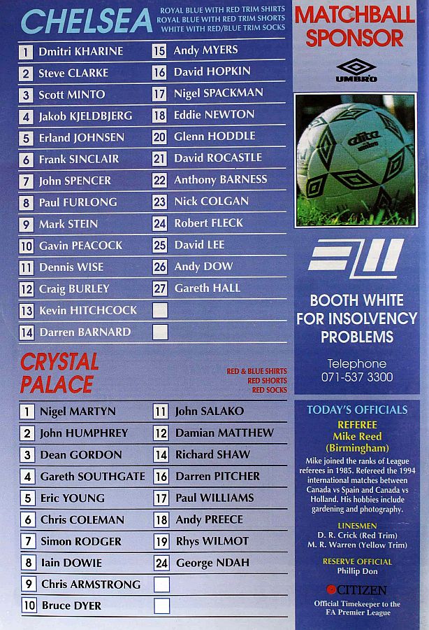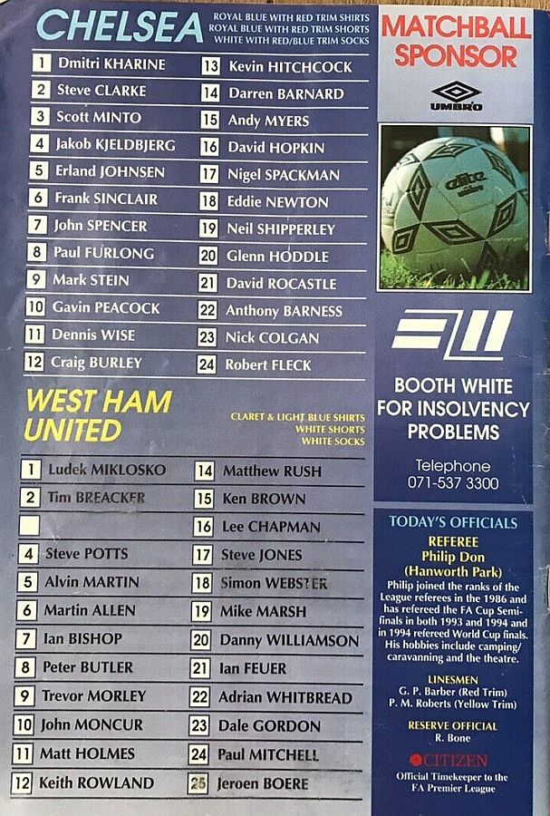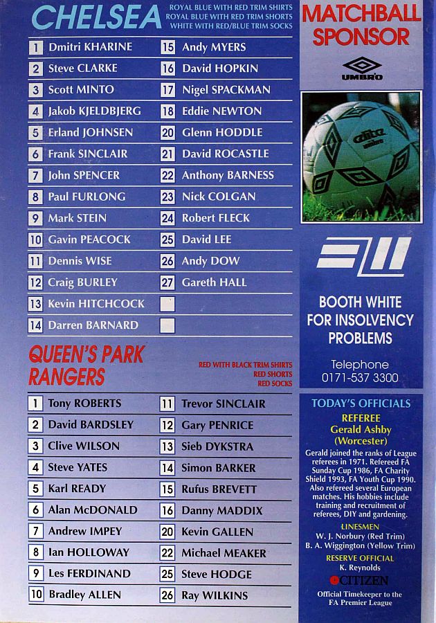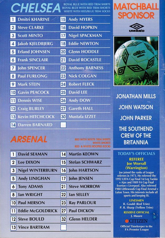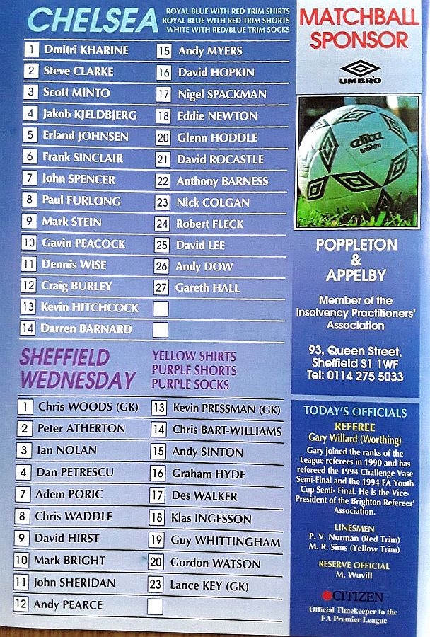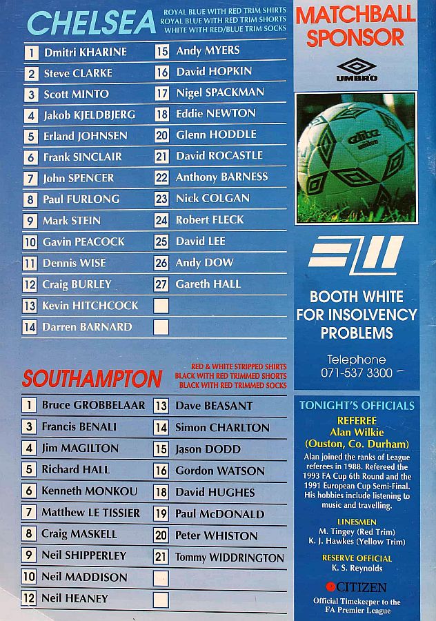 1 Dmitri Kharine, 2 Steve Clarke, 4 Jakob Kjeldbjerg, 5 Erland Johnsen, 6 Frank Sinclair, 7 John Spencer (18 Eddie Newton 87), 8 Paul Furlong, 10 Gavin Peacock, 11 Dennis Wise, 17 Nigel Spackman, 21 David Rocastle |