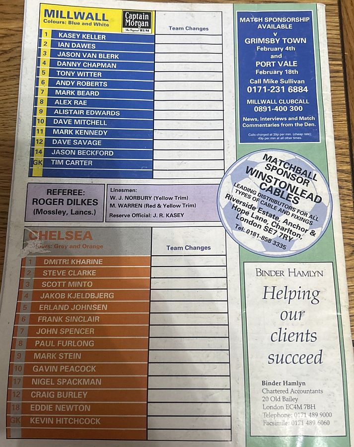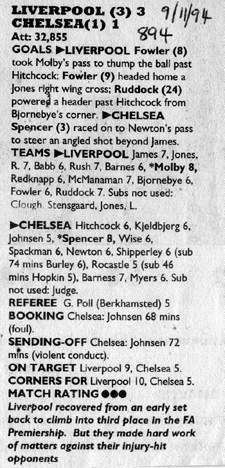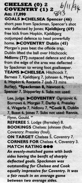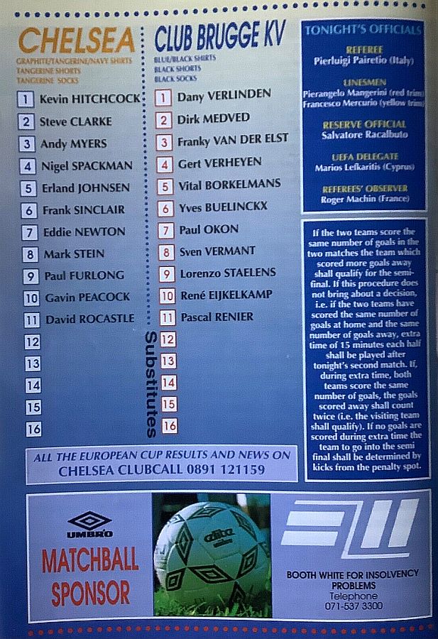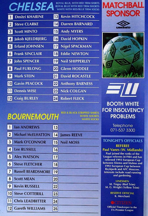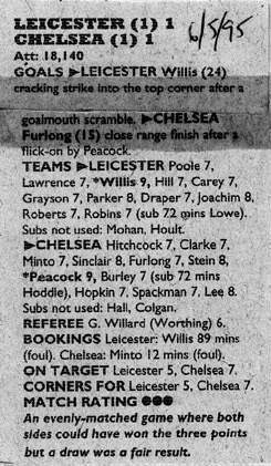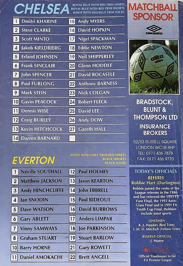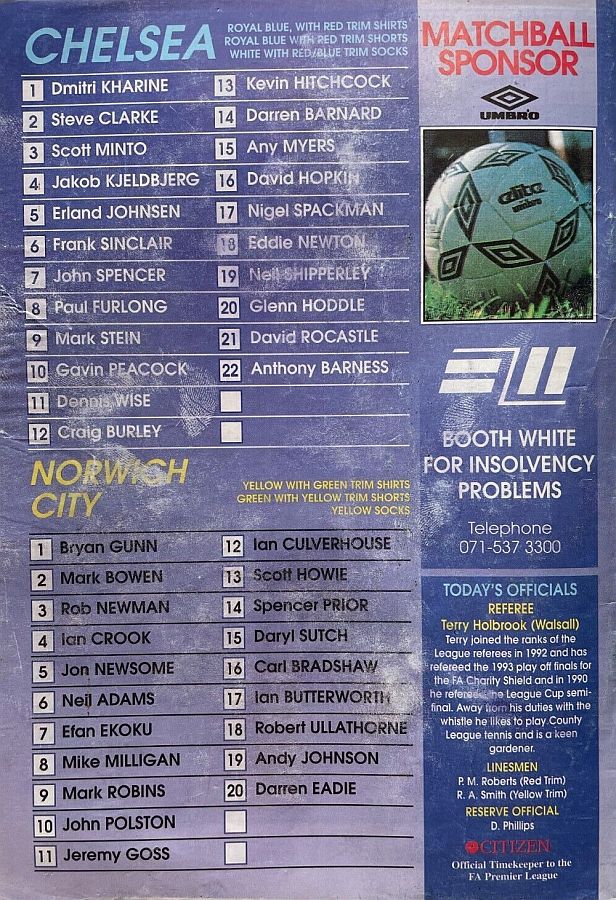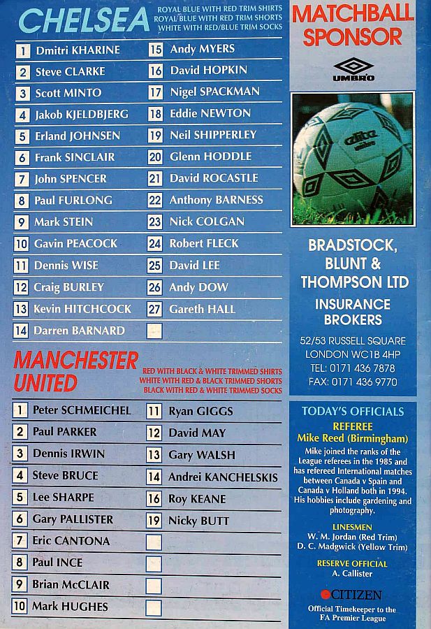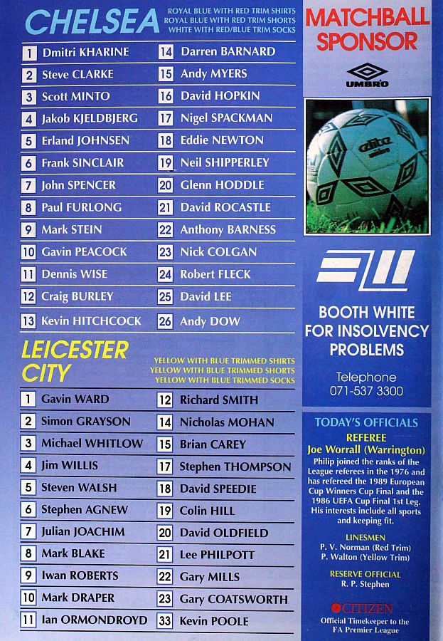 1 Dmitri Kharine, 2 Steve Clarke, 4 Jakob Kjeldbjerg, 5 Erland Johnsen, 6 Frank Sinclair, 7 John Spencer (18 Eddie Newton 87), 8 Paul Furlong, 10 Gavin Peacock, 11 Dennis Wise, 17 Nigel Spackman, 21 David Rocastle |