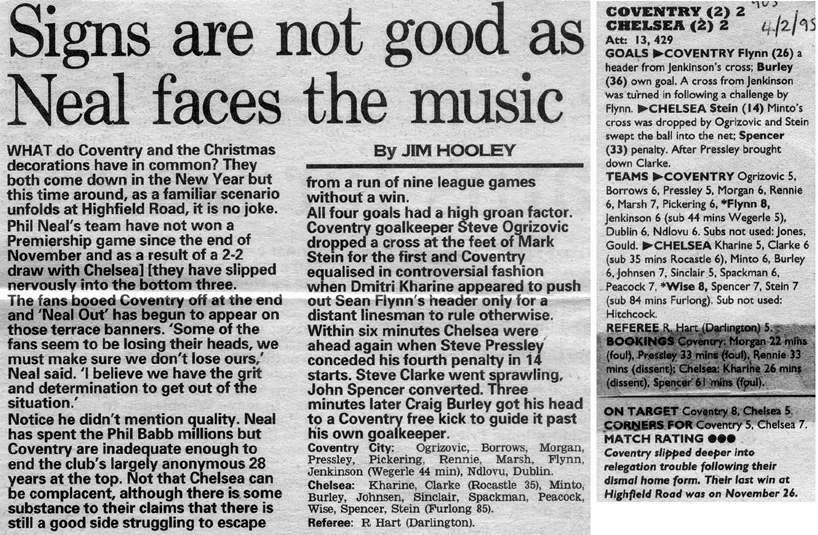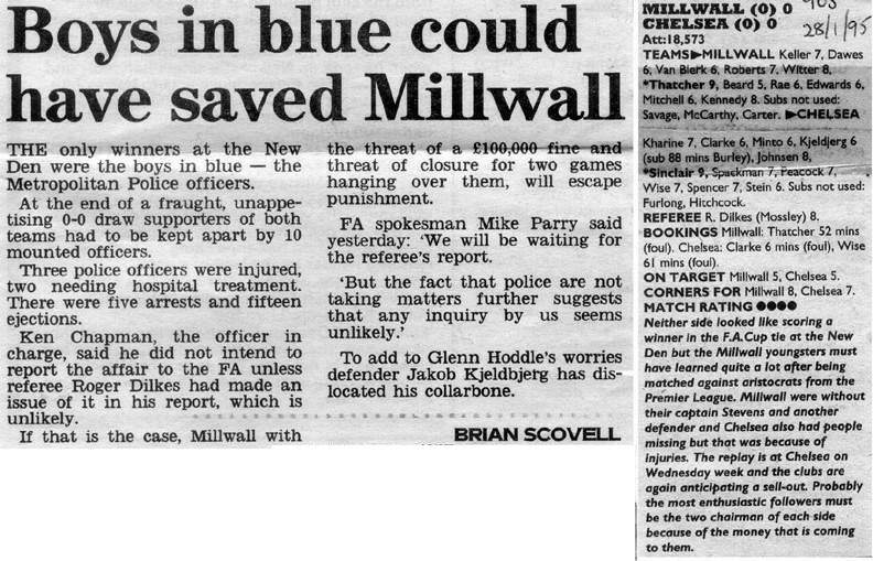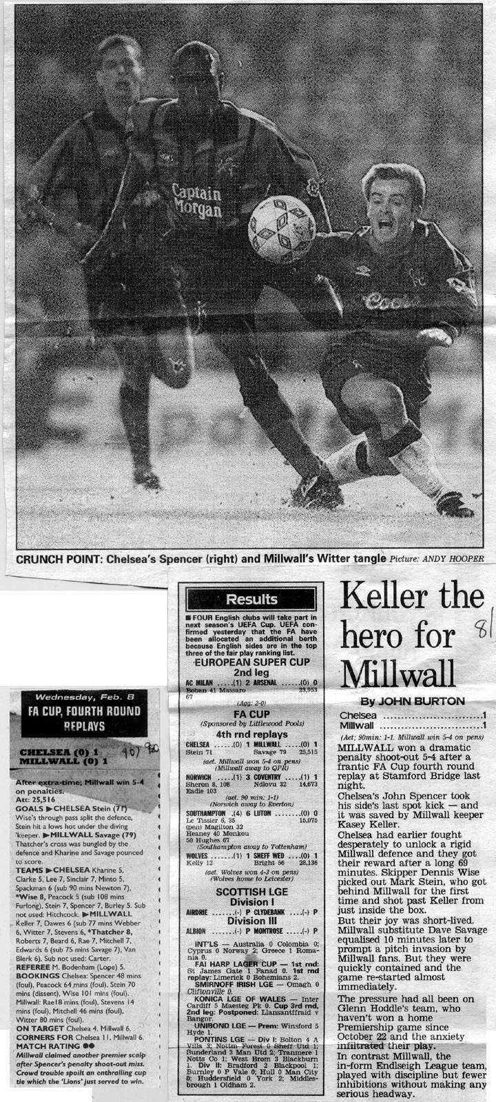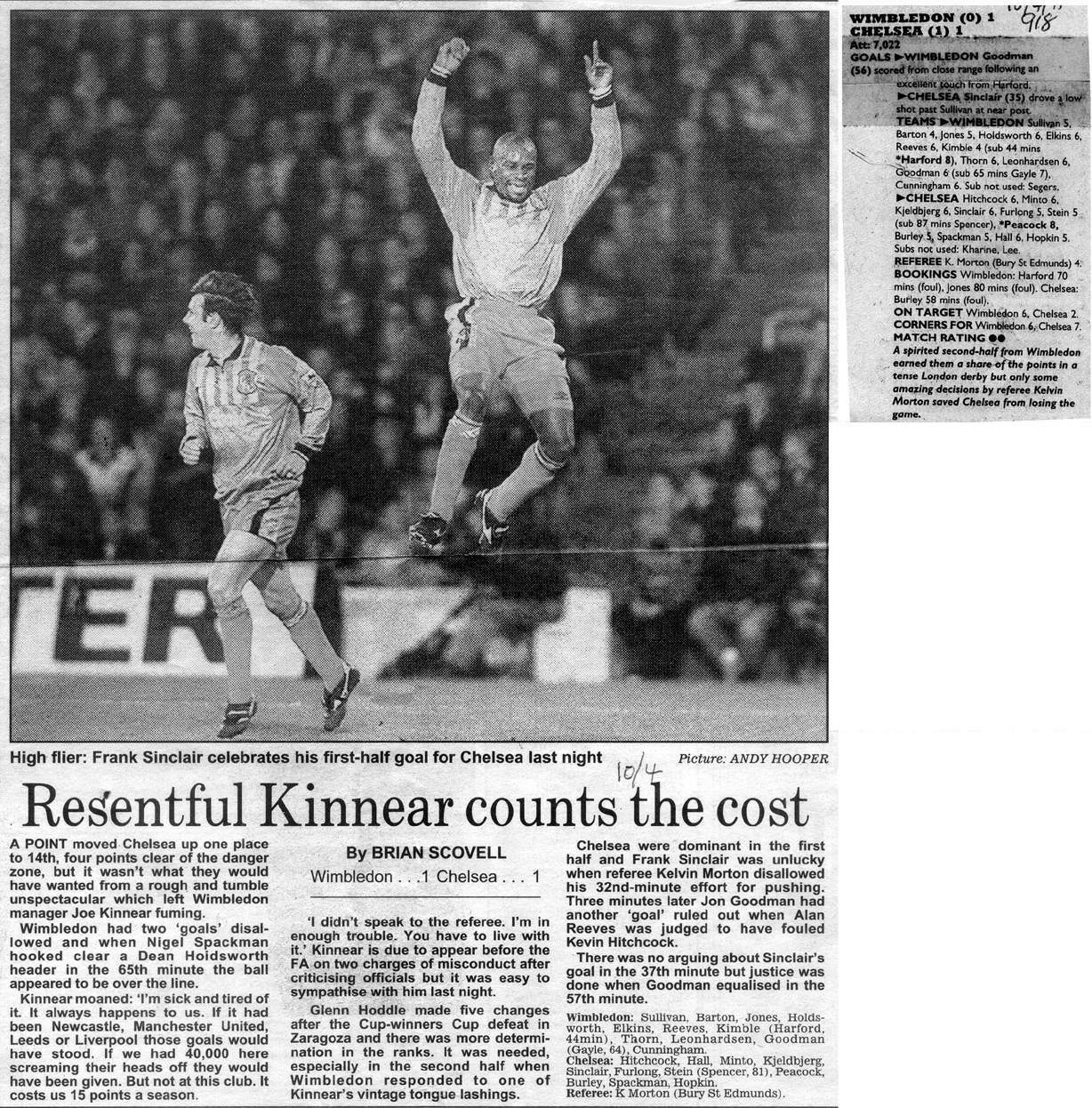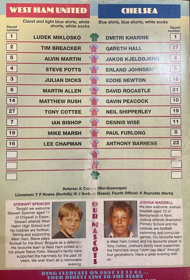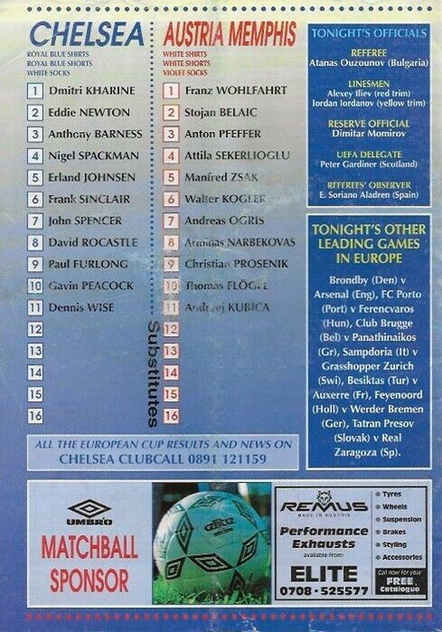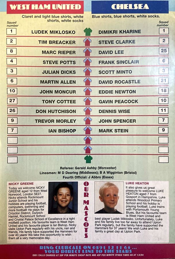 1 Dmitri Kharine, 2 Steve Clarke, 4 Jakob Kjeldbjerg, 5 Erland Johnsen, 6 Frank Sinclair, 7 John Spencer (18 Eddie Newton 87), 8 Paul Furlong, 10 Gavin Peacock, 11 Dennis Wise, 17 Nigel Spackman, 21 David Rocastle |