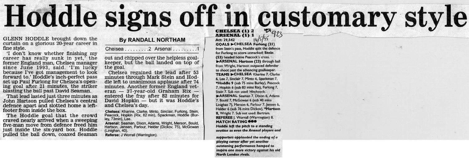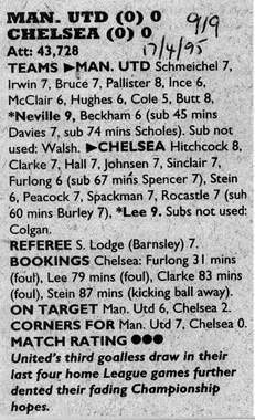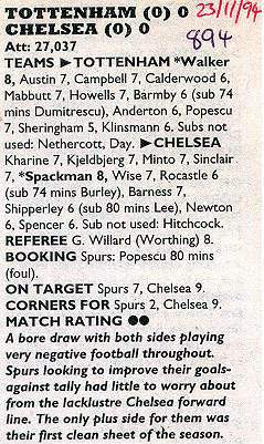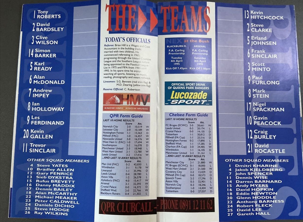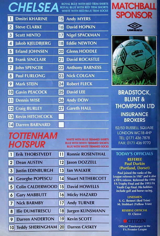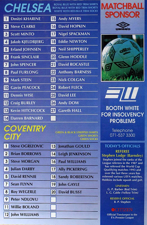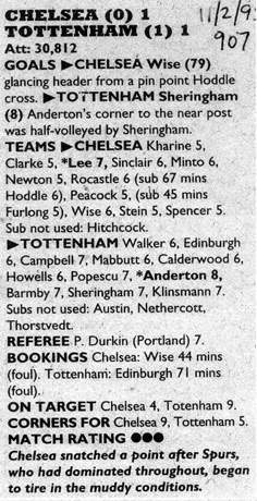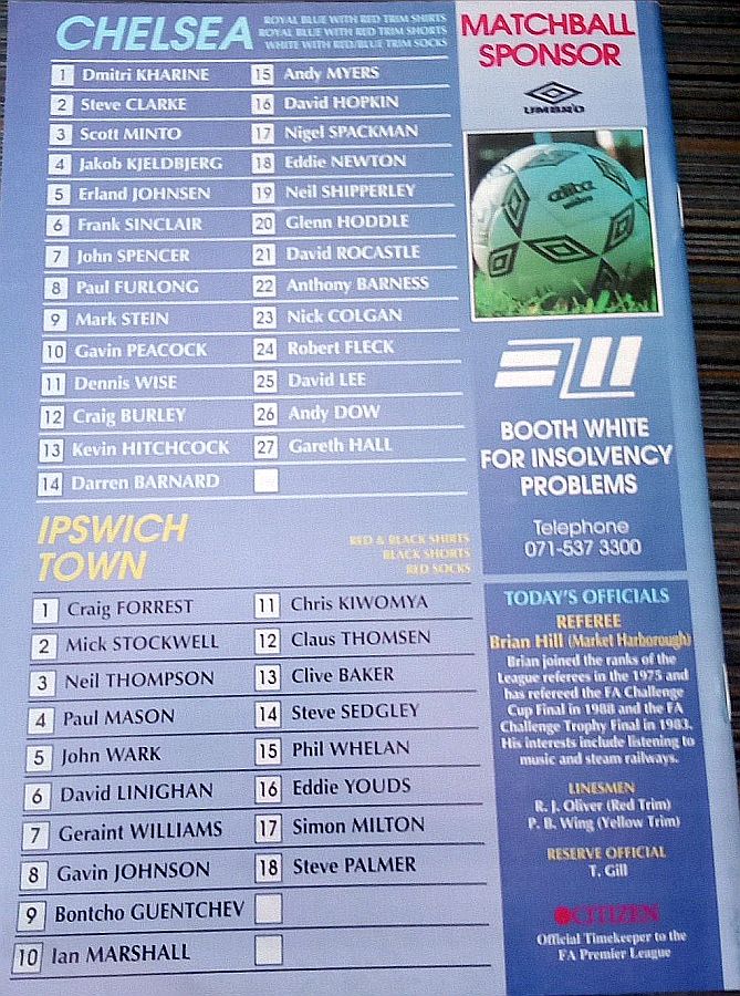 13 Kevin Hitchcock, 2 Steve Clarke, 3 Scott Minto, 5 Erland Johnsen, 6 Frank Sinclair, 7 John Spencer ( 9 Mark Stein 68), 8 Paul Furlong, 10 Gavin Peacock, 15 Andy Myers, 17 Nigel Spackman, 21 David Rocastle (20 Glenn Hoddle 64) |