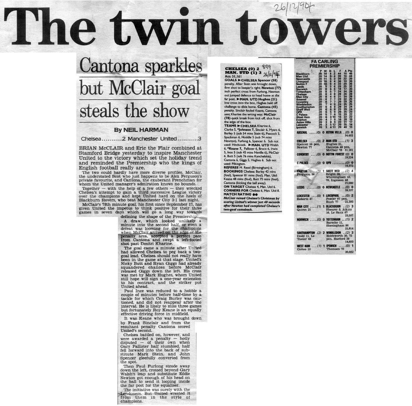 Peter Schmeichel, Gary Neville, Denis Irwin, Steve Bruce, Gary Pallister, Paul Ince, Nicky Butt, Andy Cole, Brian McClair, Mark Hughes, David Beckham (Simon Davies 46) (Paul Scholes 74) |