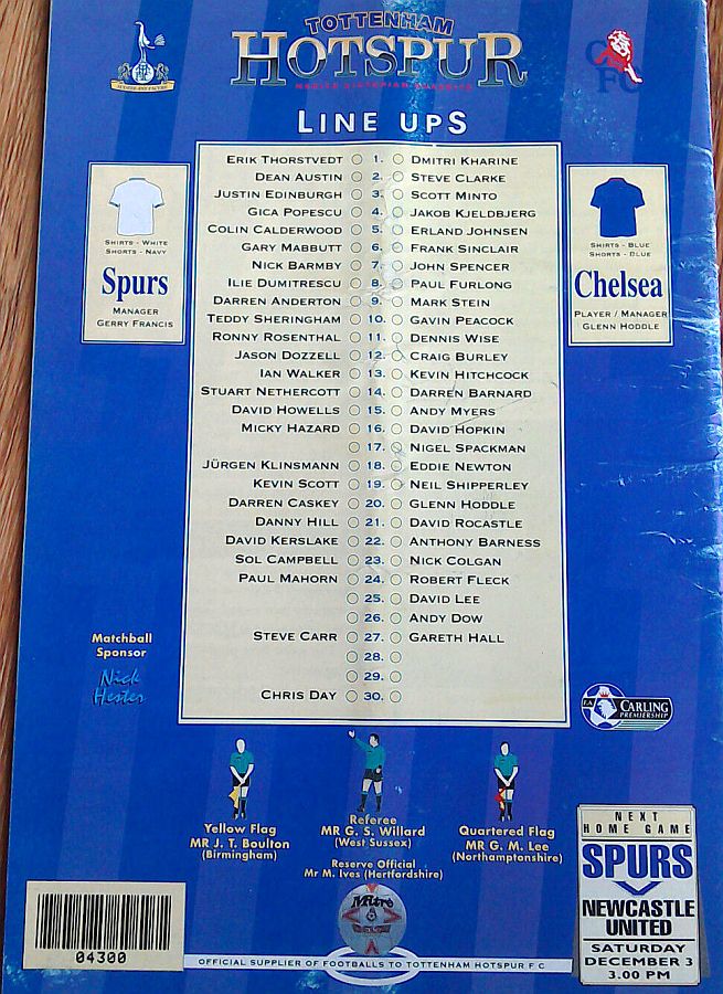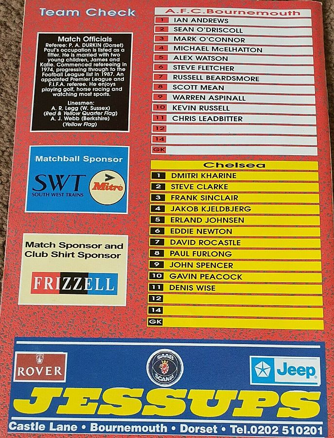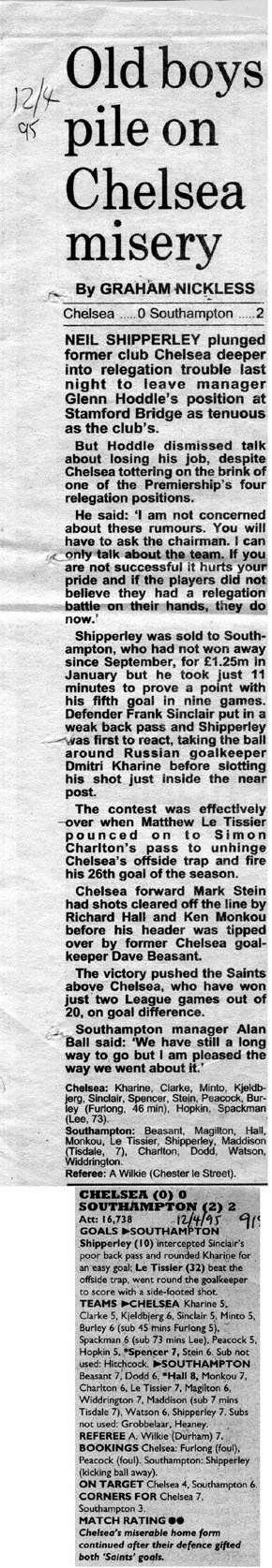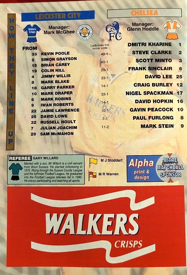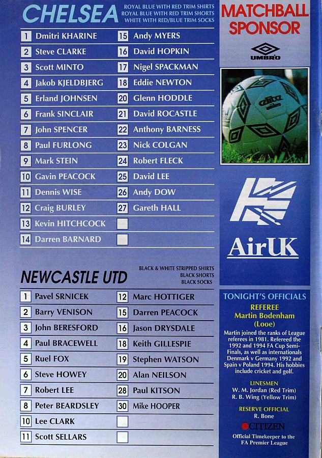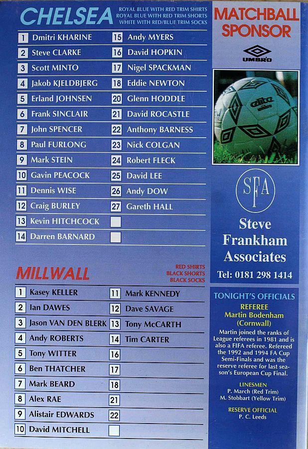 1 Dmitri Kharine, 2 Steve Clarke, 4 Jakob Kjeldbjerg, 5 Erland Johnsen, 6 Frank Sinclair (18 Eddie Newton 89), 8 Paul Furlong, 10 Gavin Peacock, 11 Dennis Wise, 17 Nigel Spackman, 19 Neil Shipperley (20 Glenn Hoddle 65), 21 David Rocastle |