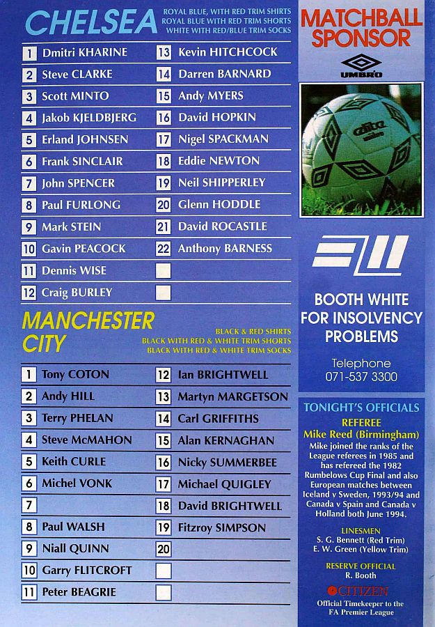 1 Dmitri Kharine, 2 Steve Clarke, 4 Jakob Kjeldbjerg, 5 Erland Johnsen, 6 Frank Sinclair, 7 John Spencer, 8 Paul Furlong, 10 Gavin Peacock, 11 Dennis Wise, 17 Nigel Spackman, 21 David Rocastle (18 Eddie Newton 79) |