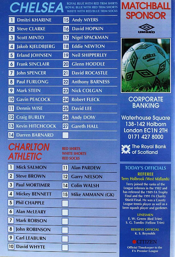 1 Dmitri Kharine, 2 Steve Clarke, 4 Jakob Kjeldbjerg (27 Gareth Hall 30), 5 Erland Johnsen, 6 Frank Sinclair, 8 Paul Furlong, 9 Mark Stein ( 7 John Spencer 80), 10 Gavin Peacock, 17 Nigel Spackman, 21 David Rocastle, 25 David Lee |