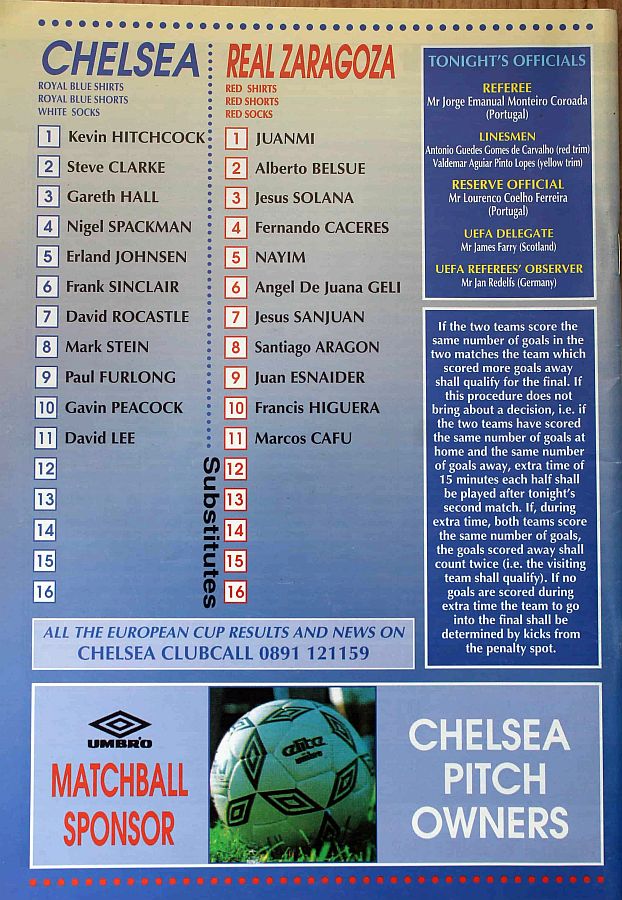 1 Dmitri Kharine, 2 Steve Clarke, 3 Scott Minto, 6 Frank Sinclair, 8 Paul Furlong, 9 Mark Stein, 10 Gavin Peacock, 16 David Hopkin (31 Graham Rix 82), 17 Nigel Spackman, 20 Glenn Hoddle (12 Craig Burley 73), 25 David Lee |