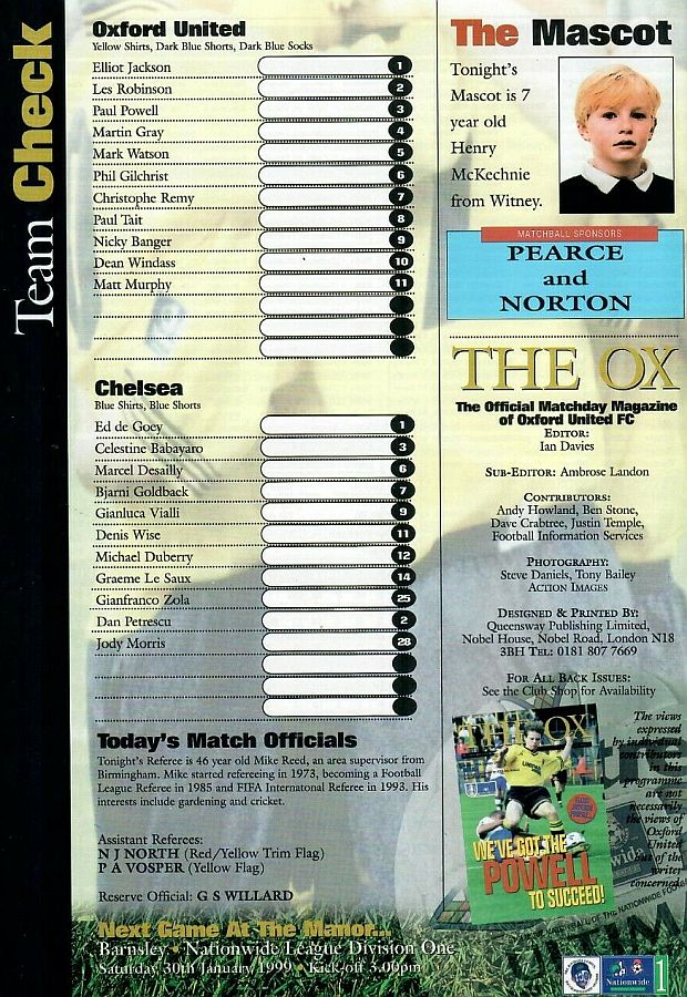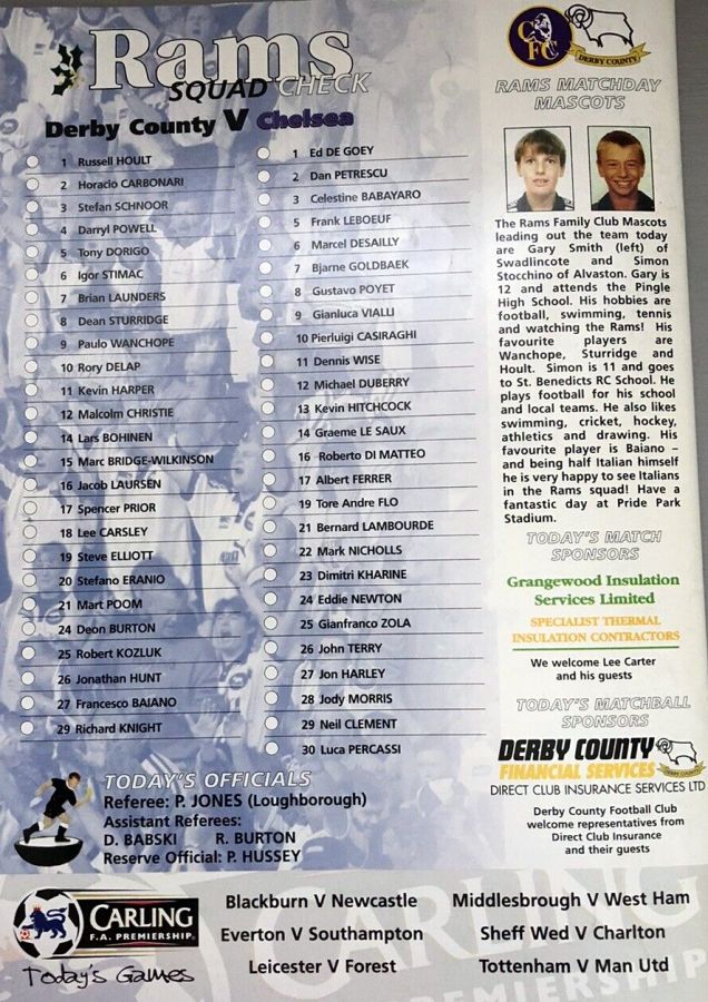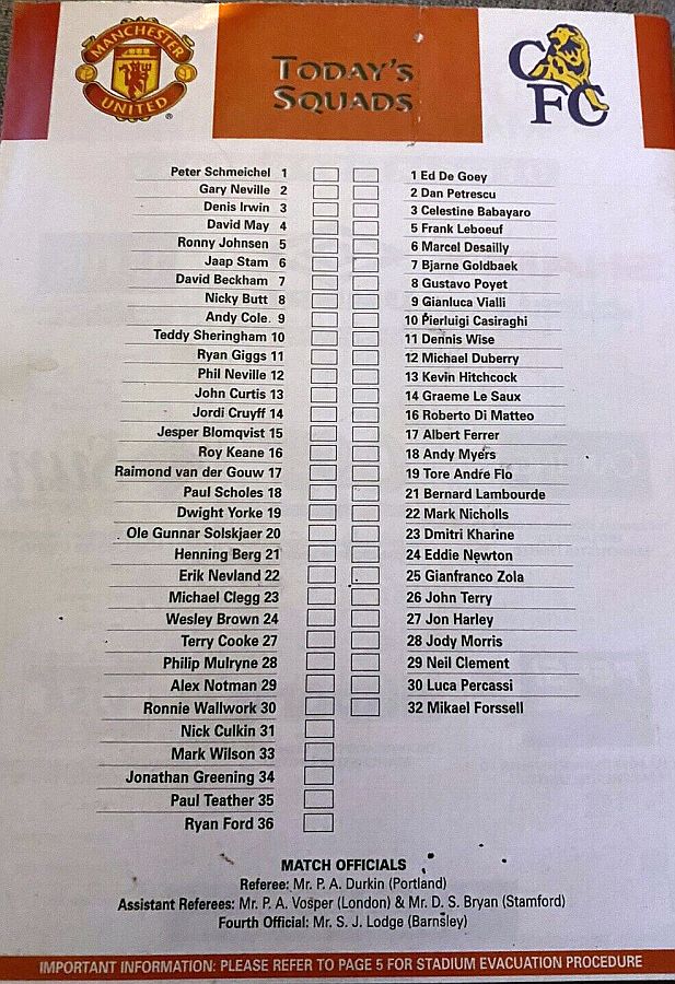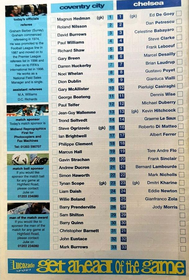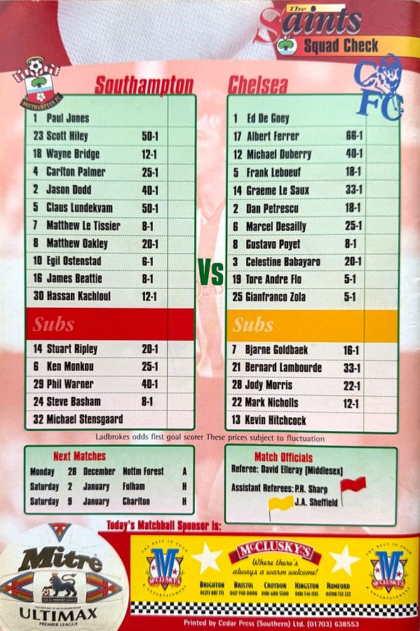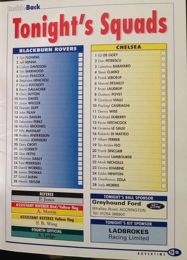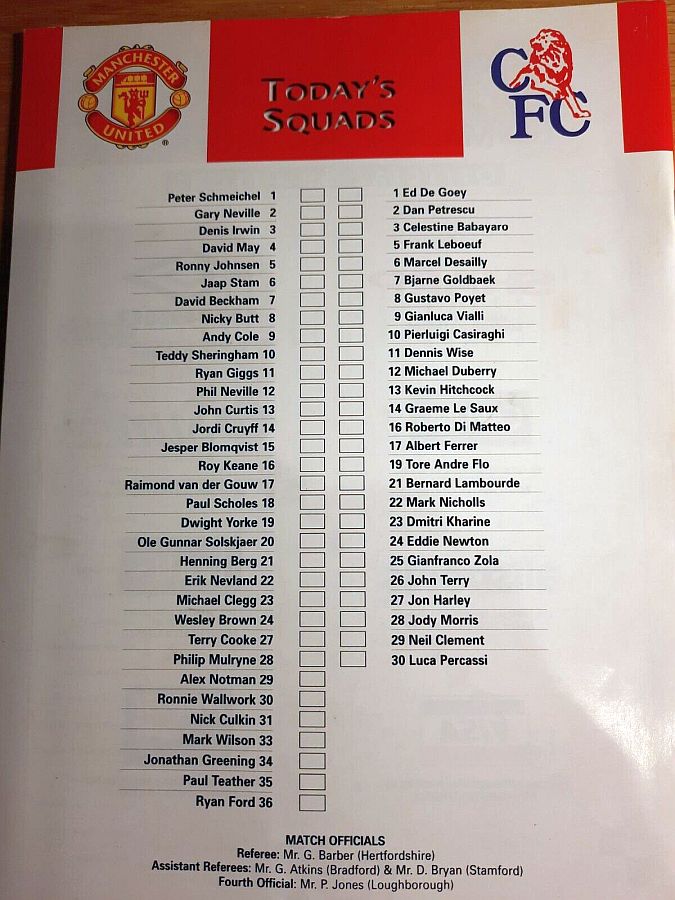 1 Eduard De Goey, 2 Dan Petrescu (24 Eddie Newton 86), 5 Frank Leboeuf, 8 Gus Poyet, 12 Michael Duberry, 14 Graeme Le Saux, 16 Roberto DiMatteo (28 Jody Morris 46), 19 Tore Andre Flo, 21 Bernard Lambourde, 25 Gianfranco Zola (22 Mark Nicholls 90), 7 Bjarne Goldbaek |