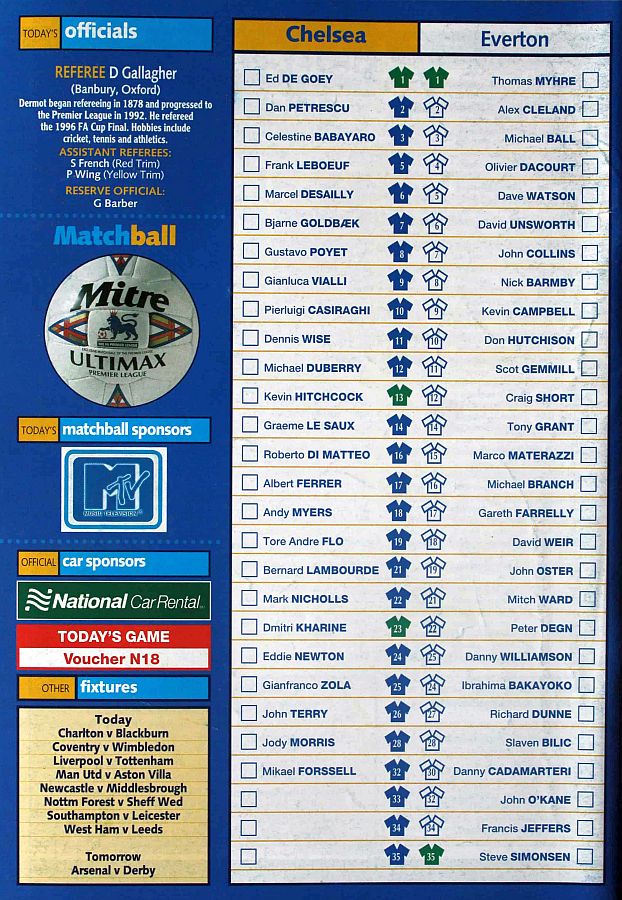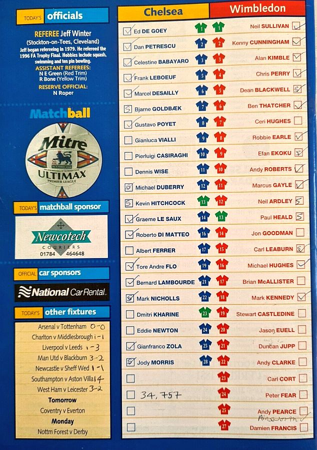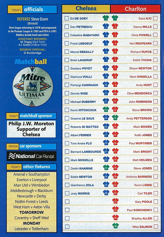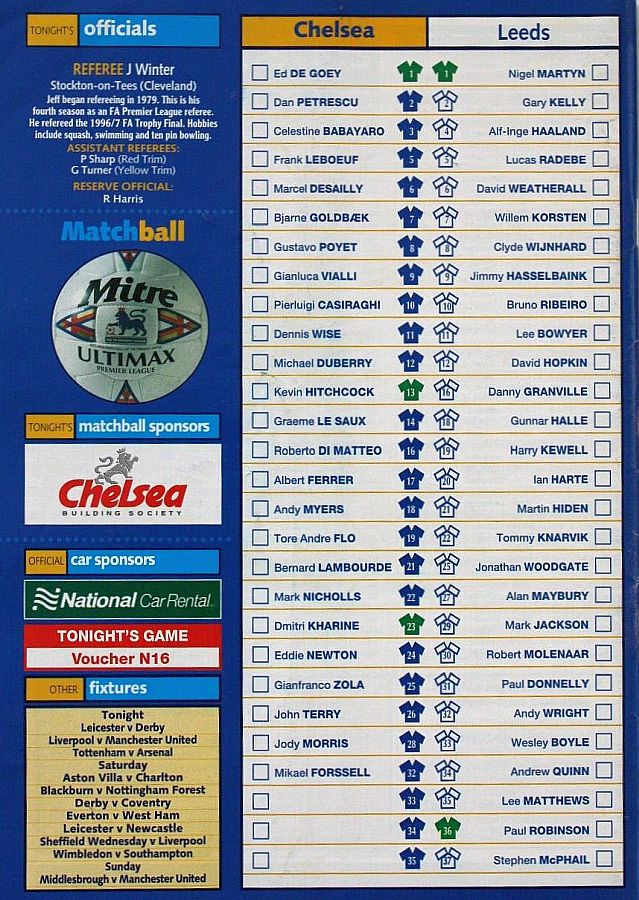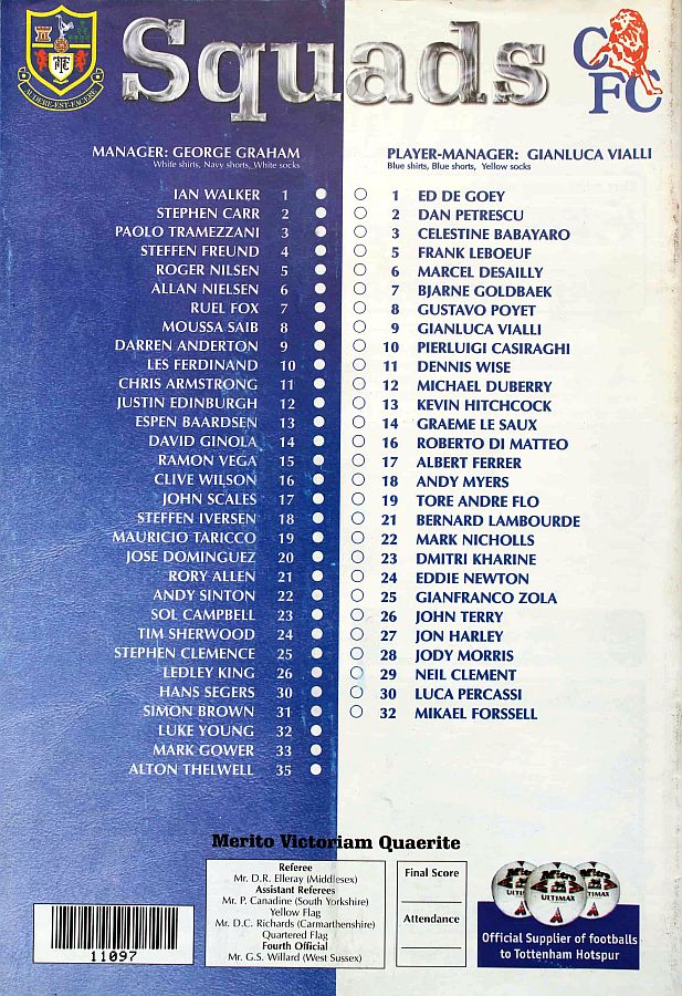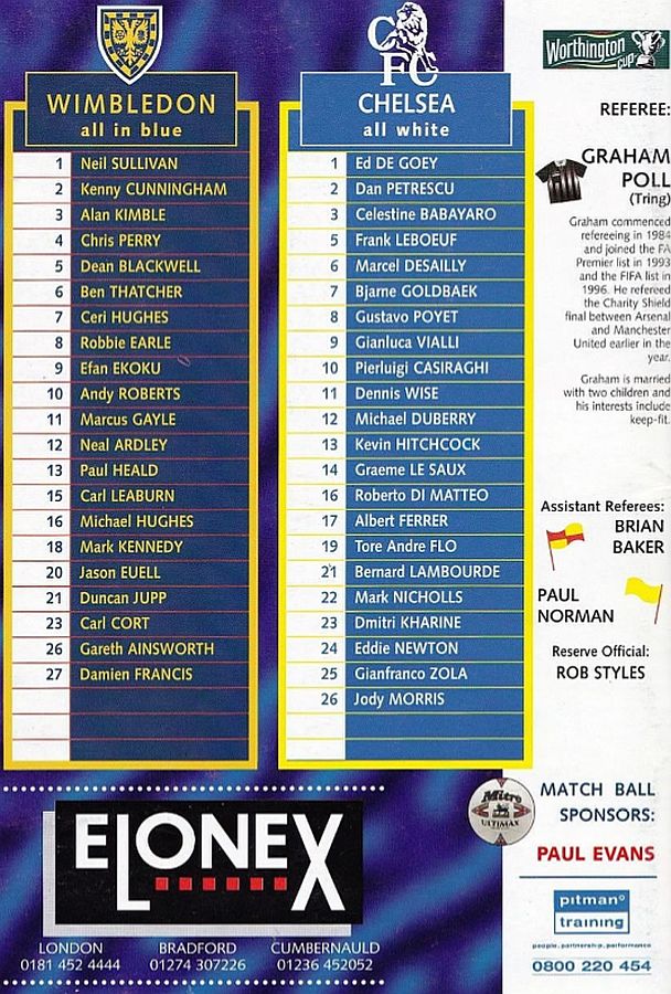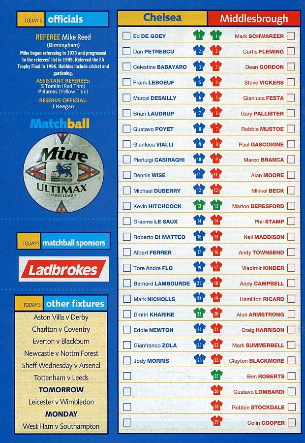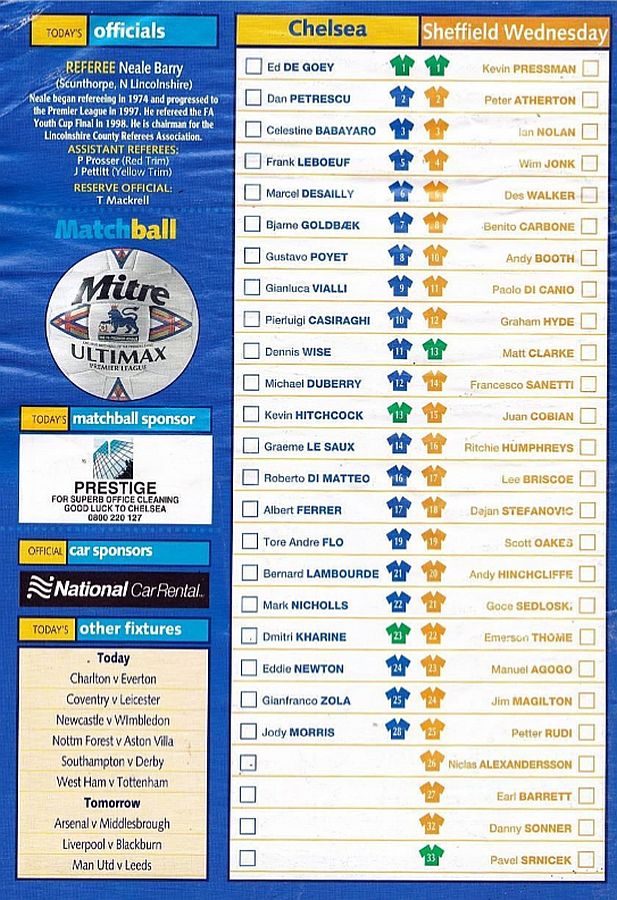 1 Eduard De Goey, 2 Dan Petrescu (16 Roberto DiMatteo 46), 6 Marcel Desailly, 8 Gus Poyet (28 Jody Morris 59), 11 Dennis Wise, 12 Michael Duberry, 14 Graeme Le Saux, 17 Albert Ferrer, 19 Tore Andre Flo, 25 Gianfranco Zola, 7 Bjarne Goldbaek |