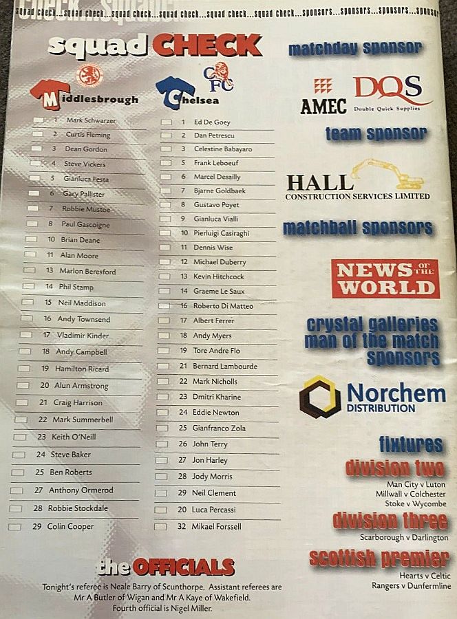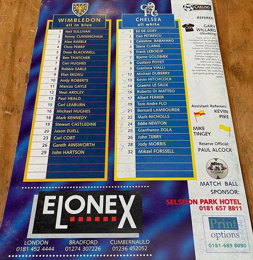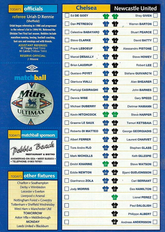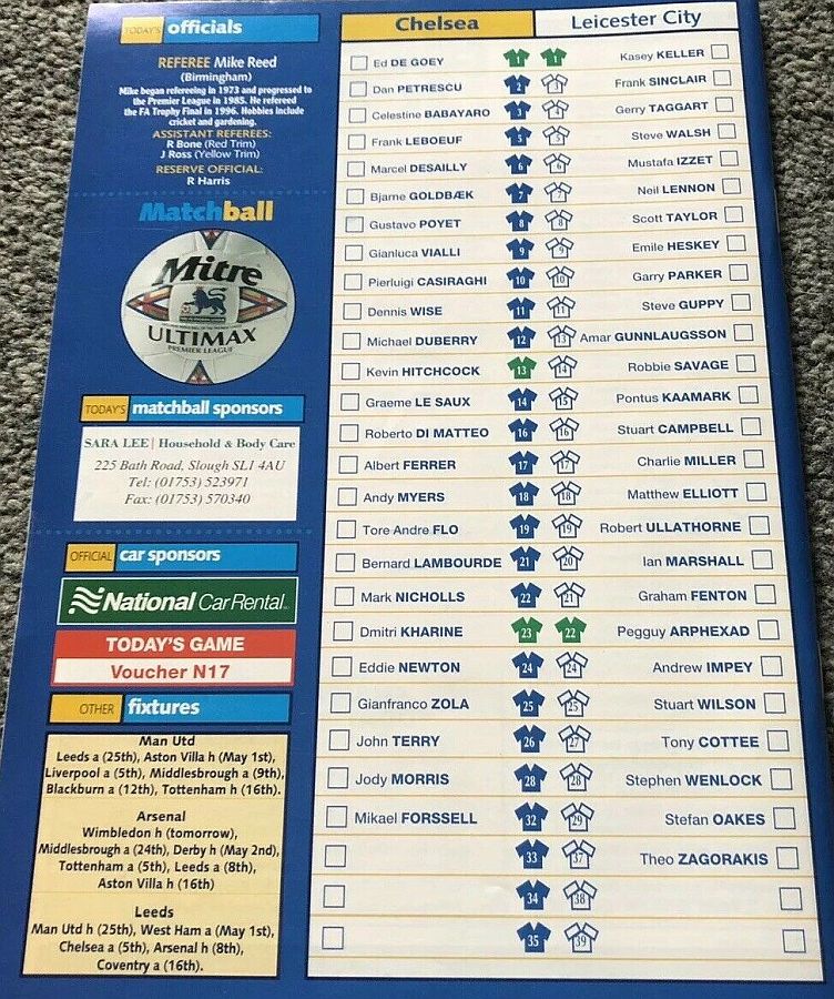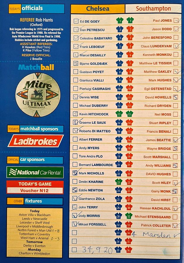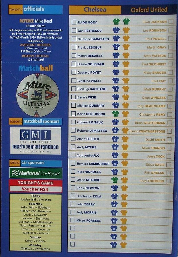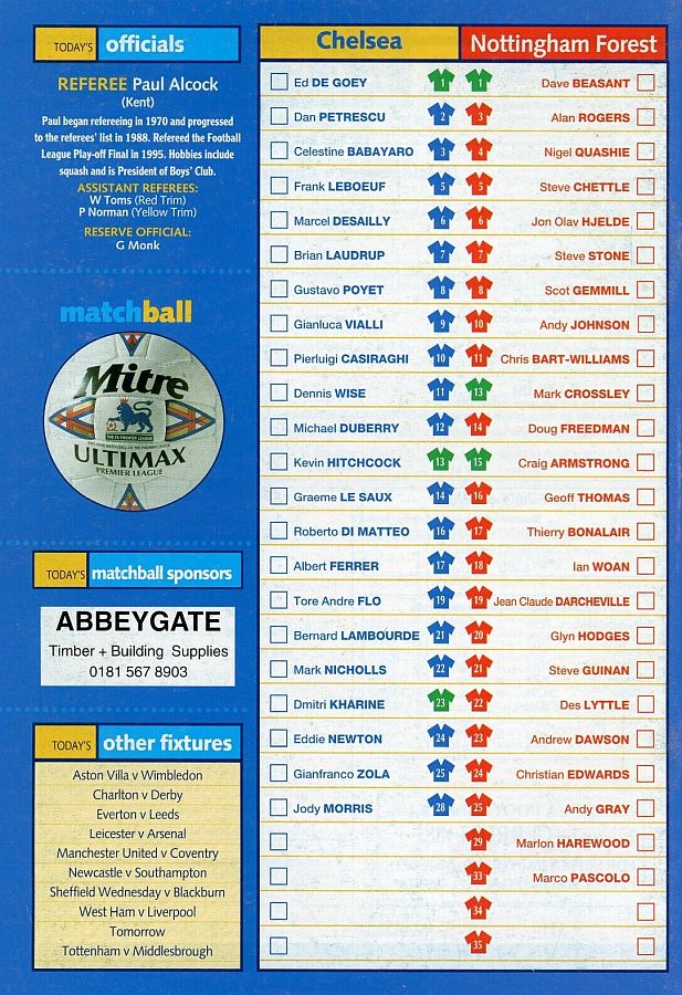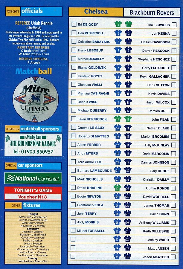1 Eduard De Goey, 2 Dan Petrescu (16 Roberto DiMatteo 46), 6 Marcel Desailly, 8 Gus Poyet (28 Jody Morris 59), 11 Dennis Wise, 12 Michael Duberry, 14 Graeme Le Saux, 17 Albert Ferrer, 19 Tore Andre Flo, 25 Gianfranco Zola, 7 Bjarne Goldbaek |