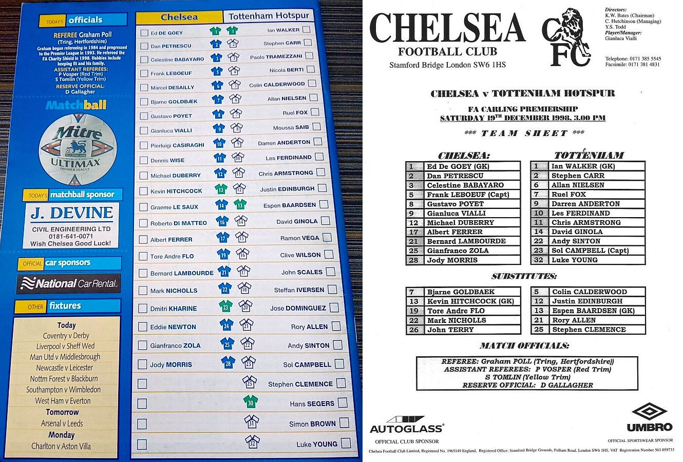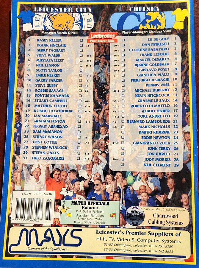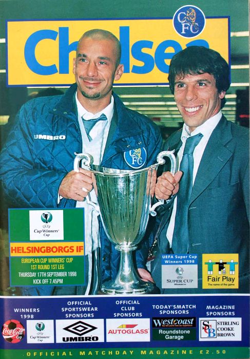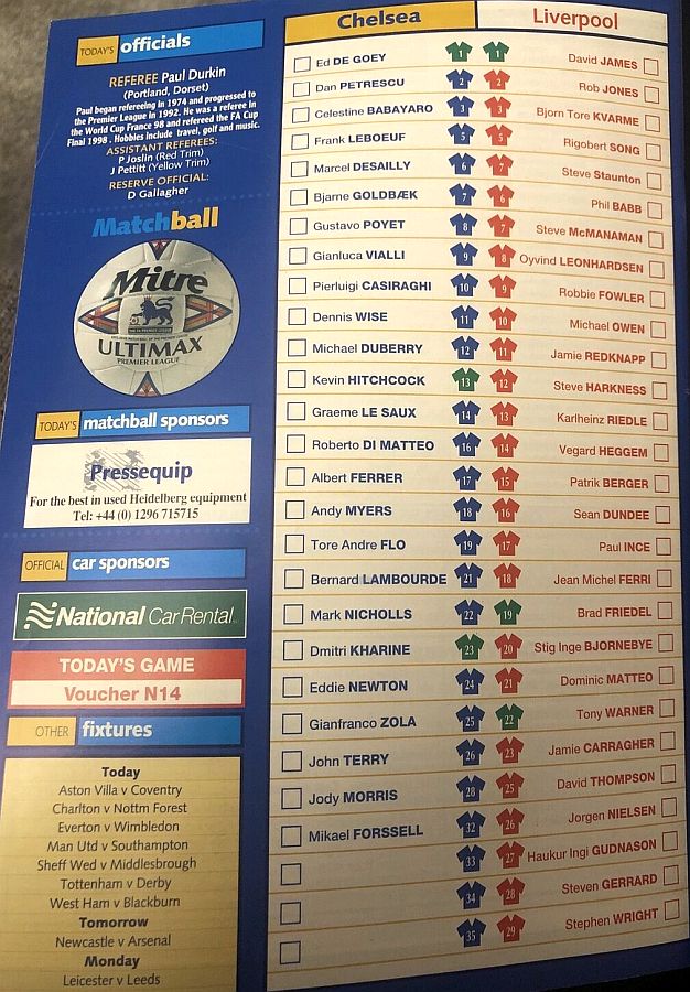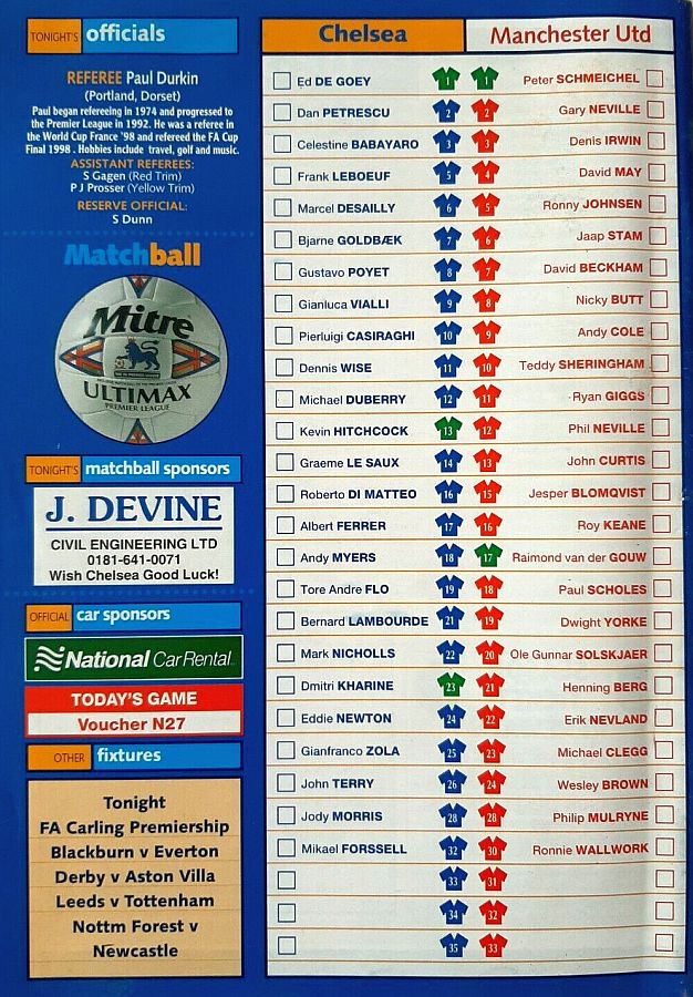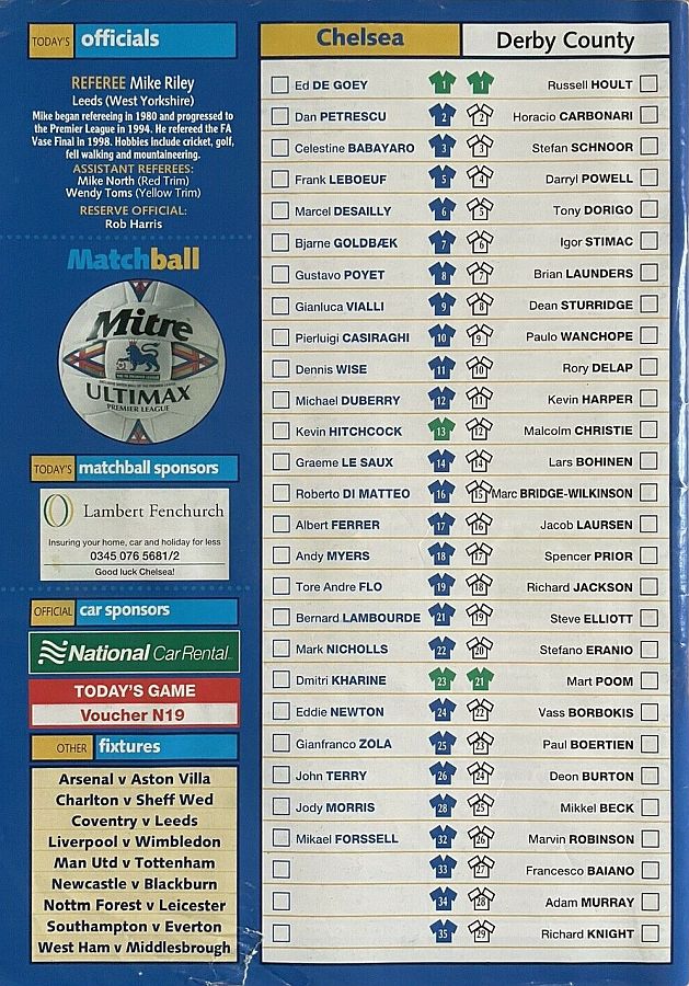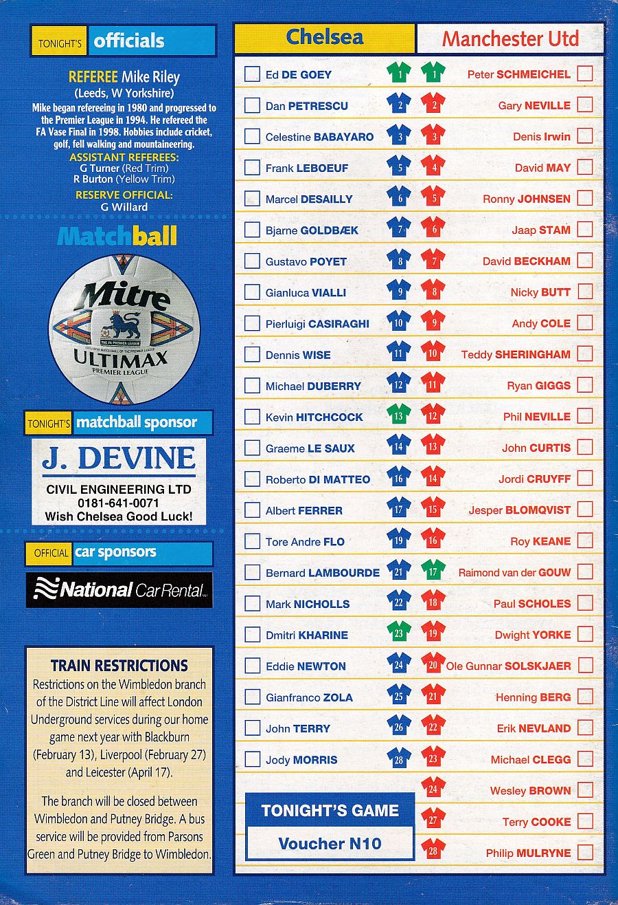 1 Eduard De Goey, 2 Dan Petrescu (16 Roberto DiMatteo 46), 6 Marcel Desailly, 8 Gus Poyet (28 Jody Morris 59), 11 Dennis Wise, 12 Michael Duberry, 14 Graeme Le Saux, 17 Albert Ferrer, 19 Tore Andre Flo, 25 Gianfranco Zola, 7 Bjarne Goldbaek |