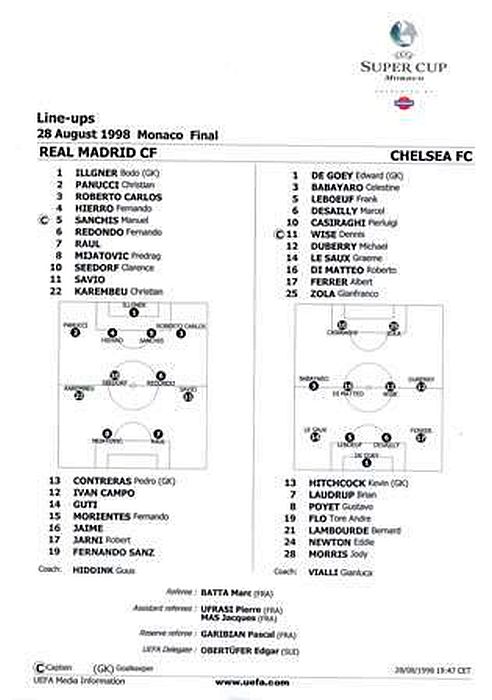 Bodo Illgner, Christian Panucci, Roberto Carlos, Fernando Hierro, Manolo Sanchis, Fernando Redondo, Raul, Pedrag Mijatovic (Robert Jarni 73), Clarence Seedorf, Savio, Christian Karembeu (Fernando Morientes 57) |