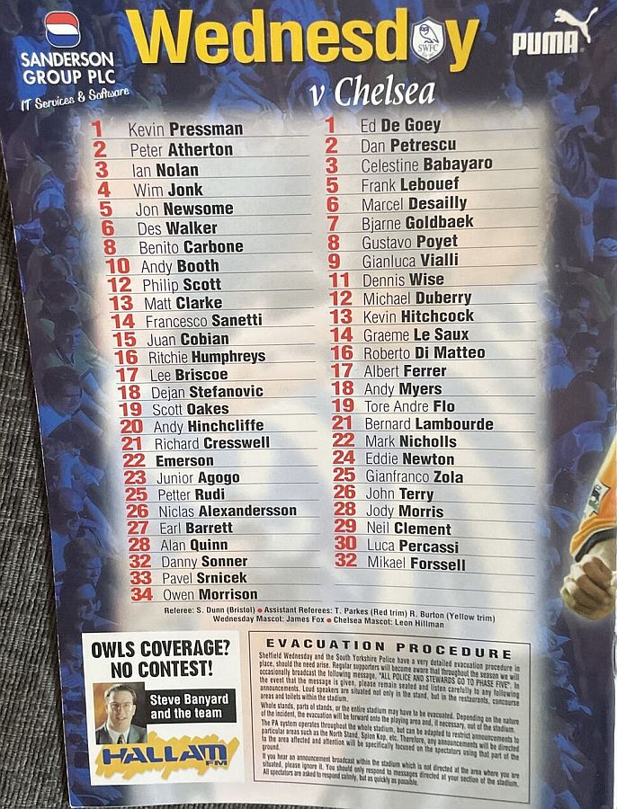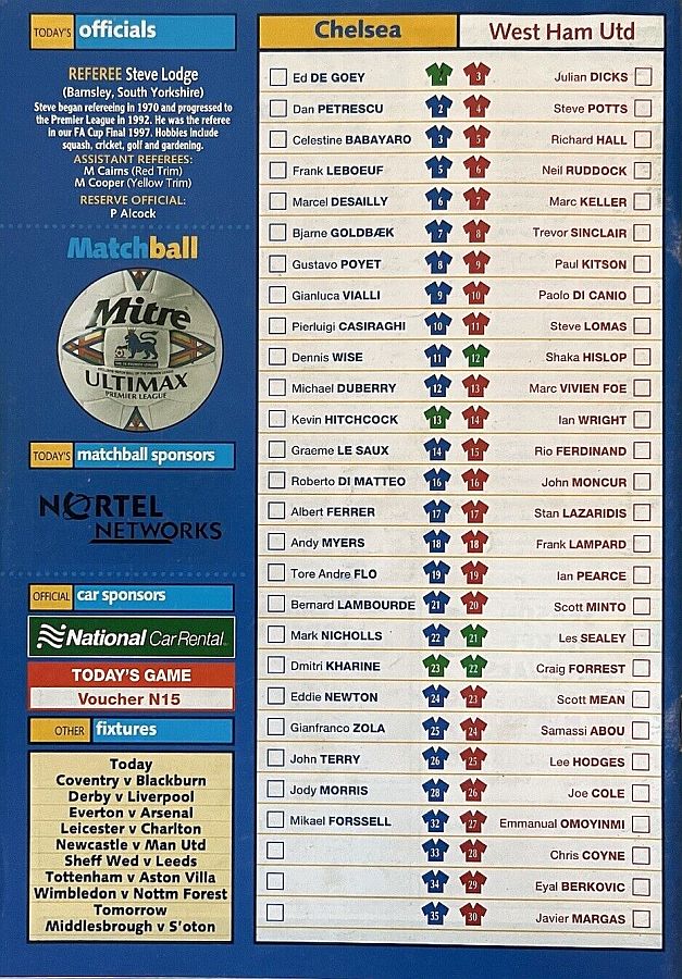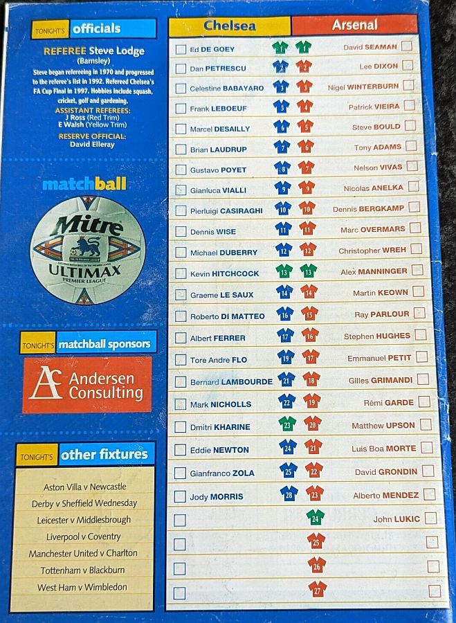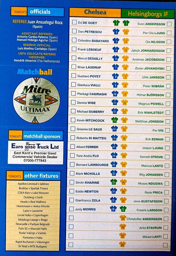1 Eduard De Goey, 2 Dan Petrescu ( 7 Bjarne Goldbaek 60), 5 Frank Leboeuf (21 Bernard Lambourde 71), 6 Marcel Desailly, 8 Gus Poyet, 11 Dennis Wise, 14 Graeme Le Saux, 17 Albert Ferrer, 25 Gianfranco Zola, 28 Jody Morris ( 3 Celestine Babayaro 82), 32 Mikael Forssell |
